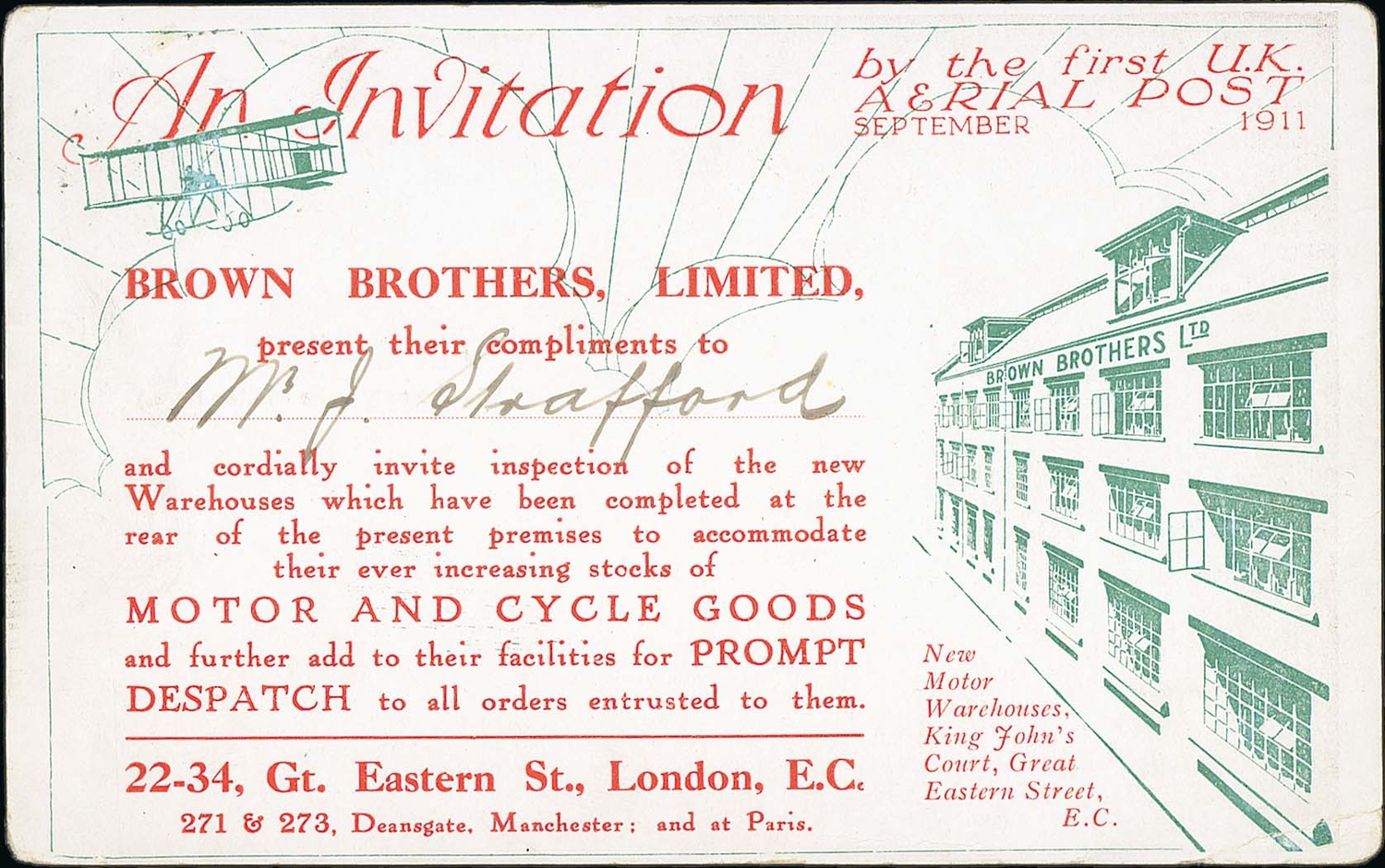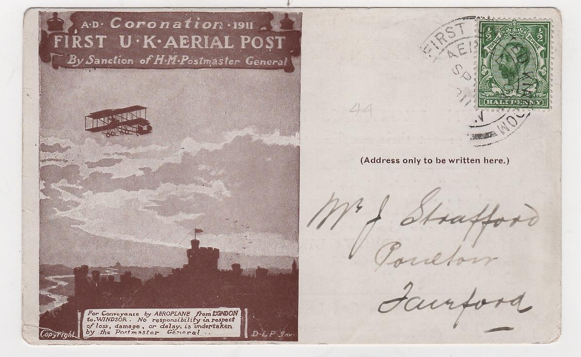 1911 (Sep 9?) Brown London postcard with Brown Brothers advert printed on the reverse, used with Aerial Post c.d.s, small corner crease, otherwise fine, an uncommon advert. Photo on Page 12.