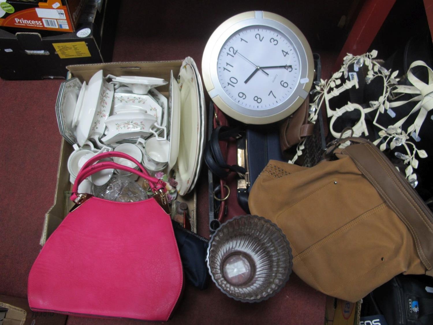 Johnson Bros Dinnerware, ornaments ladies handbags, kitchen wall clock, etc:- Two Boxes.