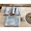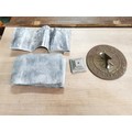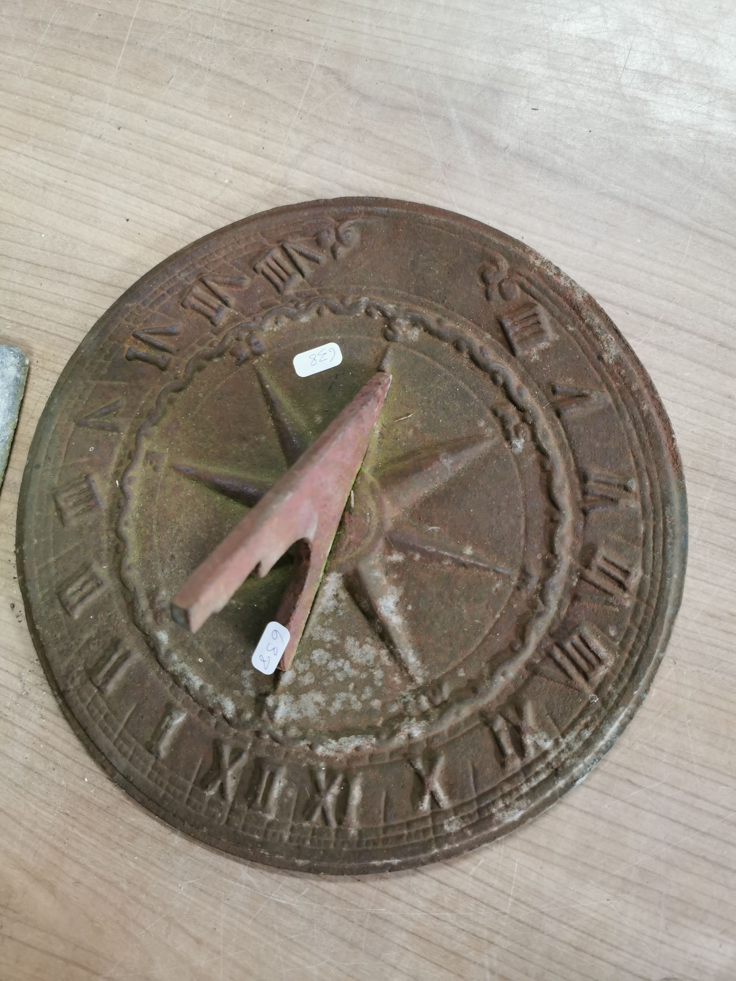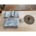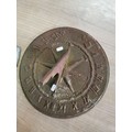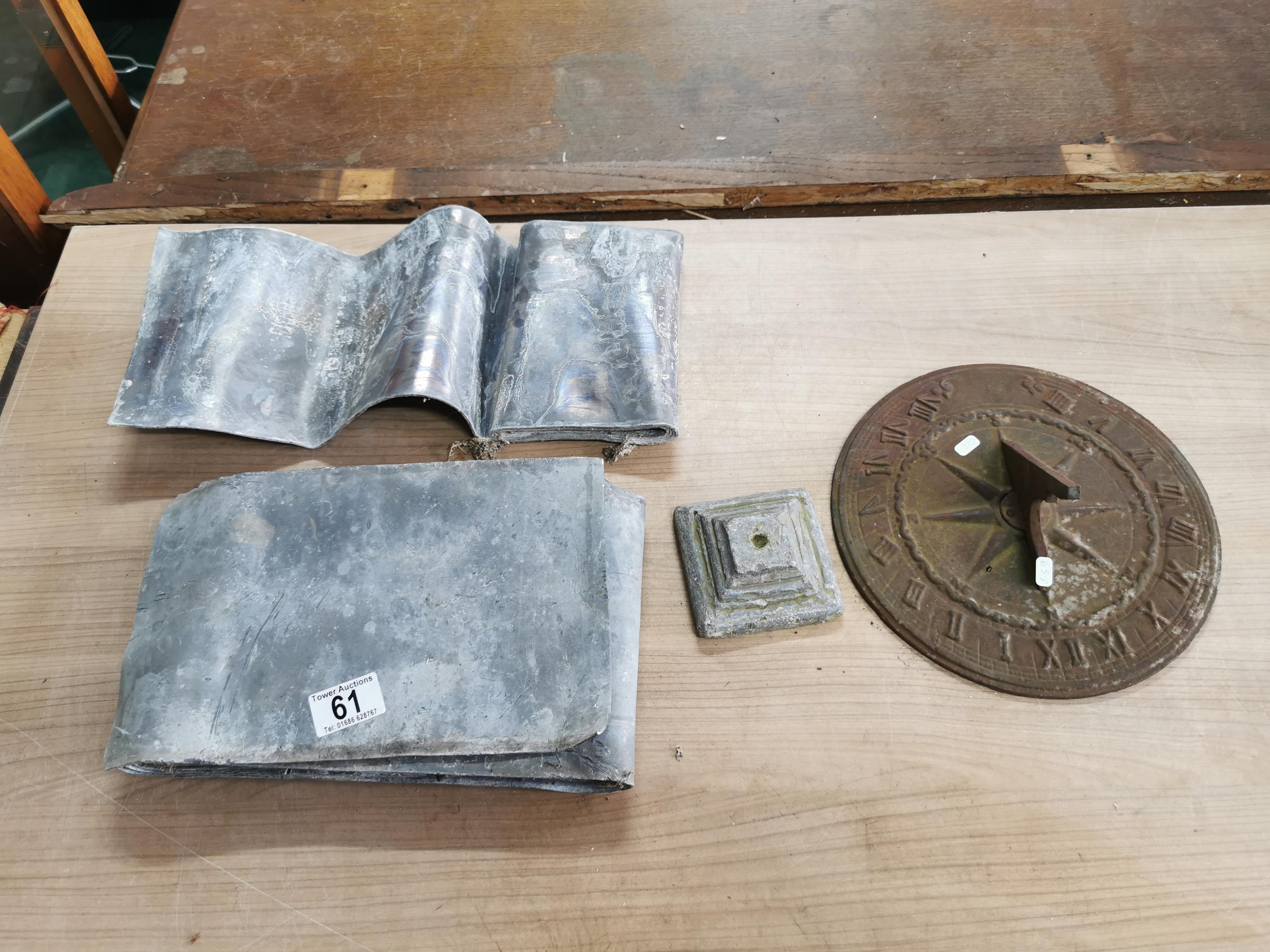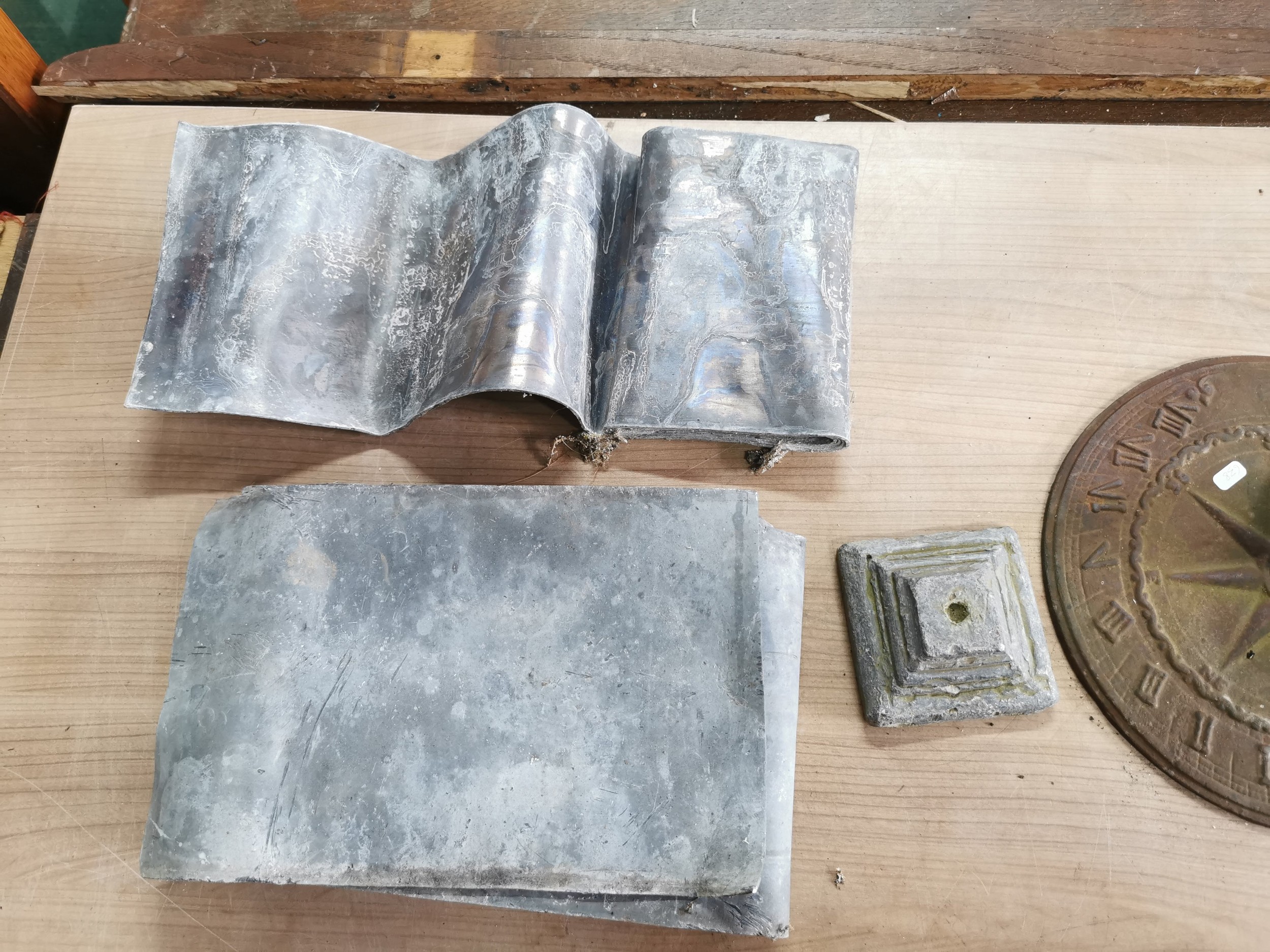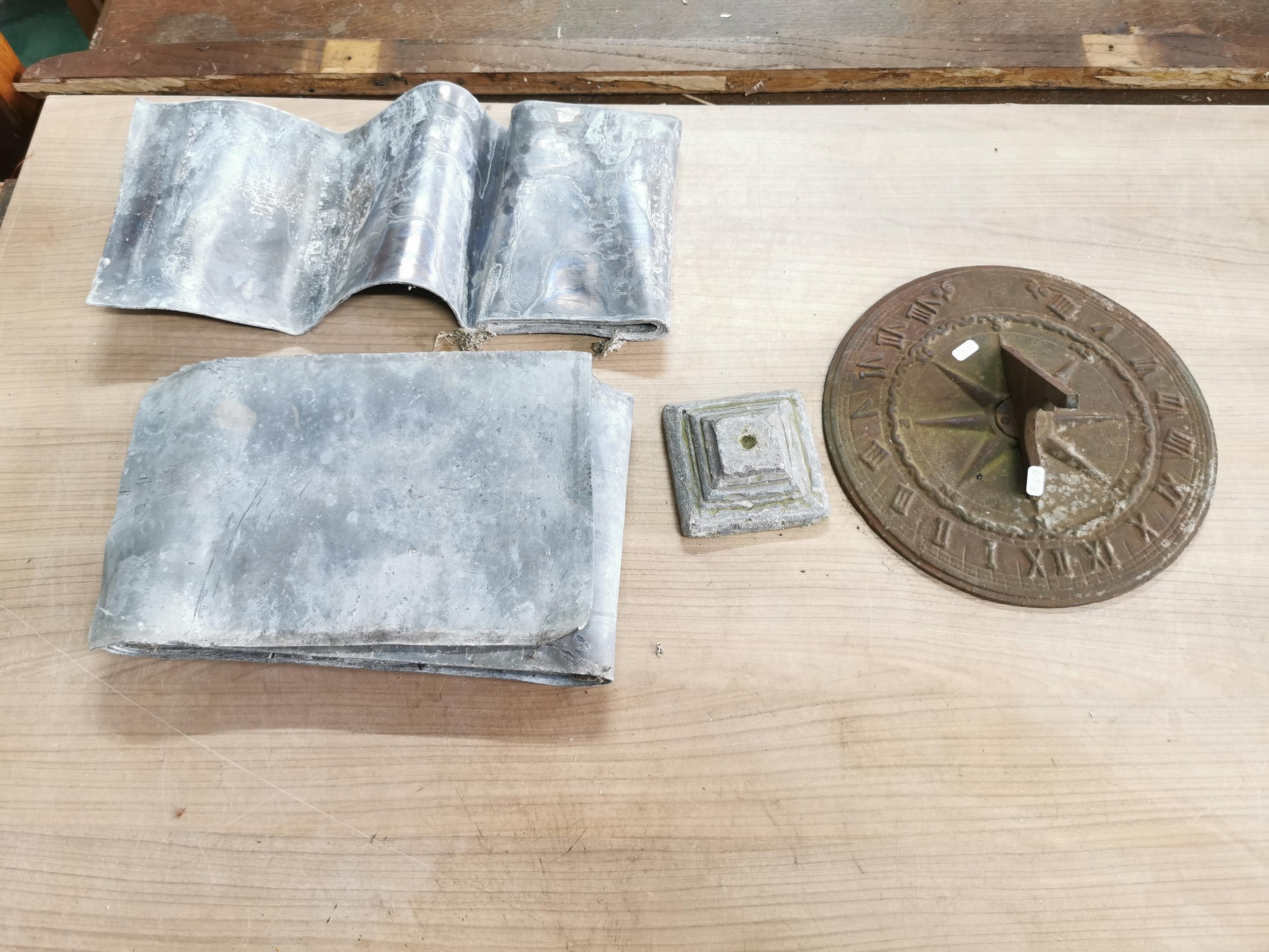 Collection of lead sheets folded up along with a brass sundial, sundial has a diameter of 28cm