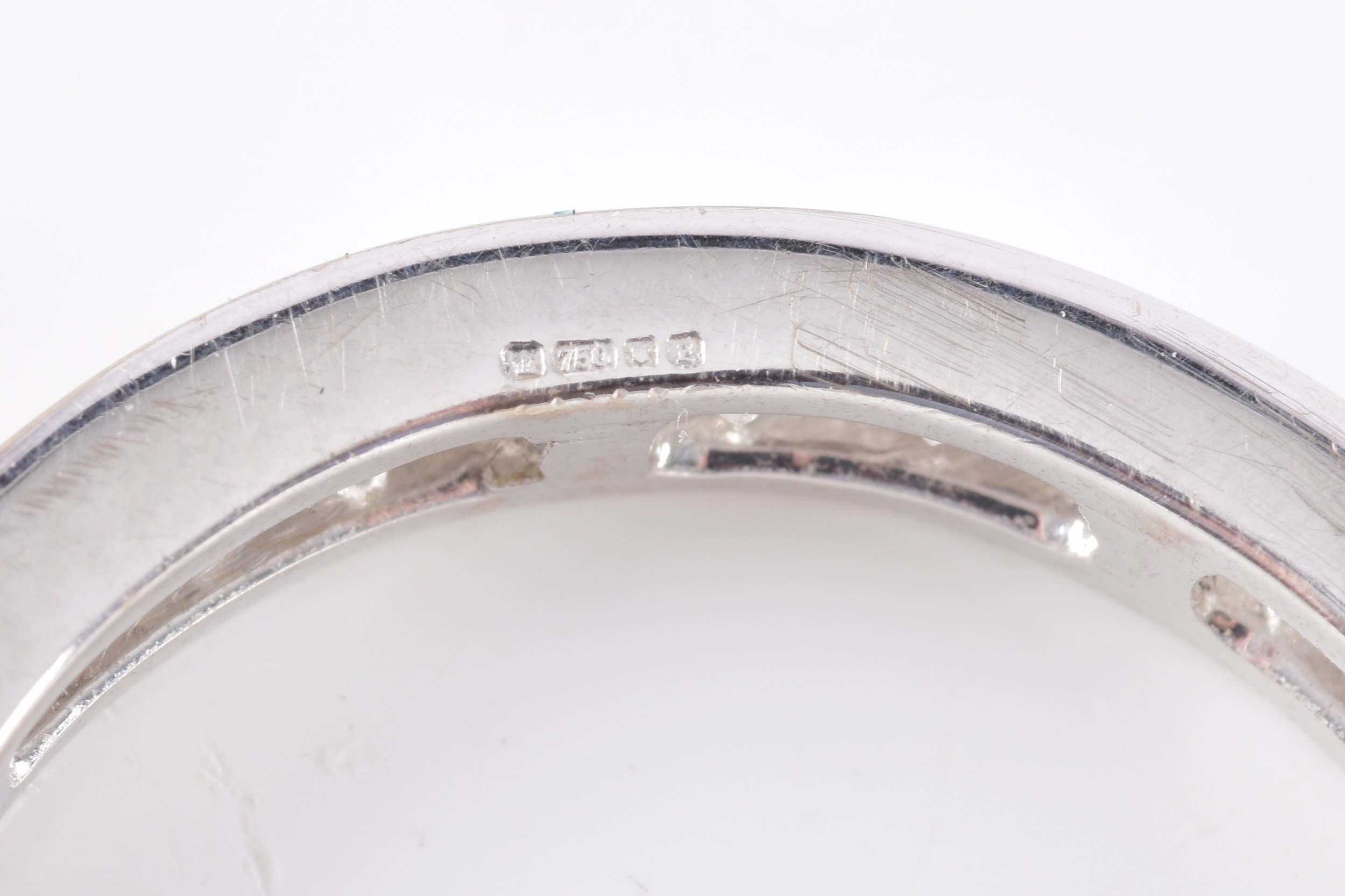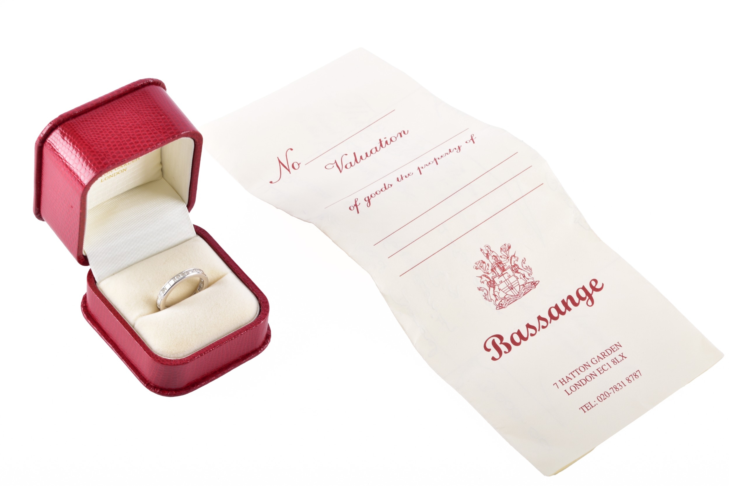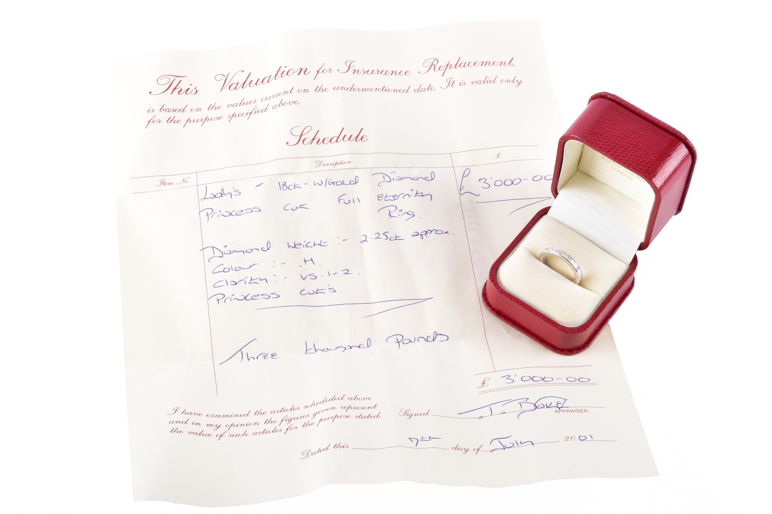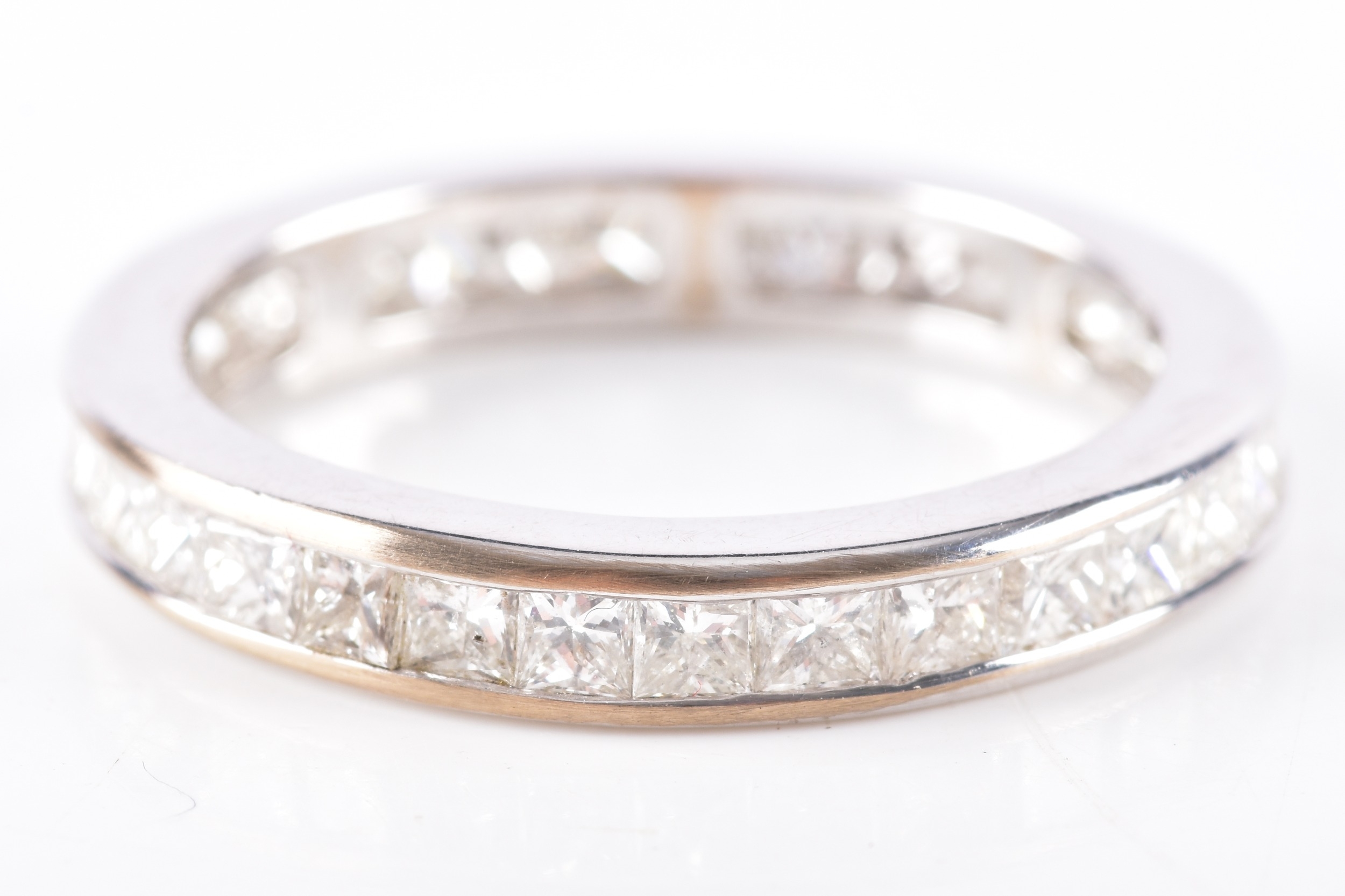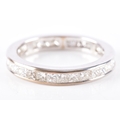 An 18ct white gold diamond full eternity ring, featuring princess cut diamonds with an approximate combined weight of 2.25 carats, approximately H colour, VS1-2 clarity, in channel settings, size L, accompanied by original 2001 receipt and valuation for insurance, in original presentation box and outer box.