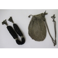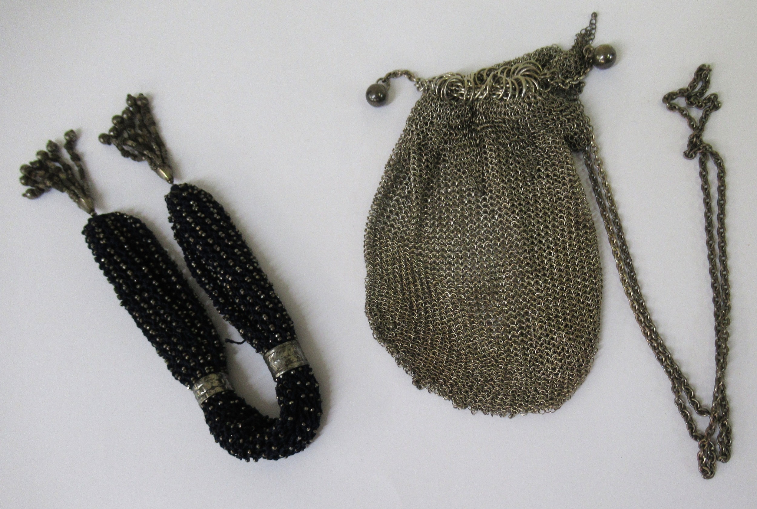 Ladies white metal chain link evening purse, together with a 1920s cloth and cut steel mounted miser's purse