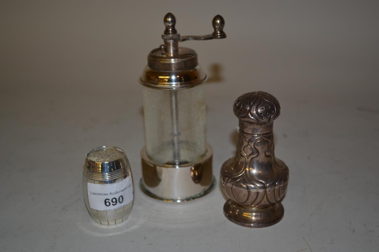 Victorian London silver pepper in the form of a barrel, Birmingham silver Art Nouveau style pedestal pepper and a white metal grinder (at fault)