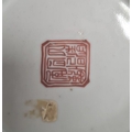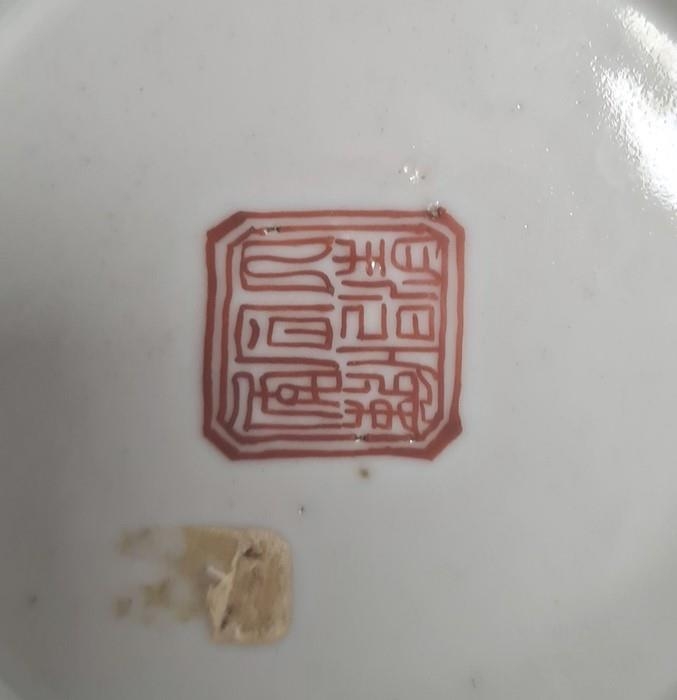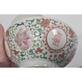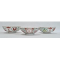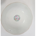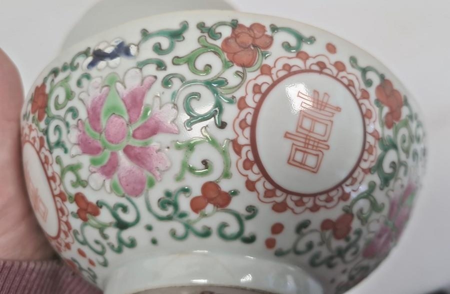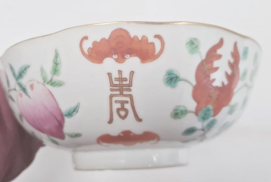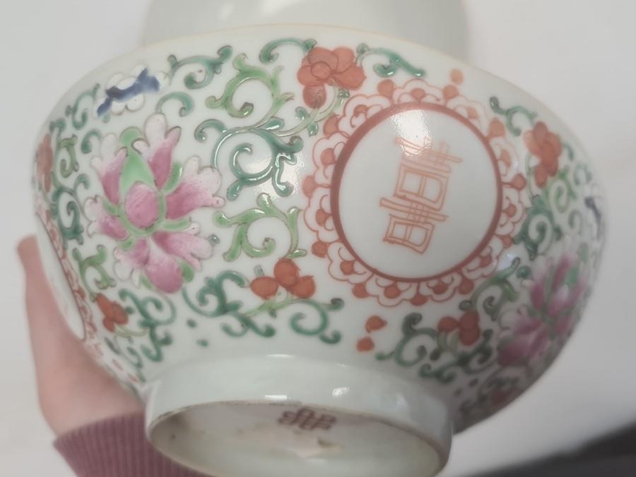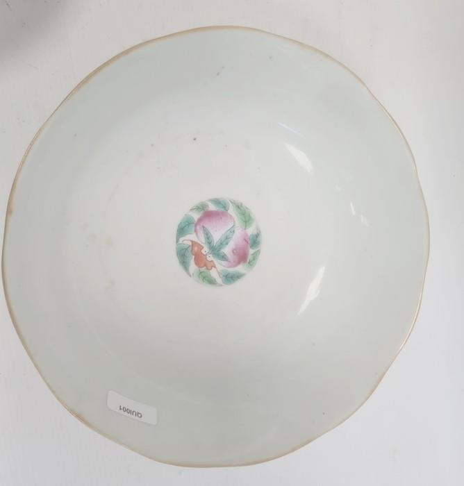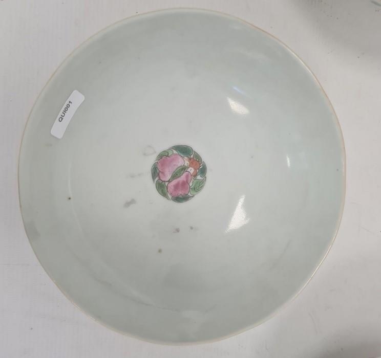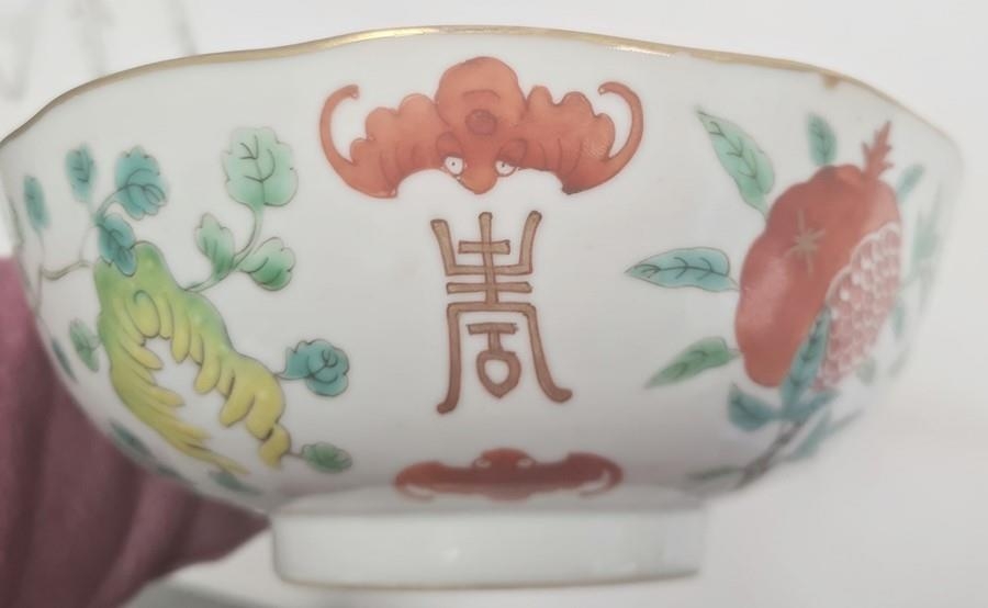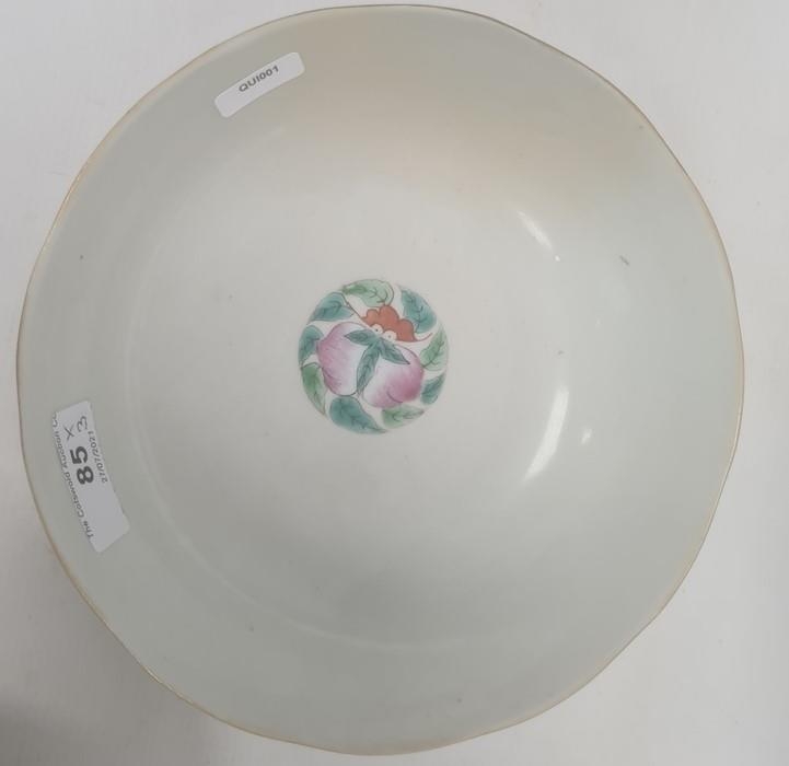 Pair of Chinese bowls, the exteriors with enamelled decoration of fruit, bats and character marks, red character mark to bases, 19cm diameter and another Chinese bowl with enamelled floral and scrolling decoration (3)