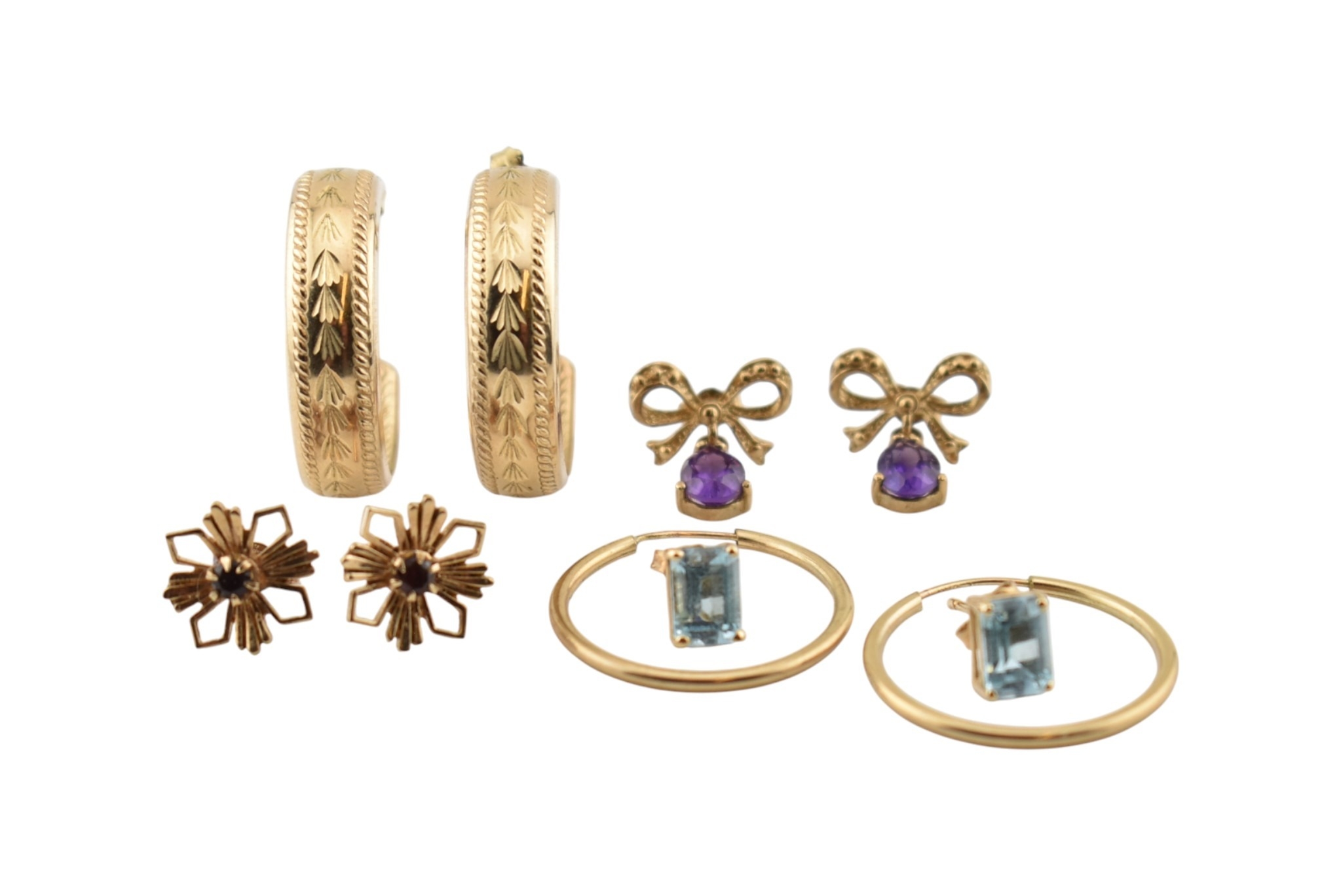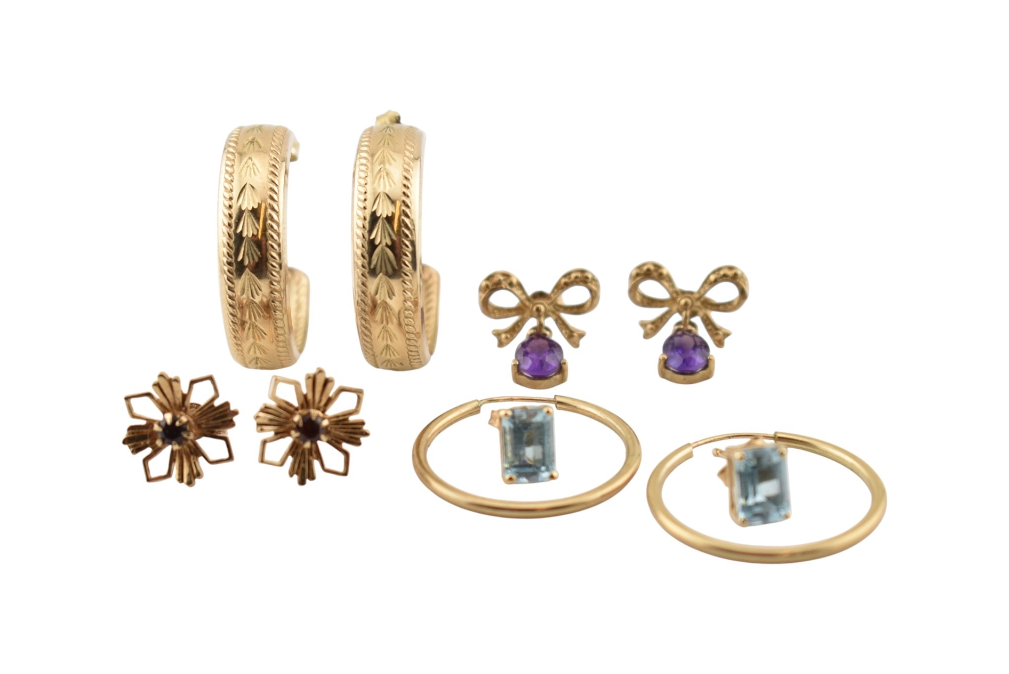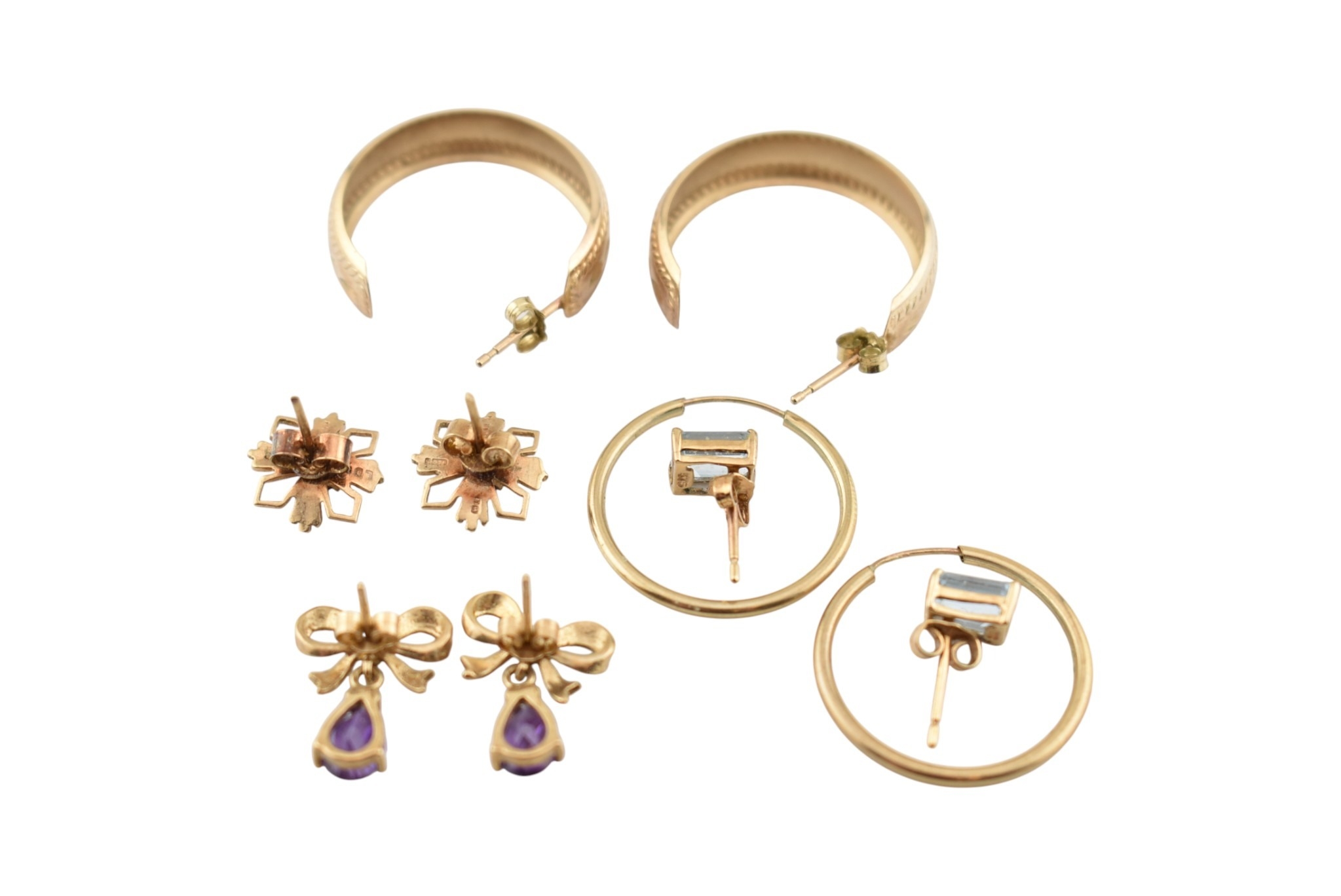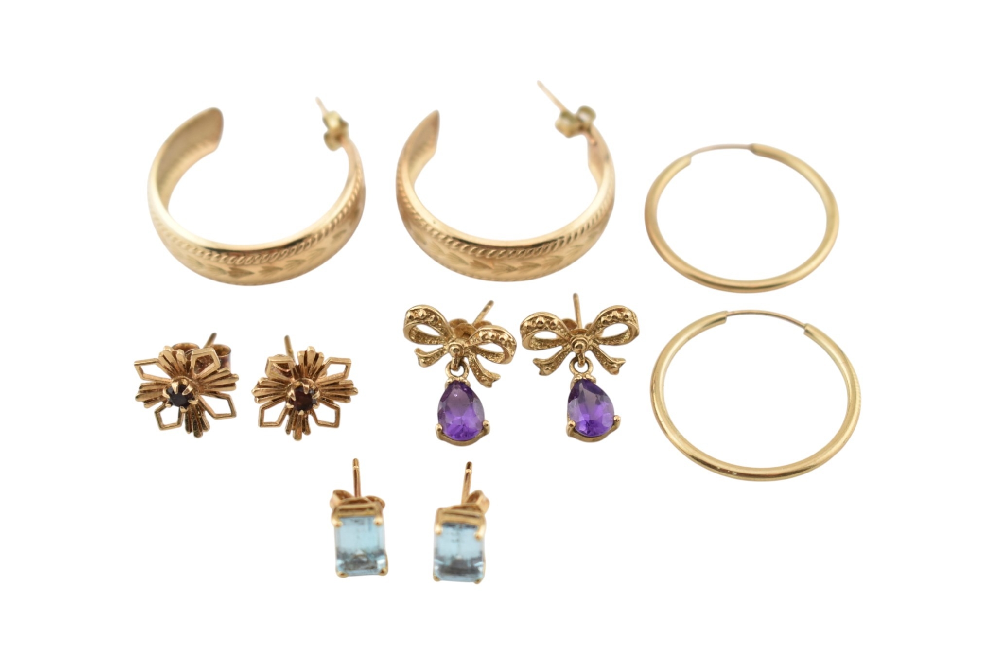 A collection of 9ct gold and gem set earrings. The earrings to include hoops, amethyst, bow pendant and blue stone examples. Weight 6.4g