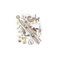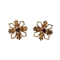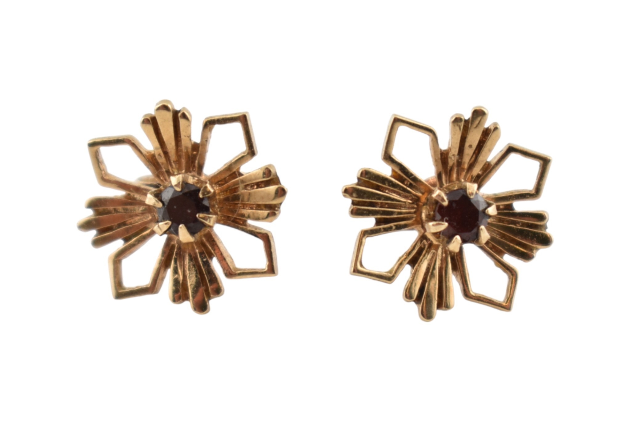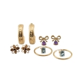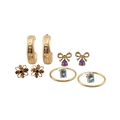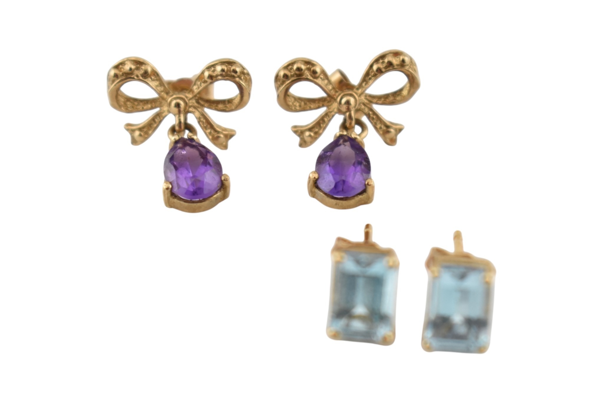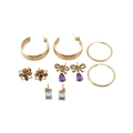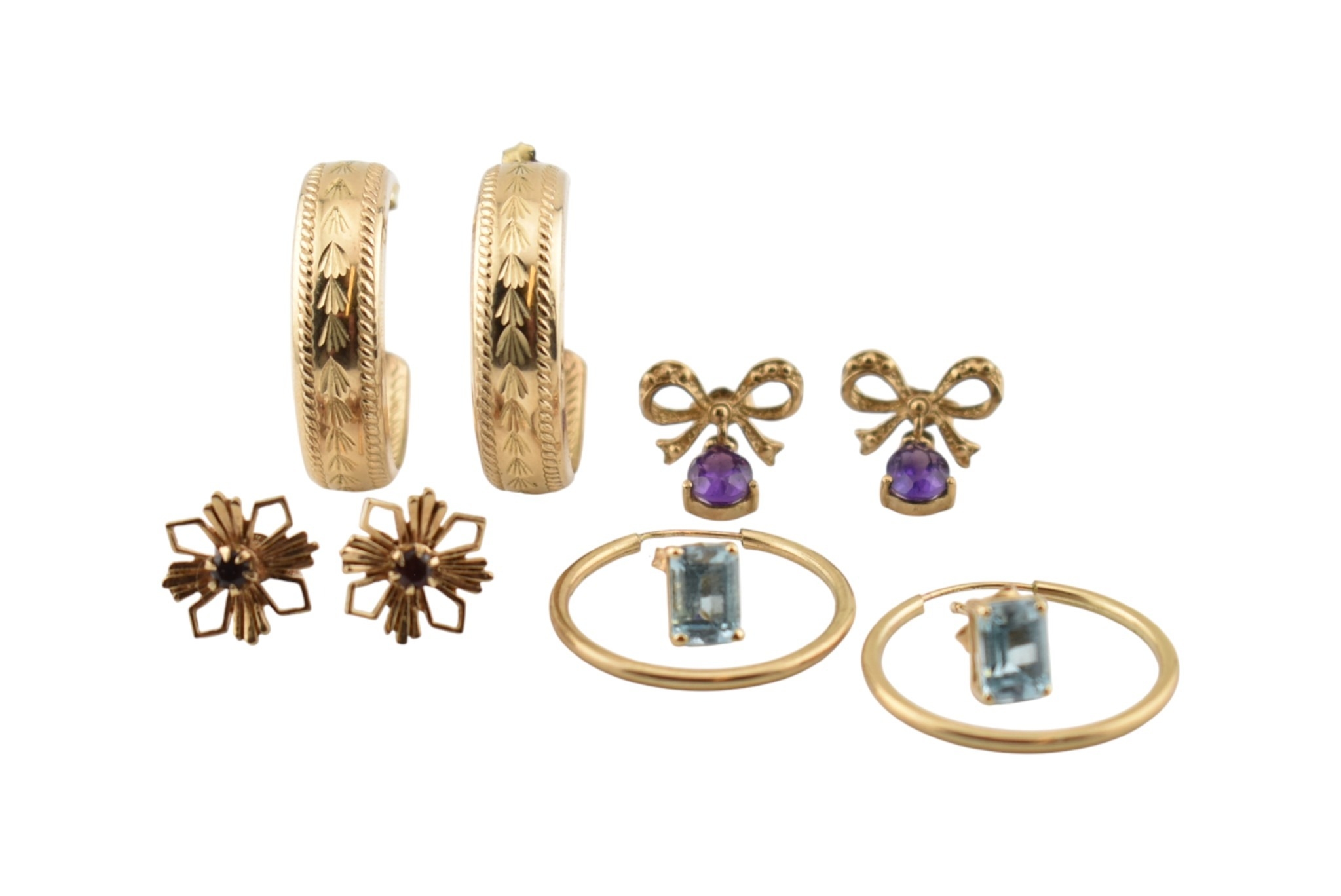 A collection of 9ct gold and gem set earrings. The earrings to include hoops, amethyst, bow pendant and blue stone examples. Weight 6.4g