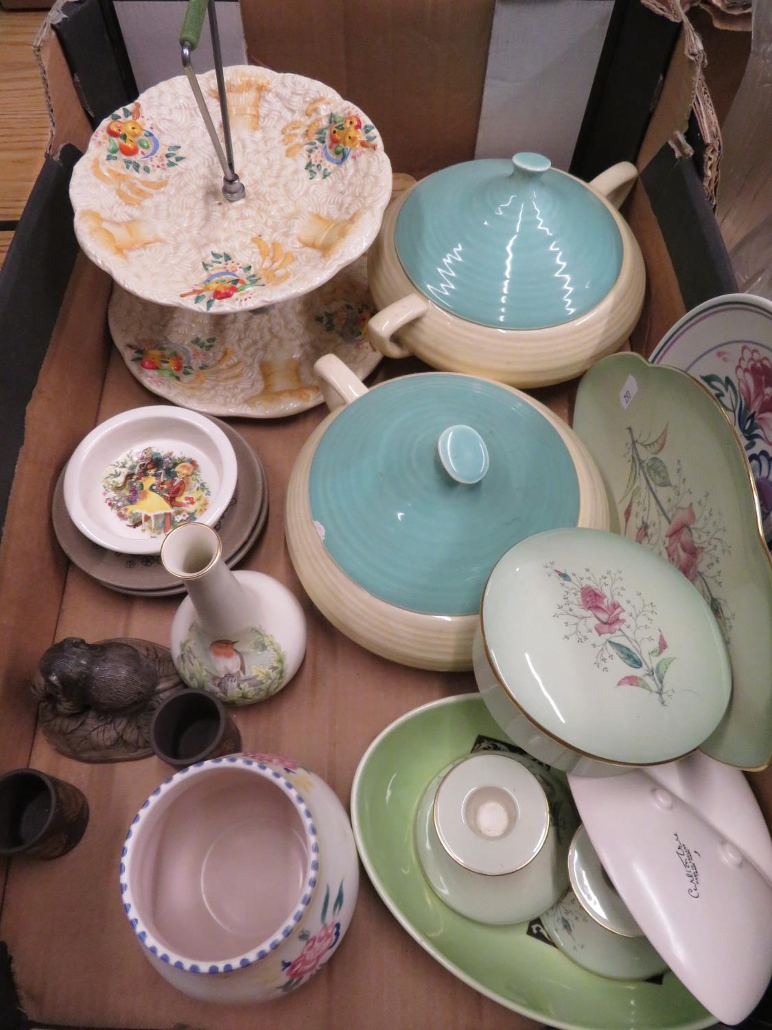Clarice Cliff Celtic harvest, two tier cake stand, two Clarice Cliff tureens, Poole, Carlton and Hornsea pottery etc