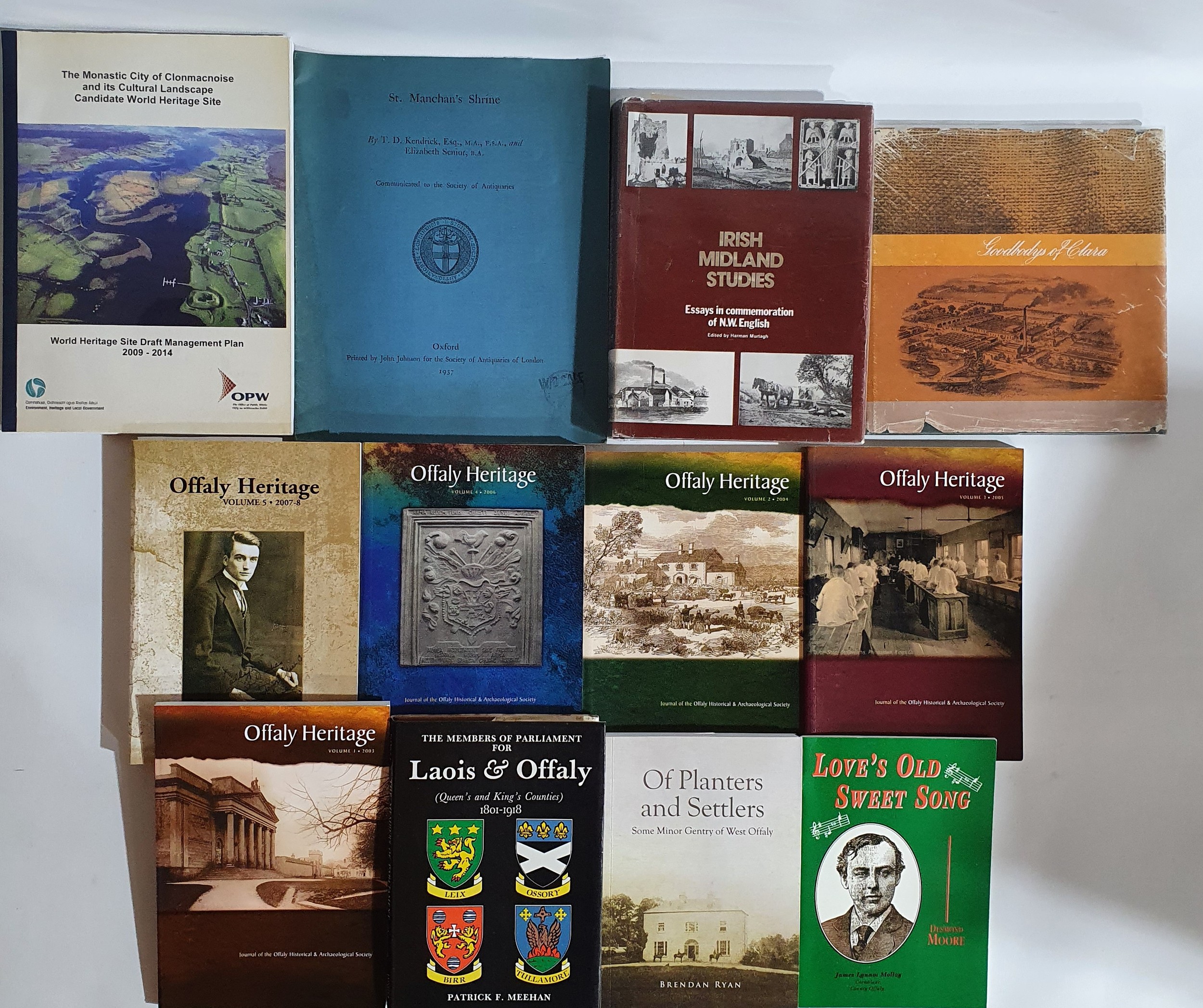 Offaly: St Manchan's Shrine by T D Kendrick and Elizabeth Senior, Oxford 1937; Offaly Heritage Journal Vol 1-5; Goodbodys of Clara 1865-1965 plus 5 others (12)