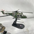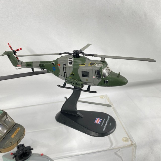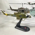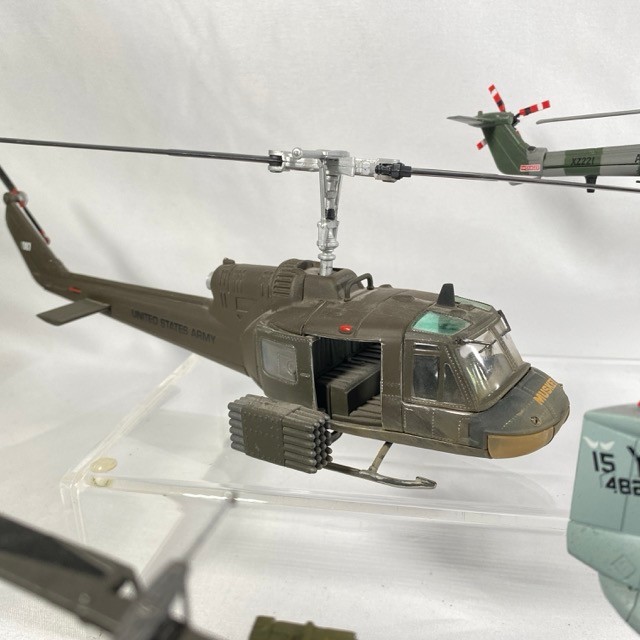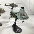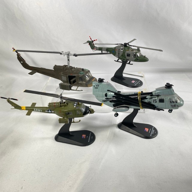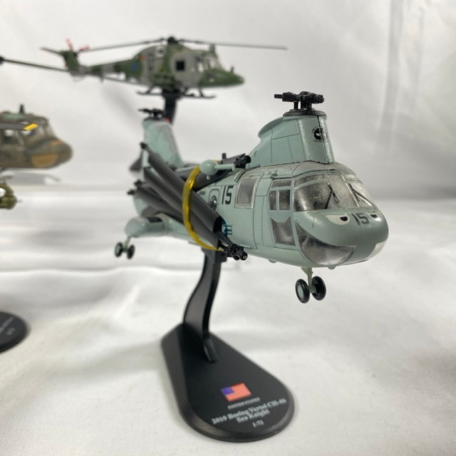 Four military helicopters, Corgi 50401 Bell 'Huey' UH-IC IRoquois 1:48 (missing rod on rotor), 2008 Westland Lynx AH7 Amercom 1:72 (one blade detached but included), 1963 Bell UH-1B Huey Amercom 1:72, 2010 Boeing Vertol CH-46 Sea Knight (two blades detached but included), dusty from display, no boxes - Helicopter Fair/Good (4) 800g