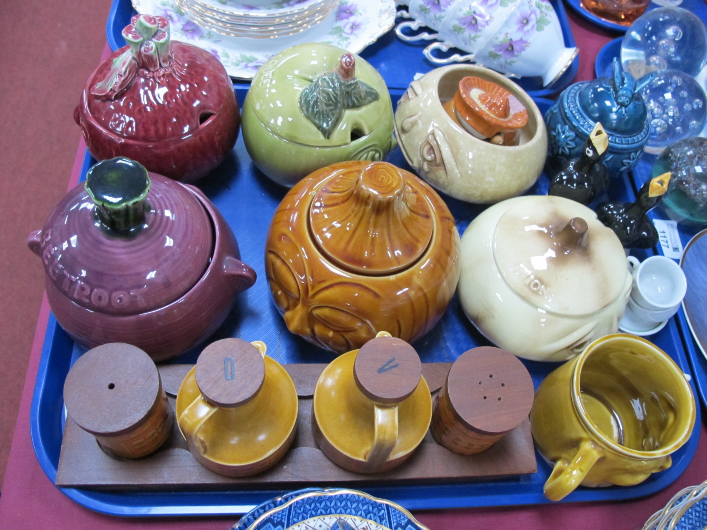 Sylvac and Other Kitchen Vases, Blackbird pie funnels, Hornsea Condiments set, etc (One Tray)