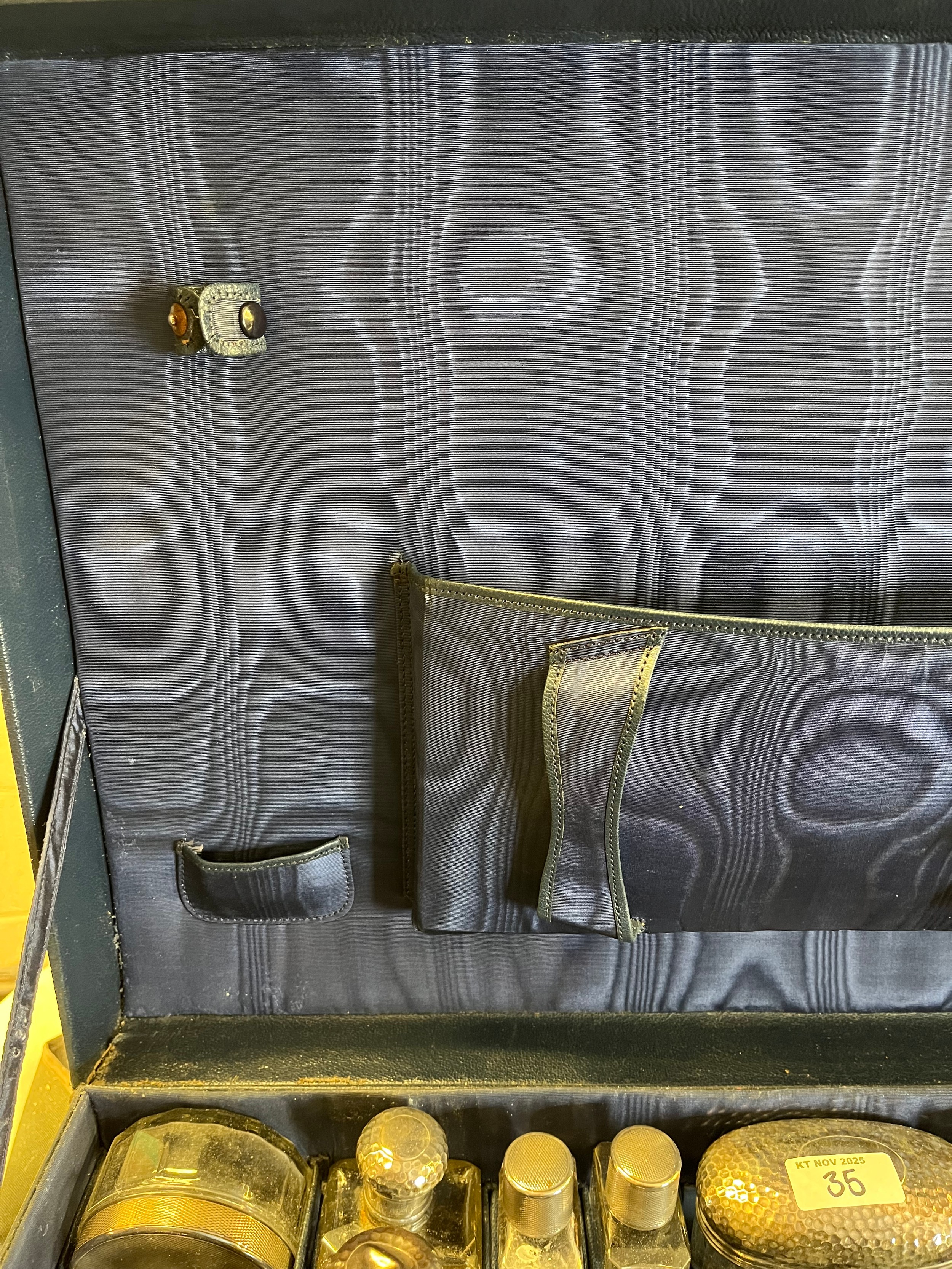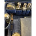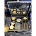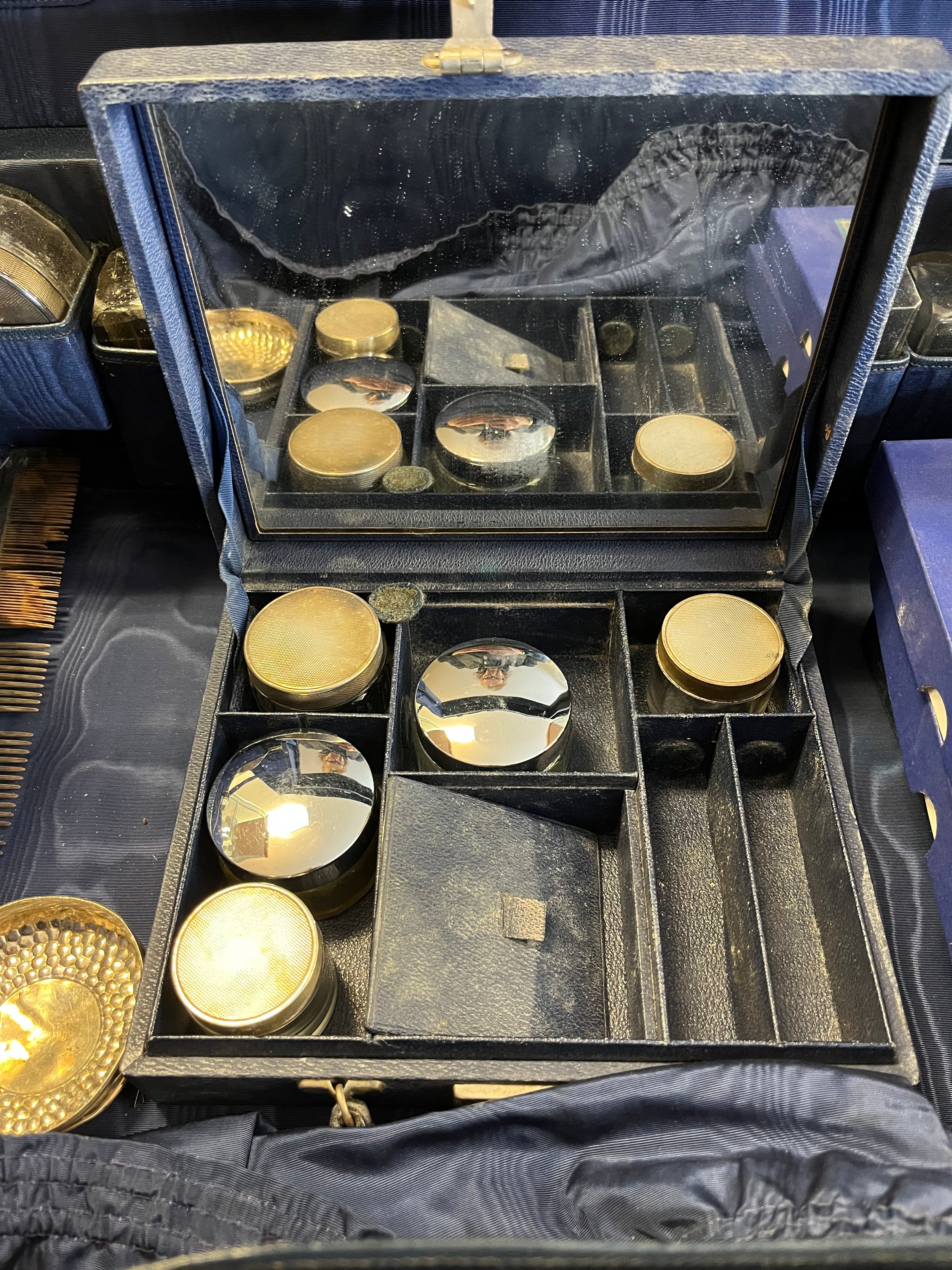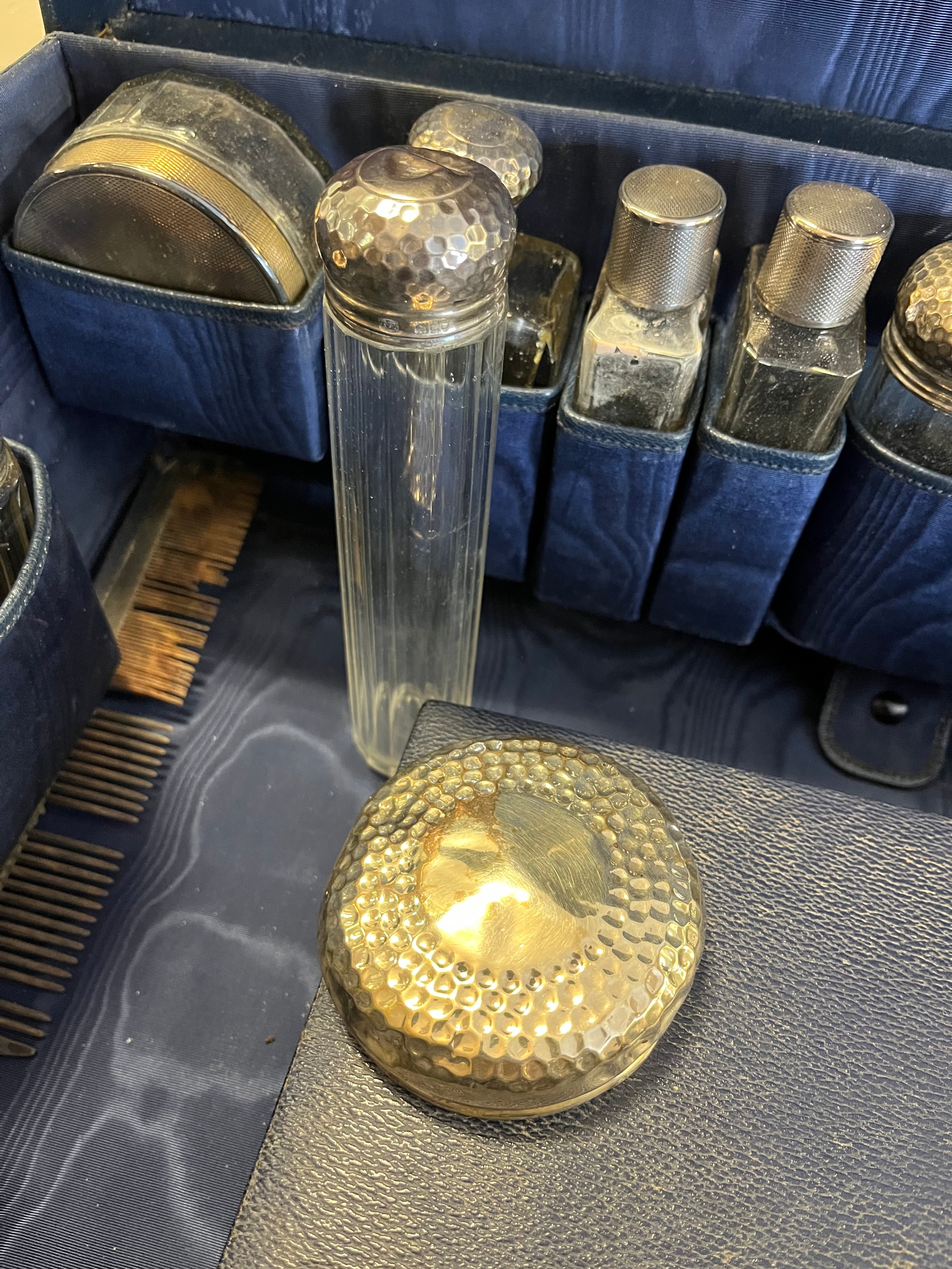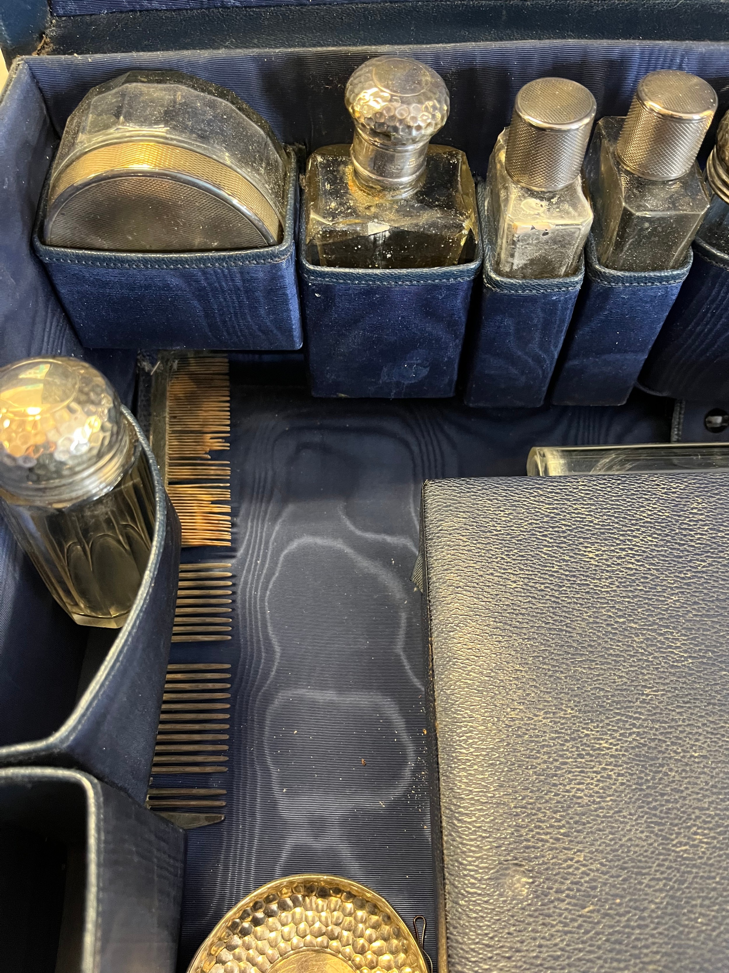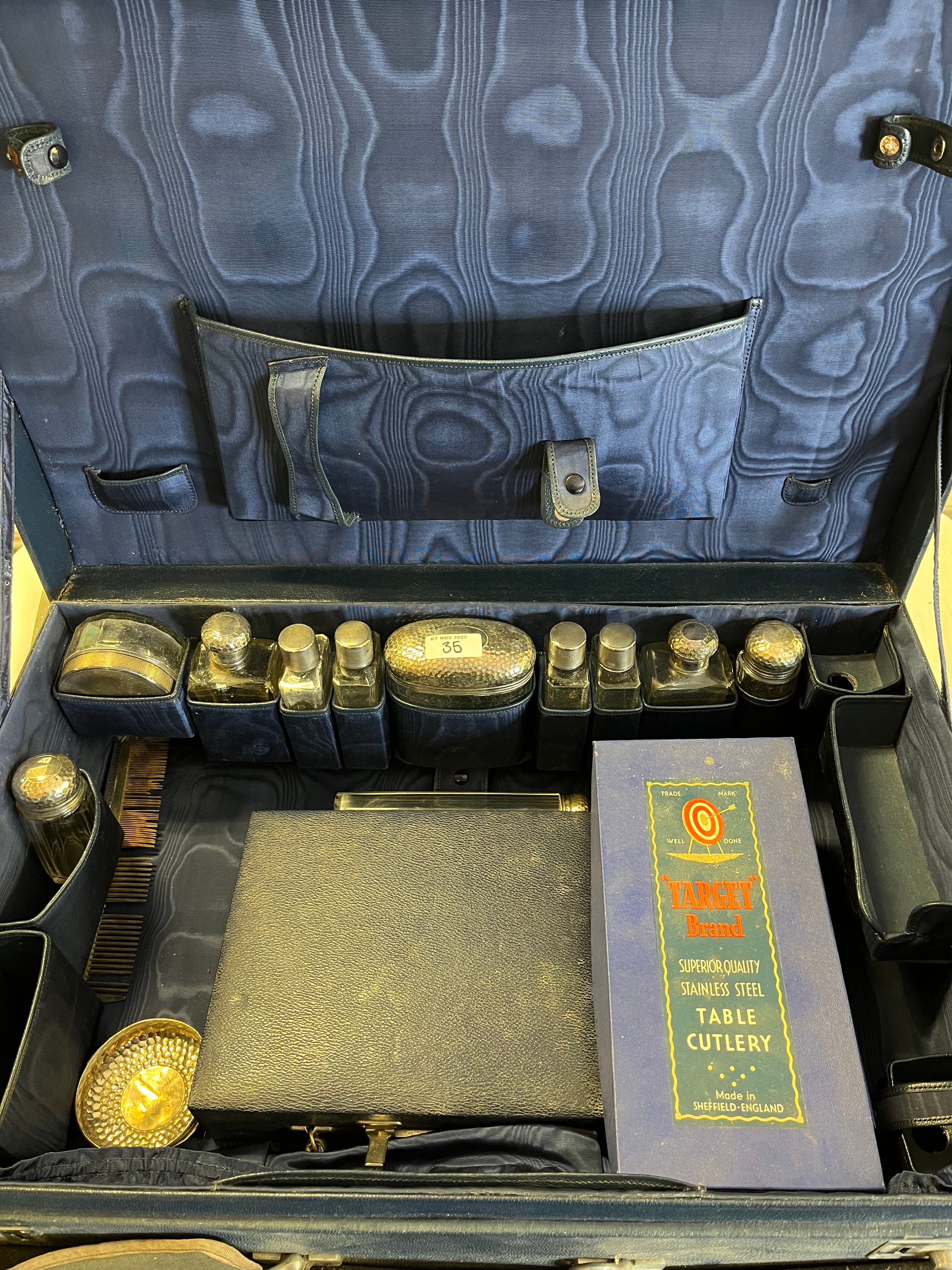 Large travel vanity suitcase with fitted interior and many silver and white metal topped items. Together with one matching smaller example