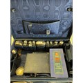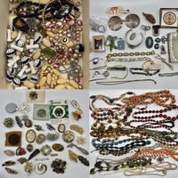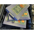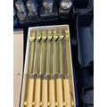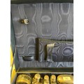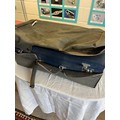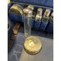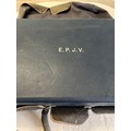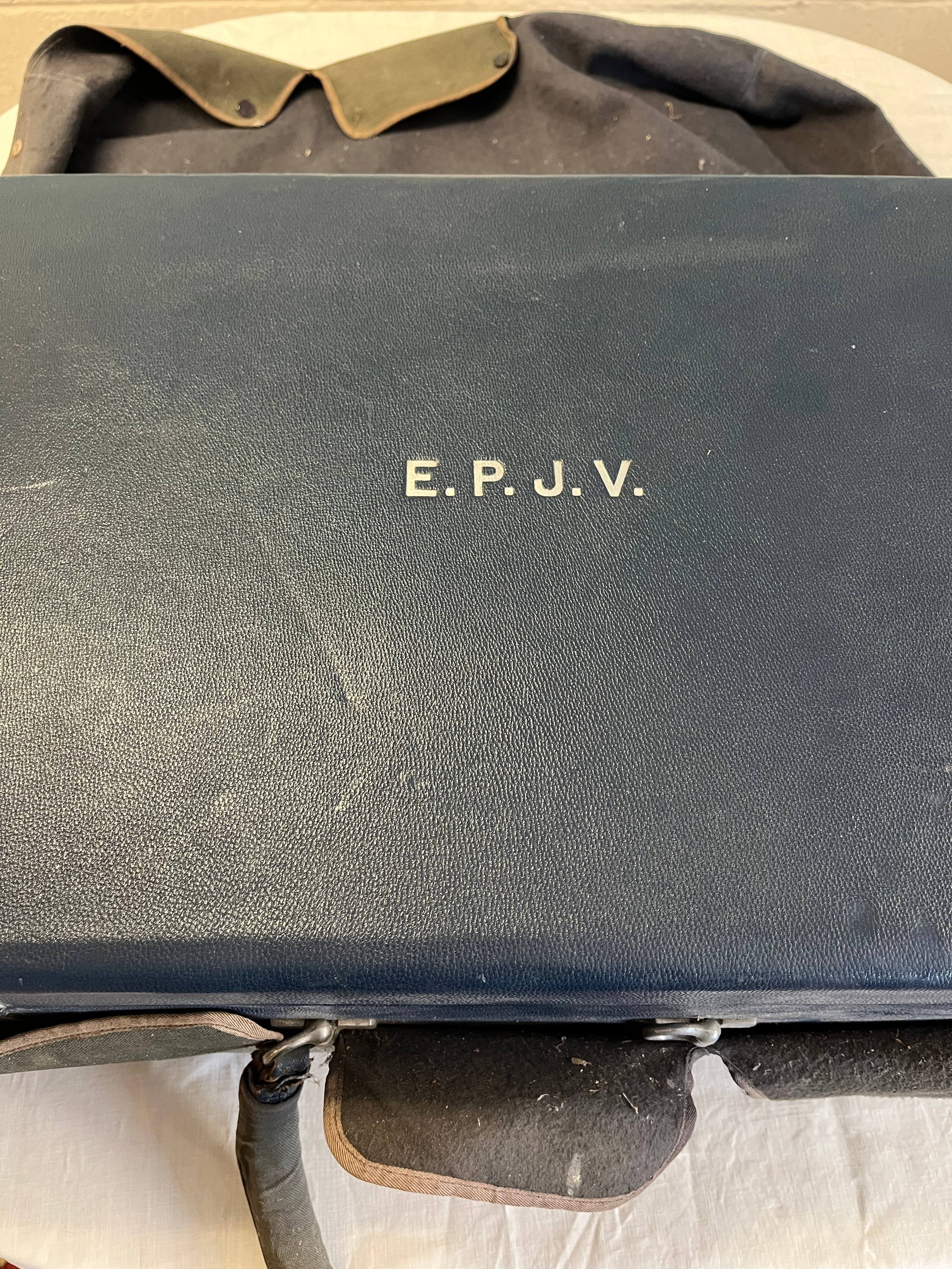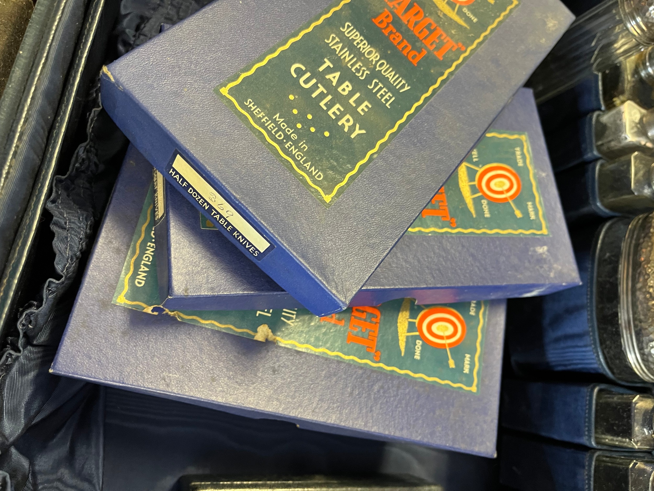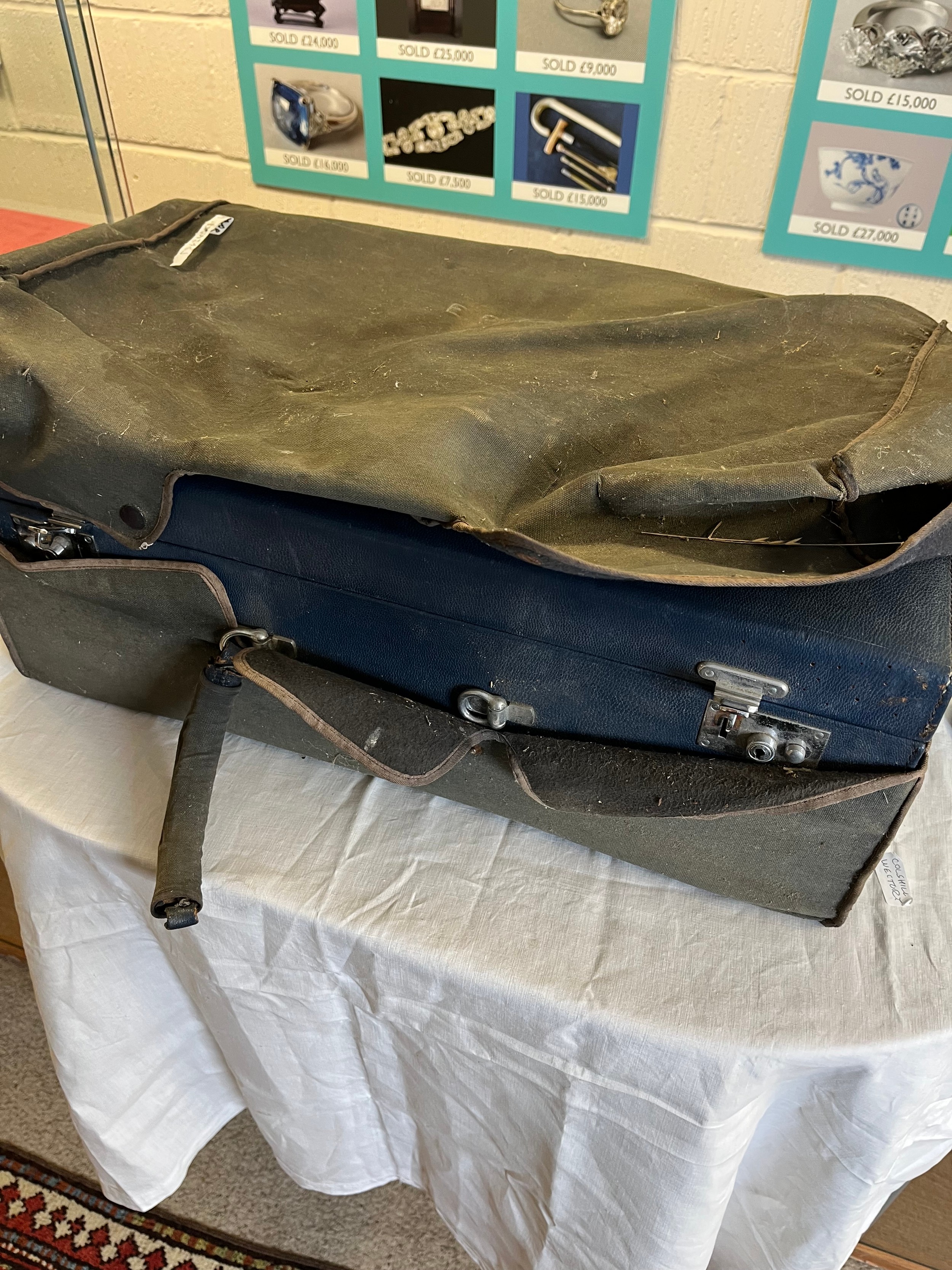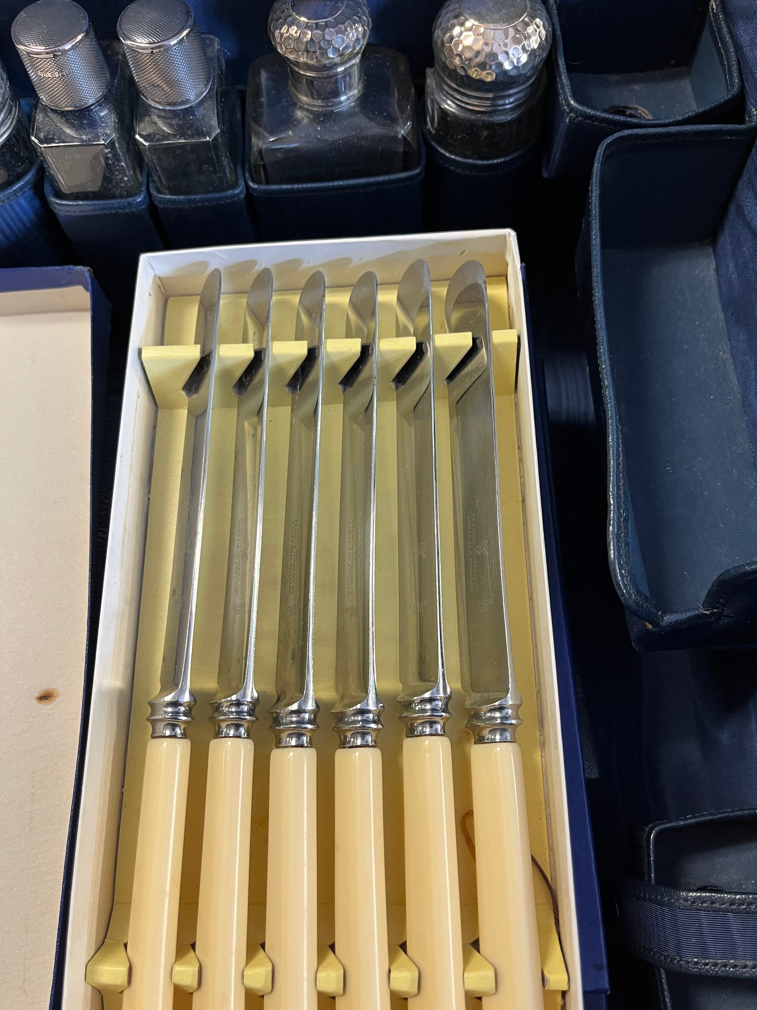 Large travel vanity suitcase with fitted interior and many silver and white metal topped items. Together with one matching smaller example