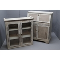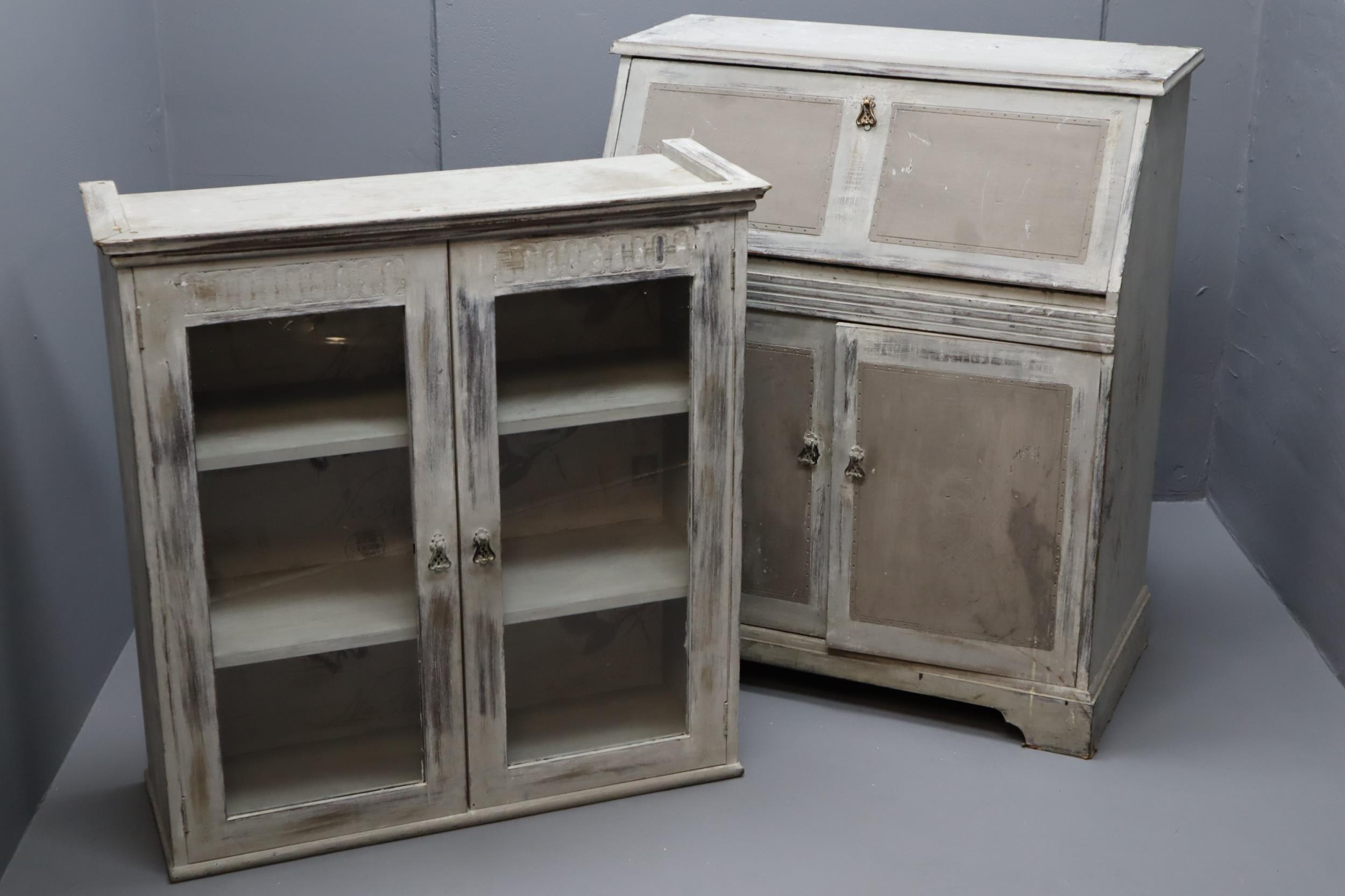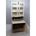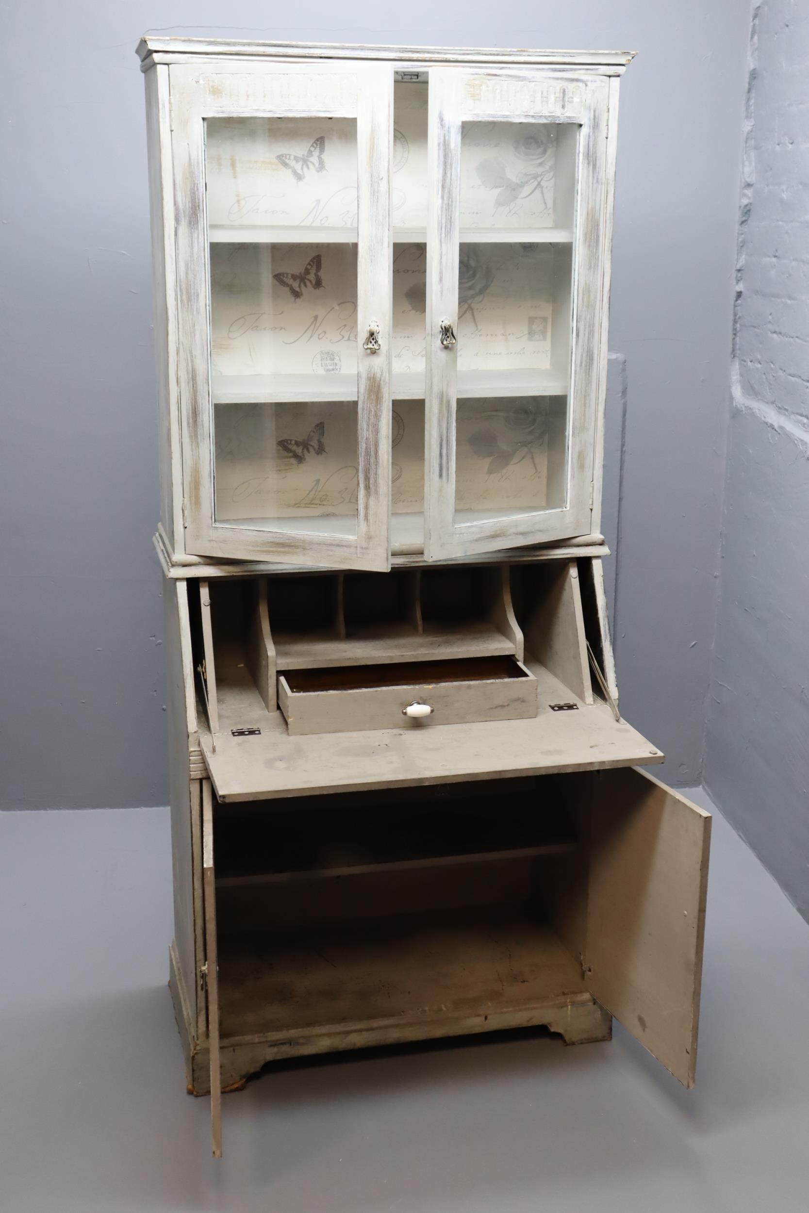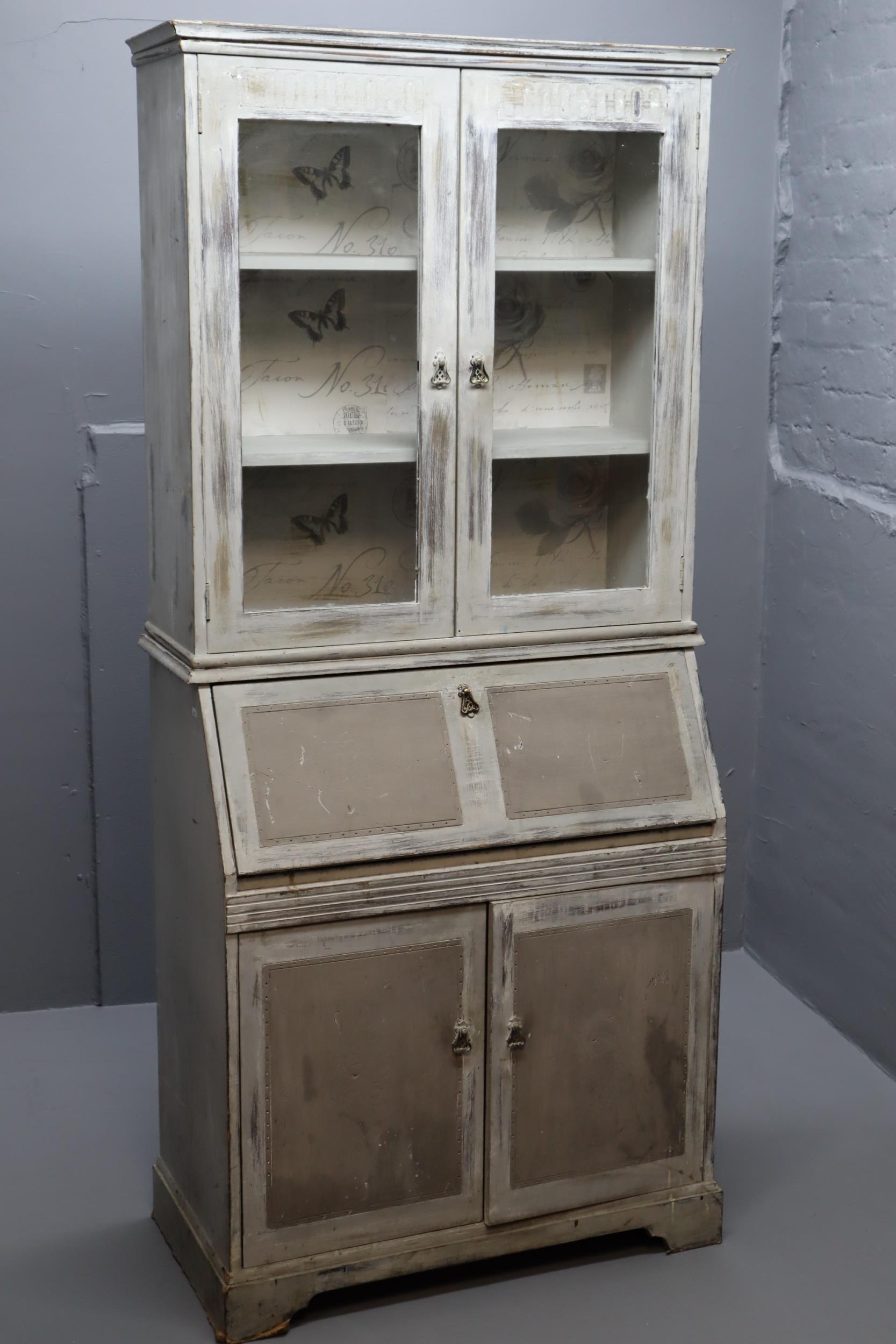 Large Two Piece Distressed Writing Bureau/ Book Display Unit with Glazed Doors and Perisian papered Backing splits in two for easy transport approx 75"x 34"x 17"