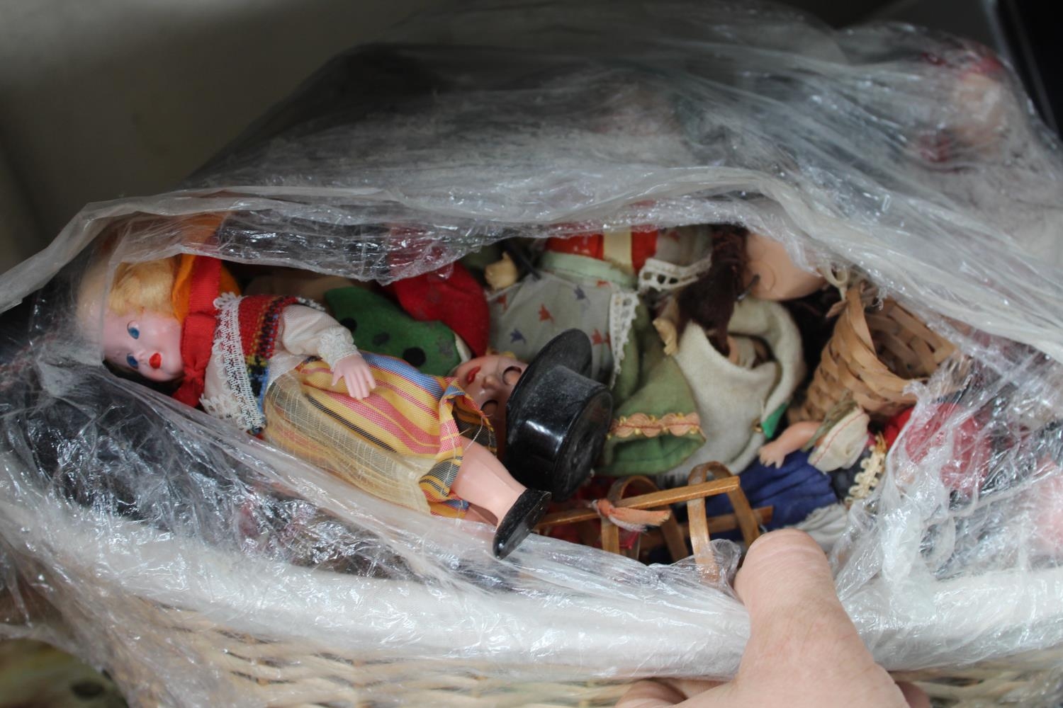BASKET OF DOLLS HOUSE FIGURES ETC