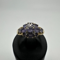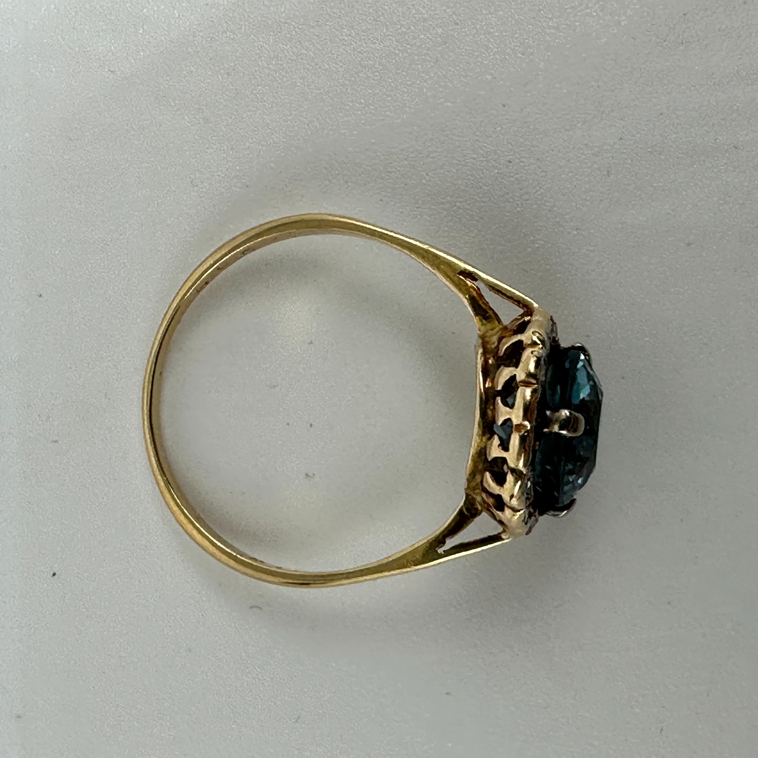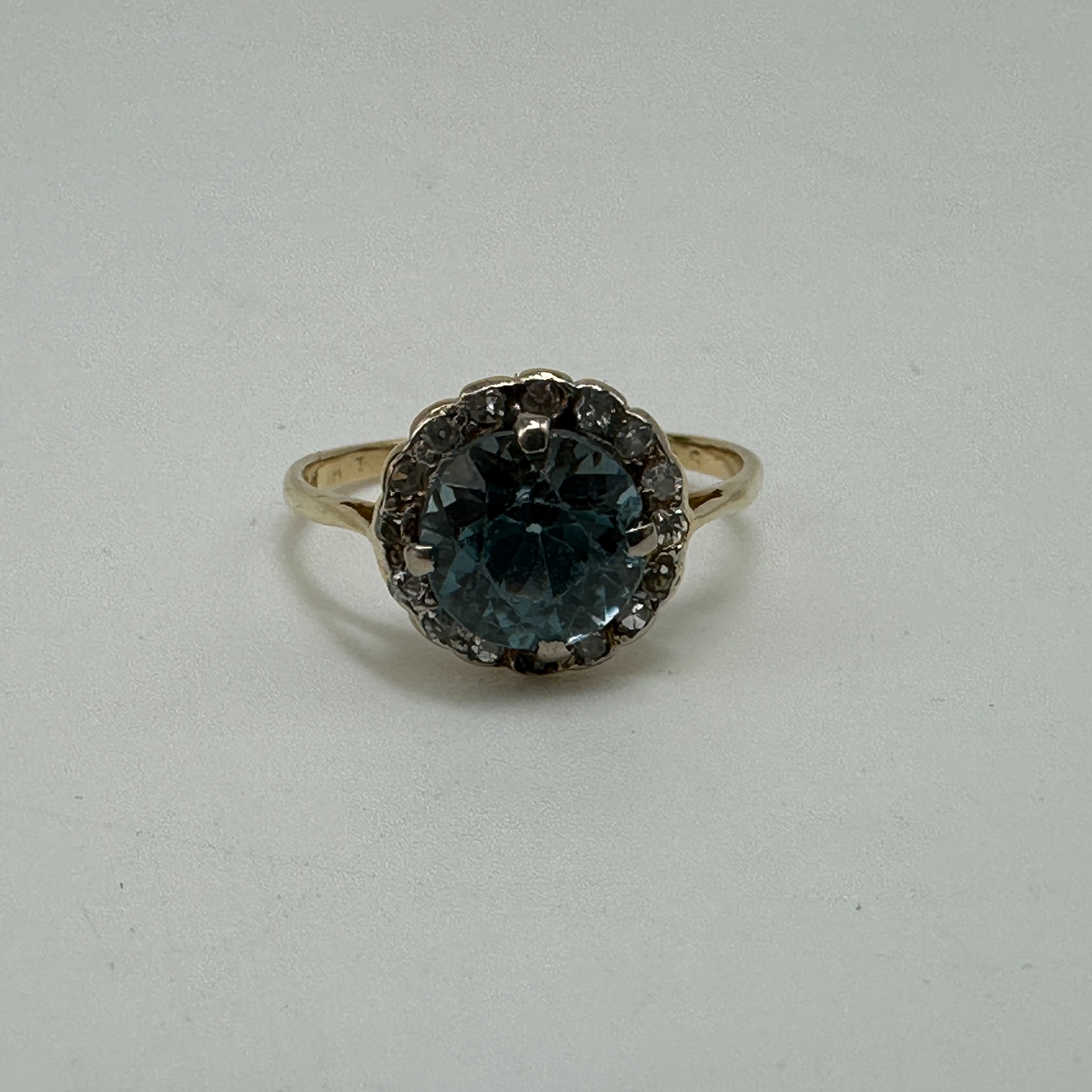 An 18ct yellow gold Topaz & diamond dress ring, round topaz stone surrounded by diamonds, weight 2 - 3 grams approx, size M