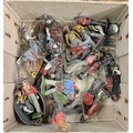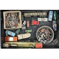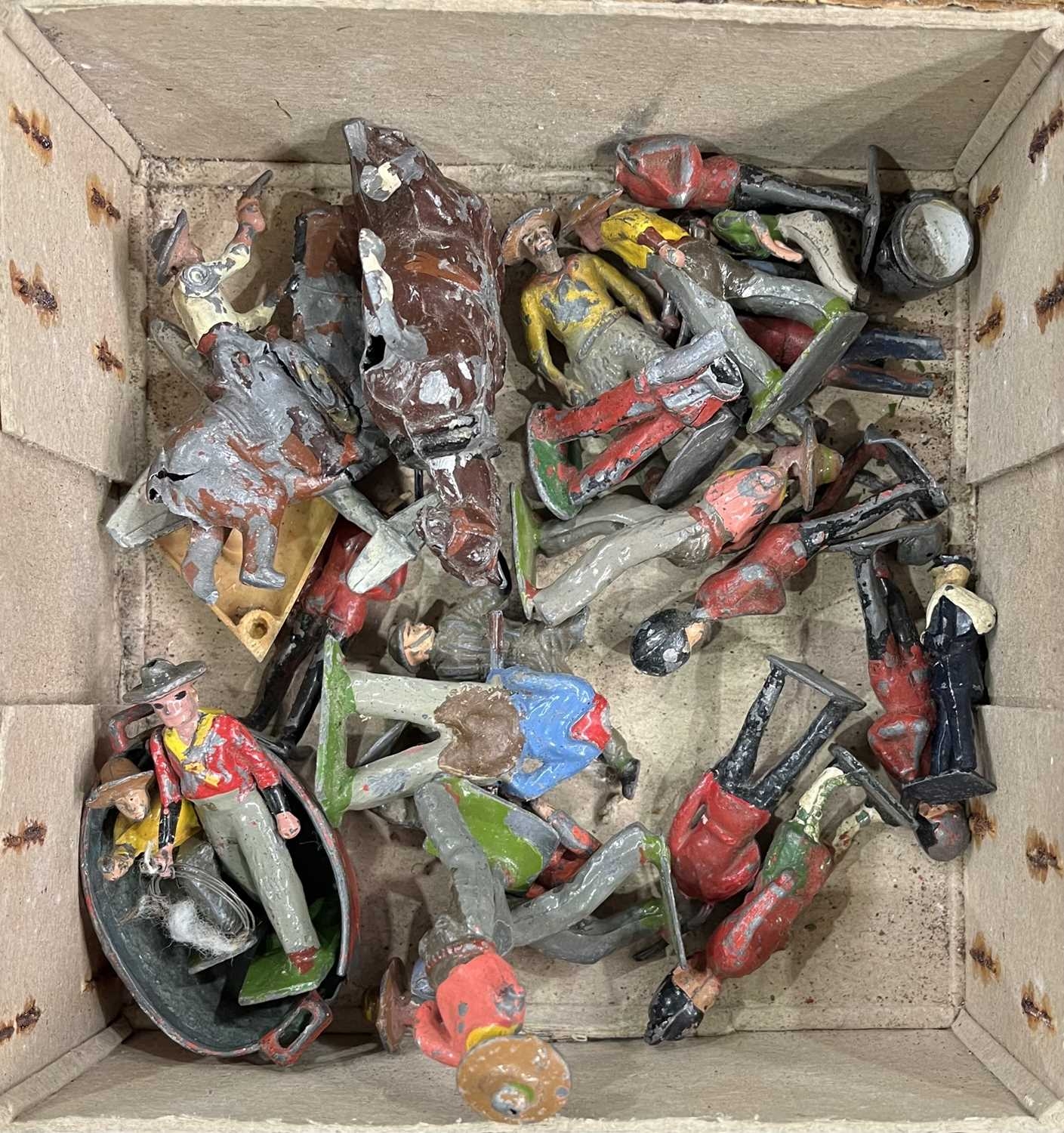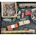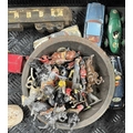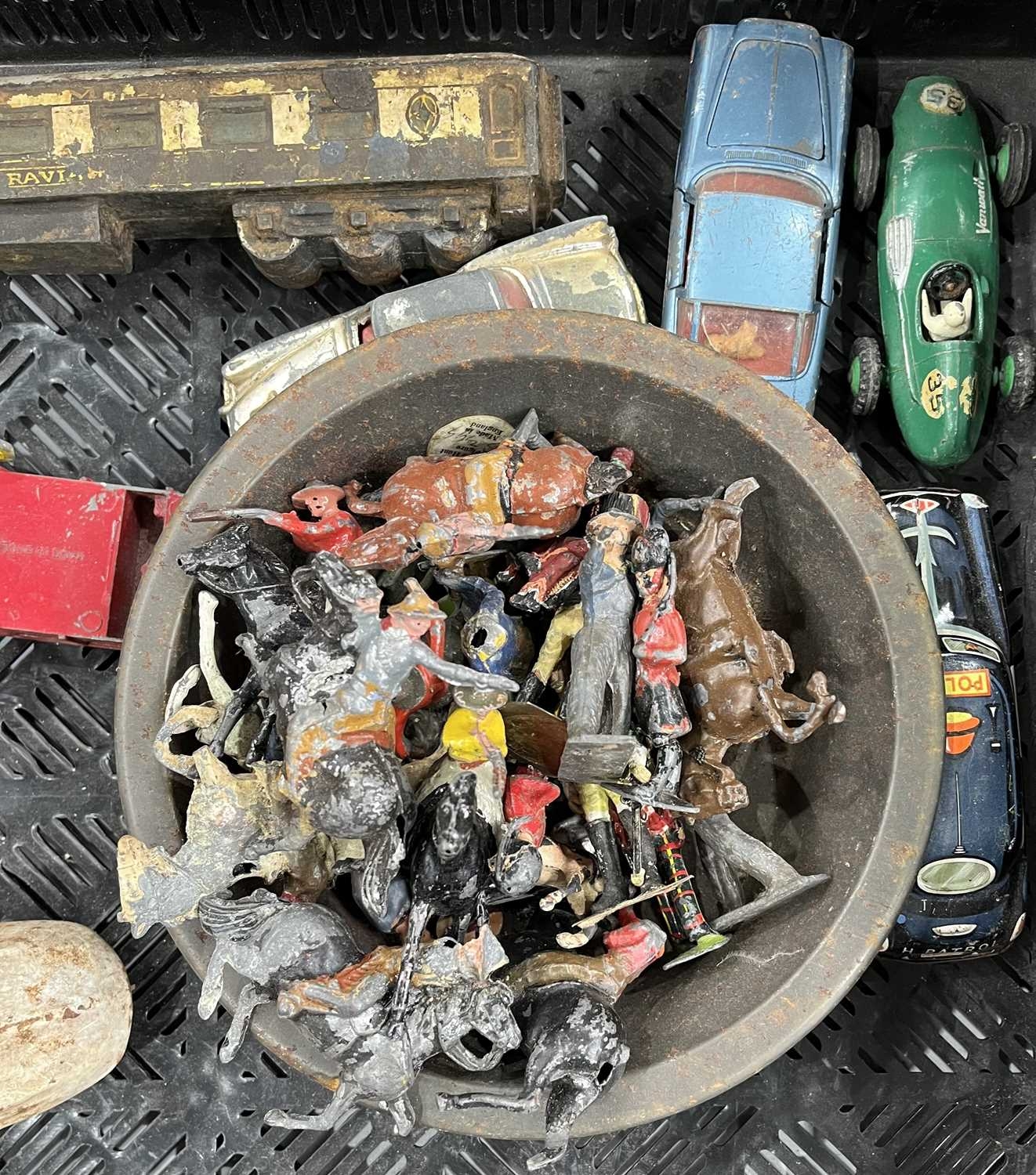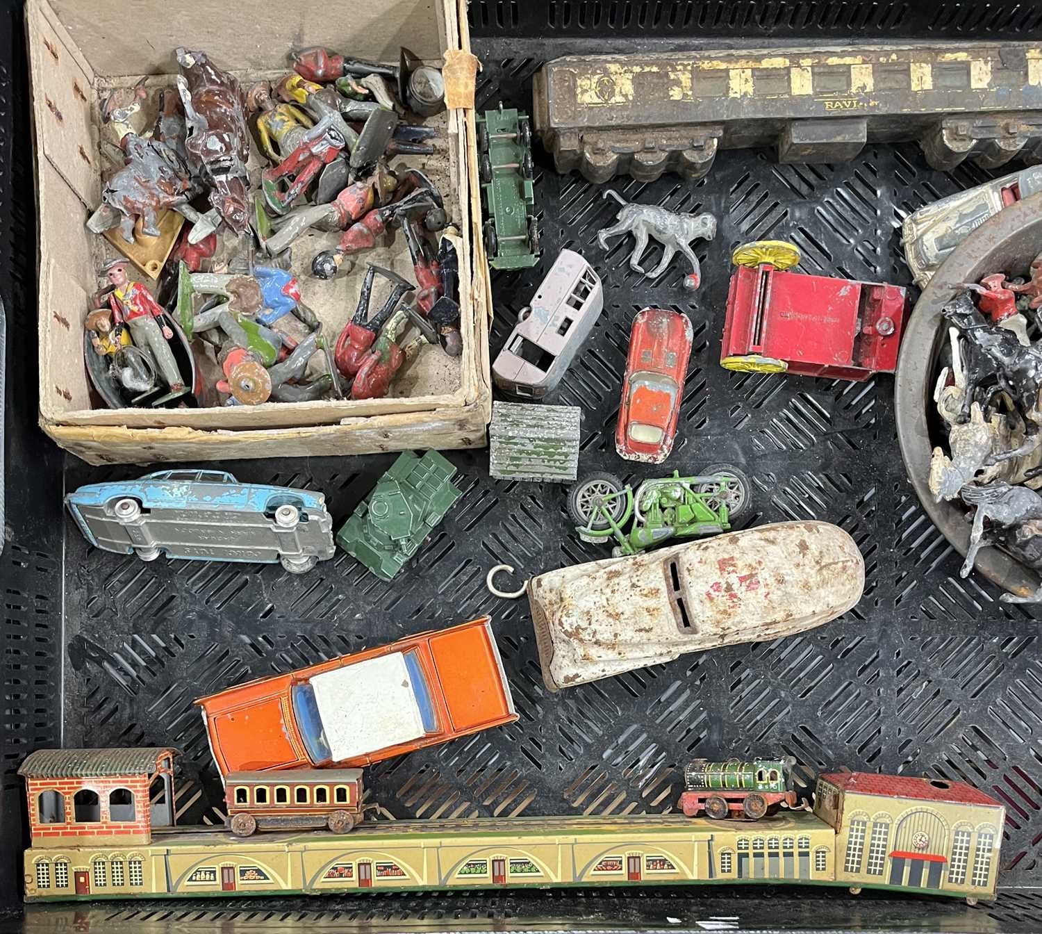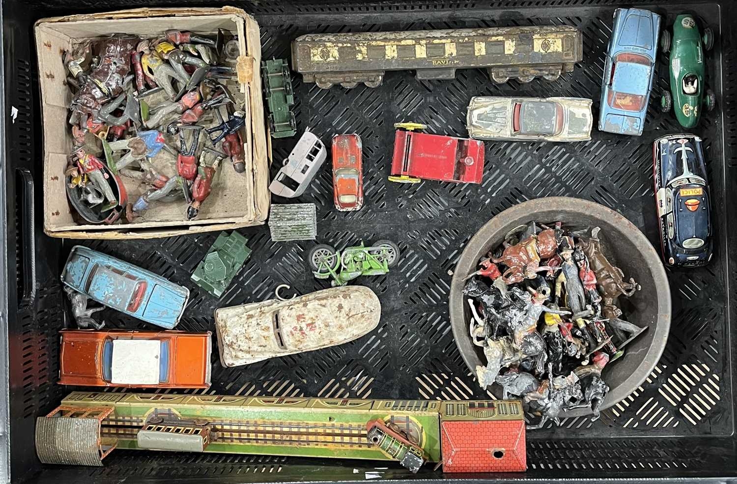 A small collection of Britains and other lead toys to include British Soldiers, Mexican Cowboys etc, a German tin plate train, early cast metal, painted train carriage possibly a door stop, Dinky toys, Corgi, Lesney, Dibro cars etc (1 tray)