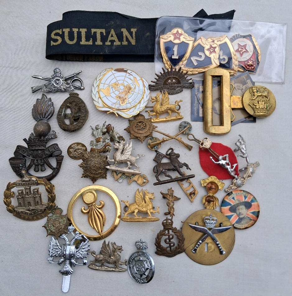 British cap badges and various badges including, Cornwall, Dorset, Royal Artillery etc