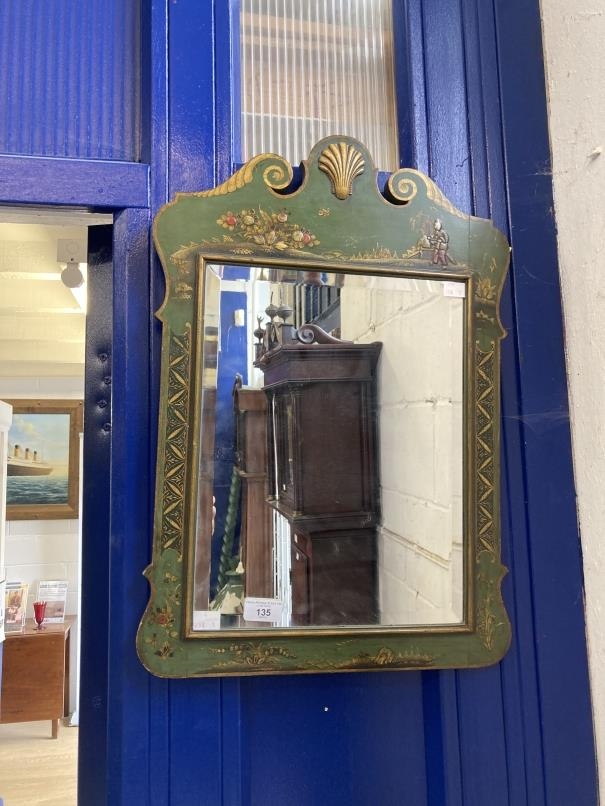 Early 20th cent. Wall mirror decorated in green gilt and ground chinoiserie style. 15ins. x 23ins.