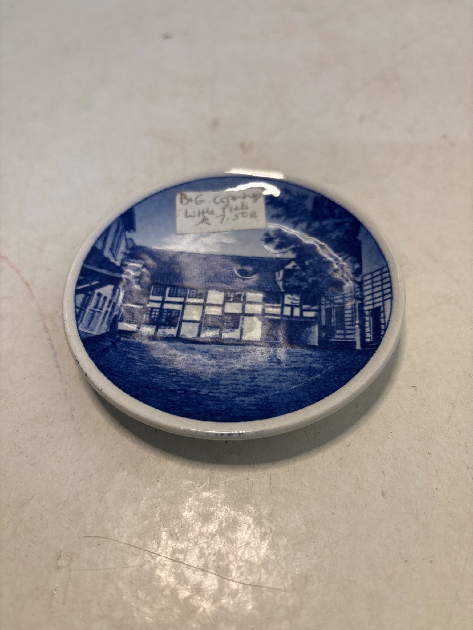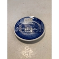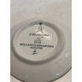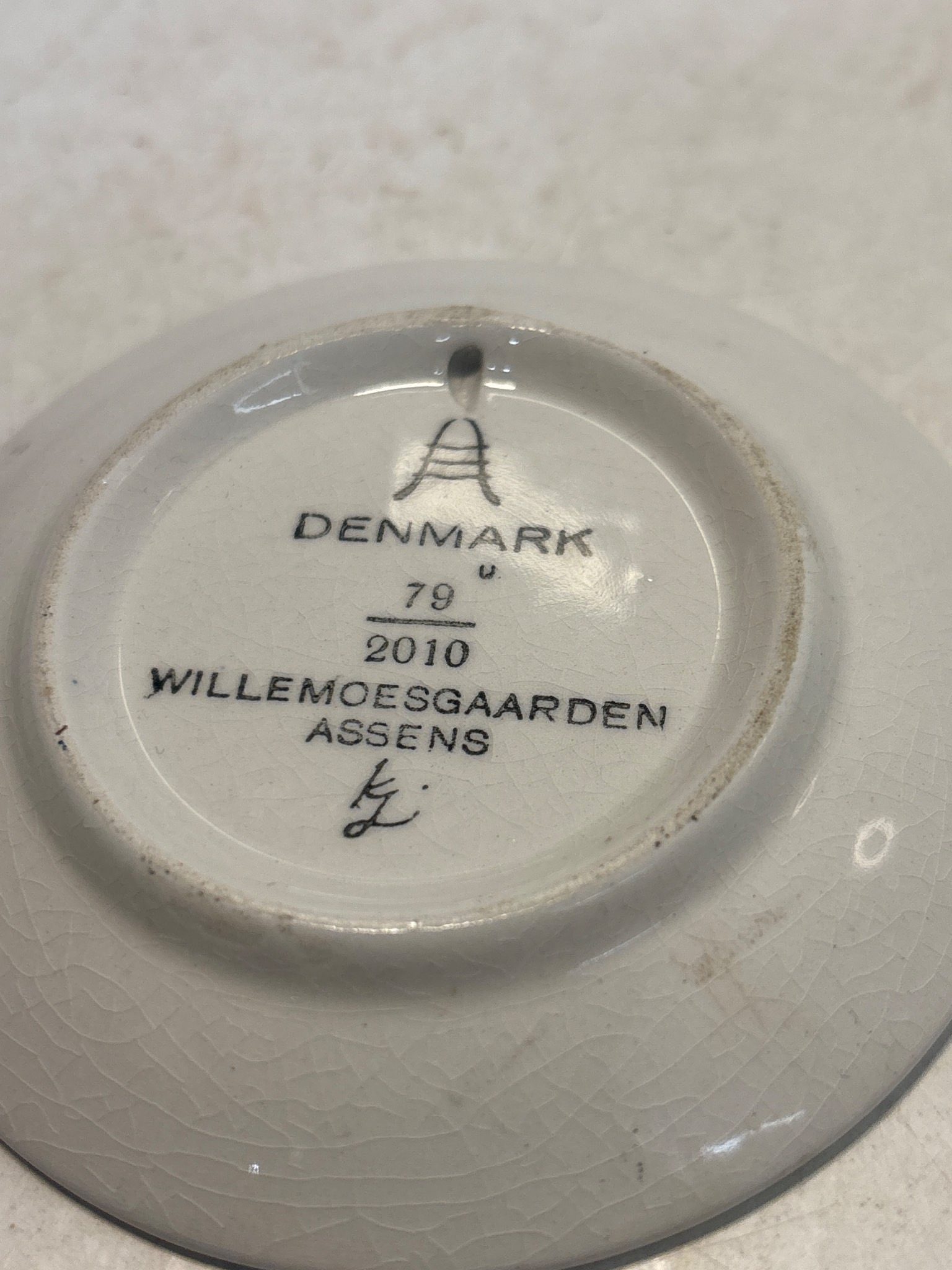 Small ceramic plate from Denmark, marked 'Willemoesgaarden Assens 2010'. Features a blue design on the front and a manufacturer mark on the back.