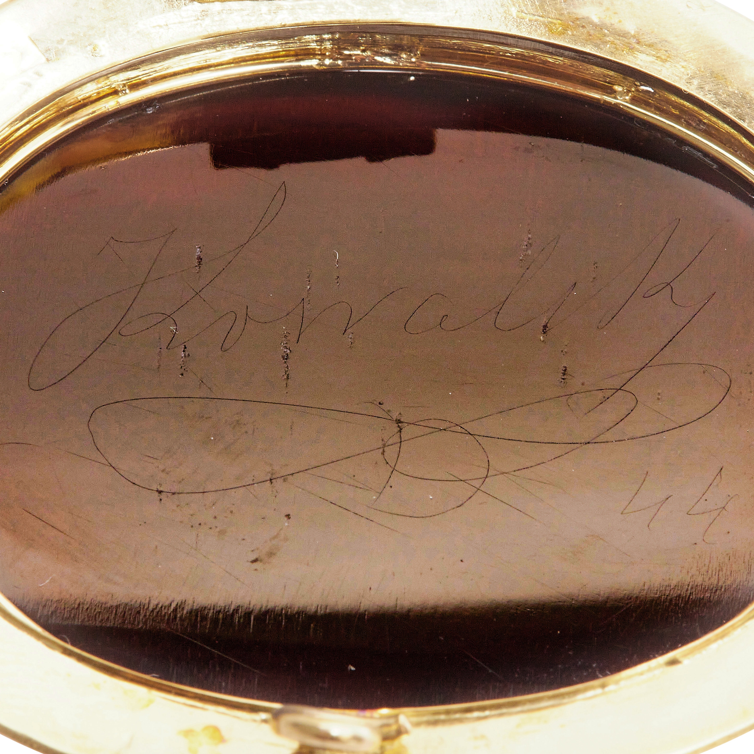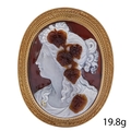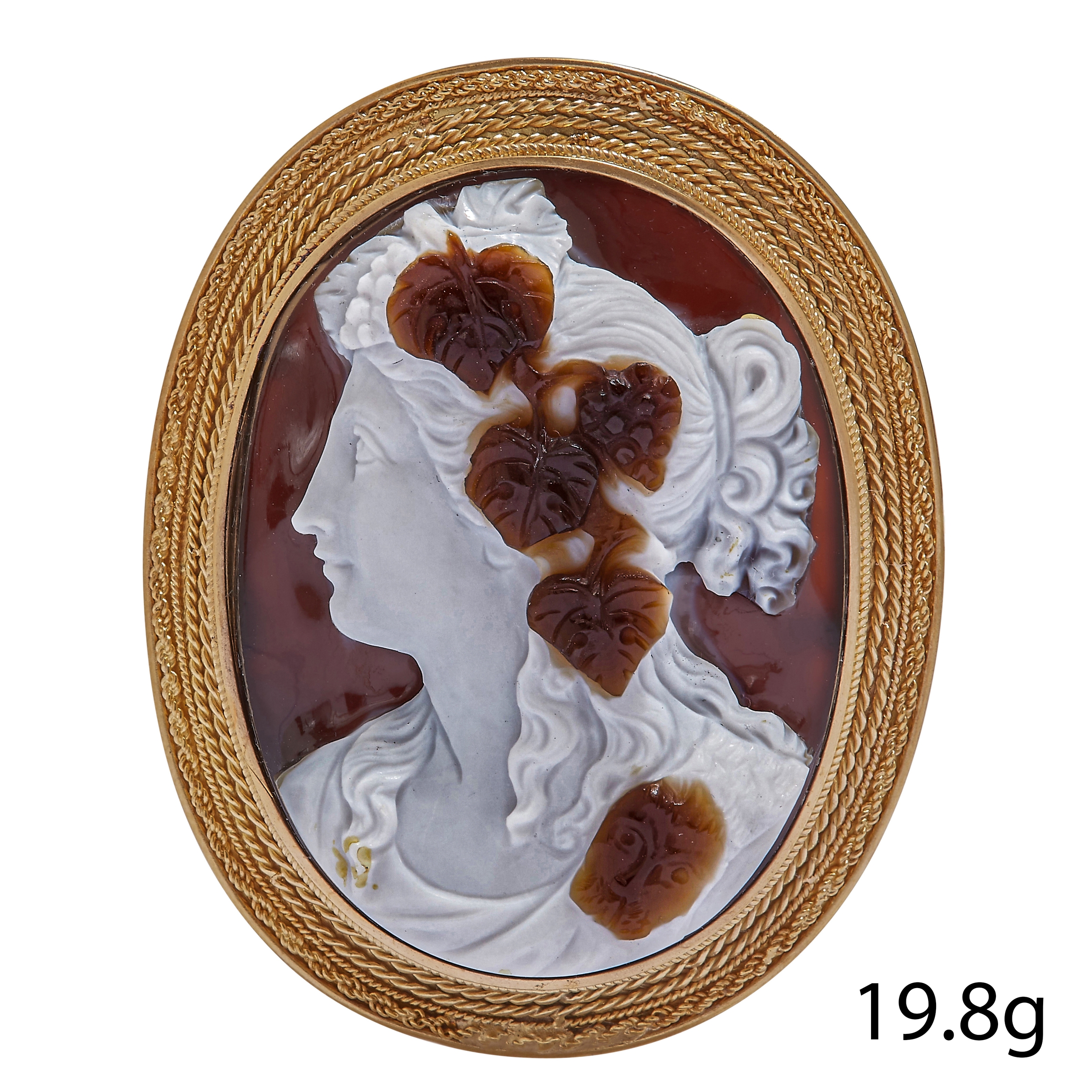 CARVED HARD STONE CAMEO BROOCH, depicting the bust of a Bacchanta maiden with vines and grapes in her hair. The back indistinct signed. L. cameo 3.7 cm. L. brooch 4.6 cm. 19.8 grams.