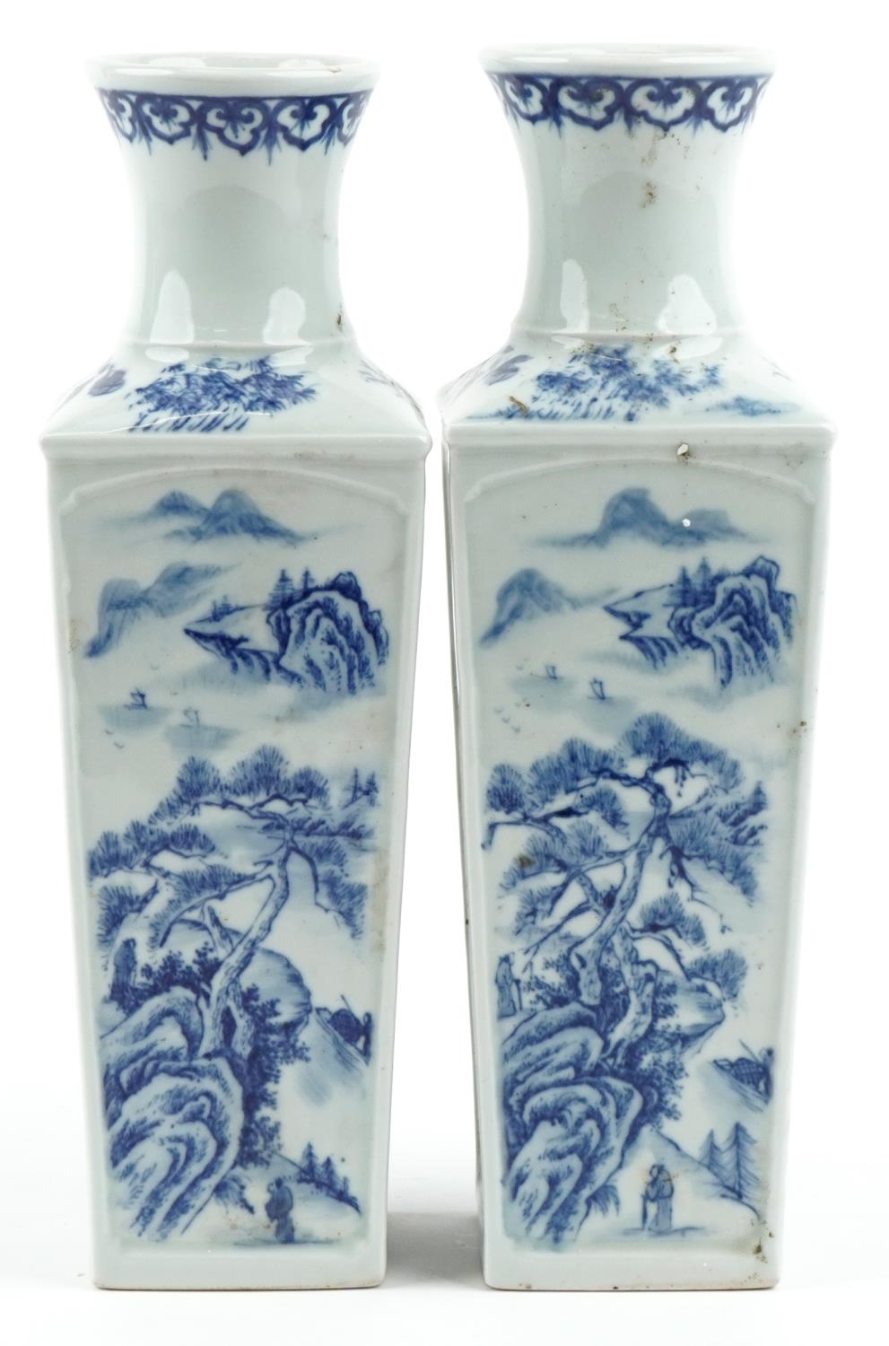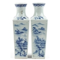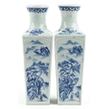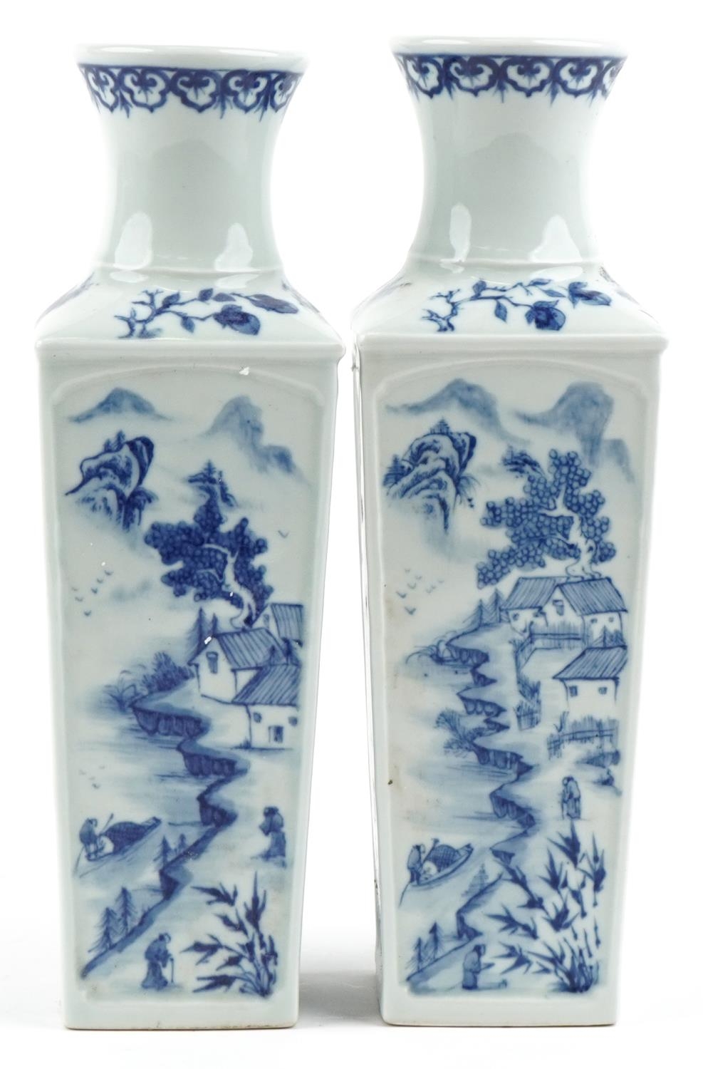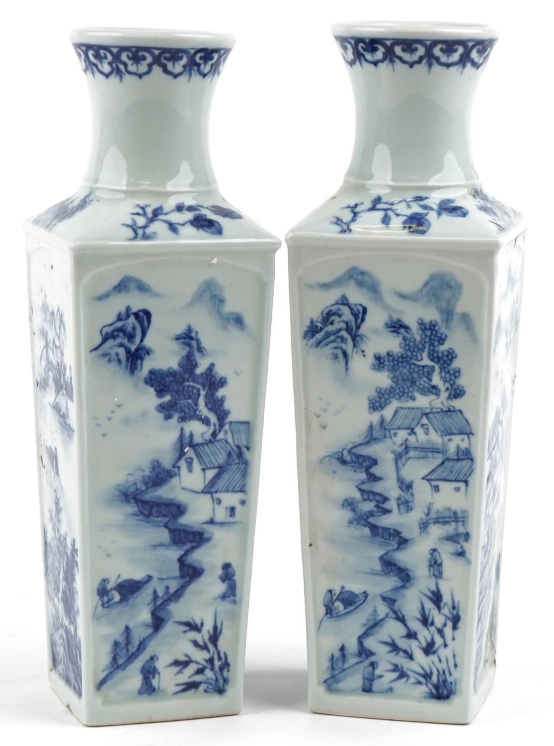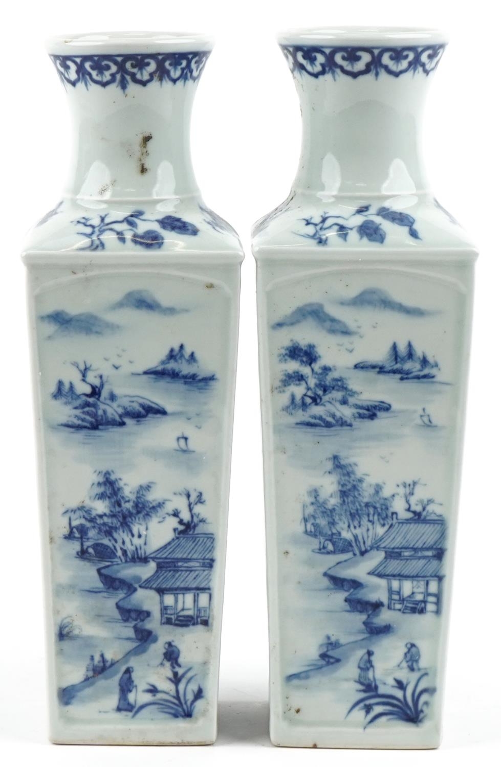 A pair of Chinese porcelain blue and white flat sided vases hand painted with figures amongst mountains and pagodas, character marks to the base, 29cm high.