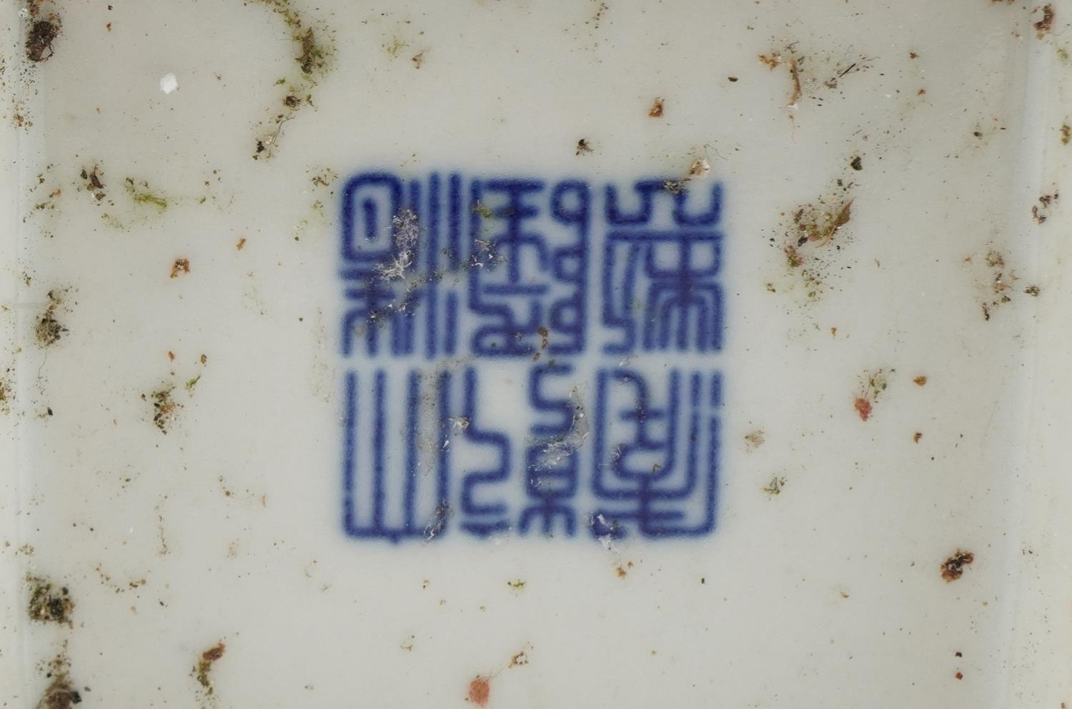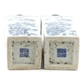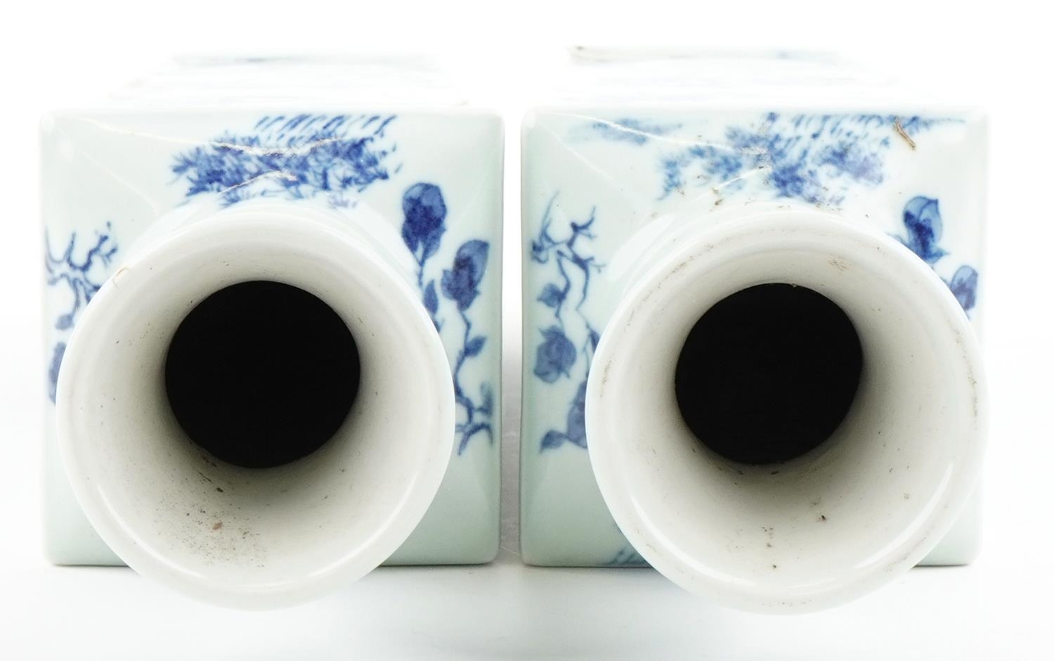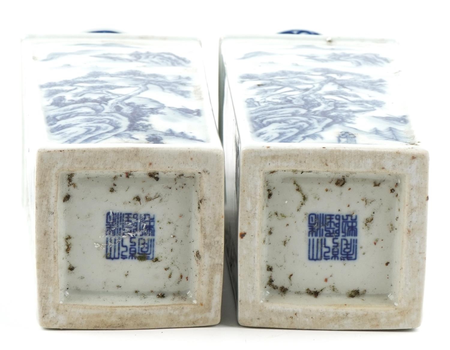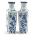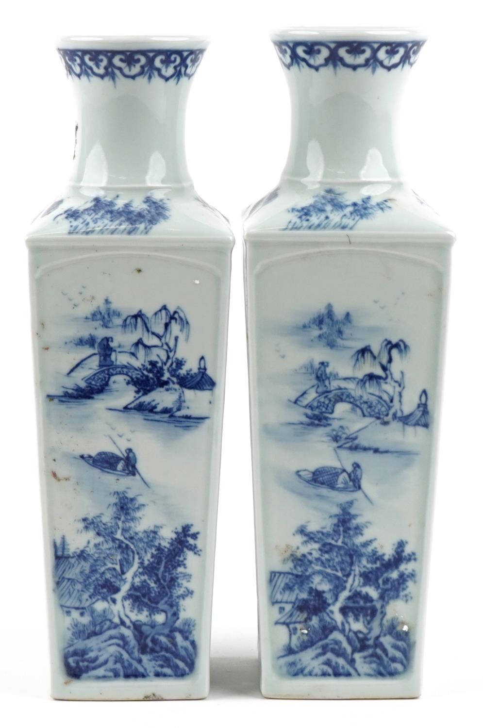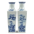 A pair of Chinese porcelain blue and white flat sided vases hand painted with figures amongst mountains and pagodas, character marks to the base, 29cm high.