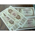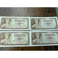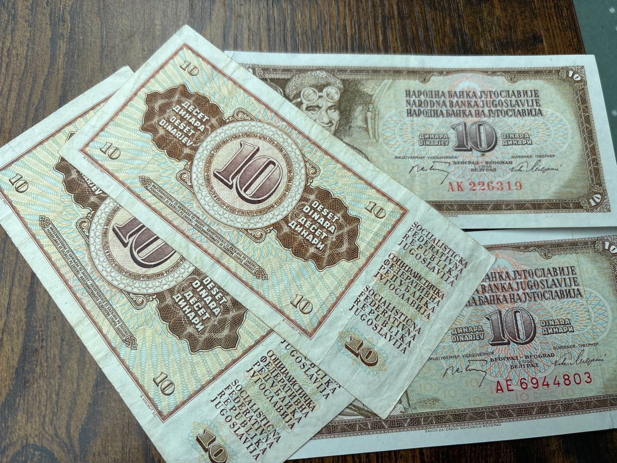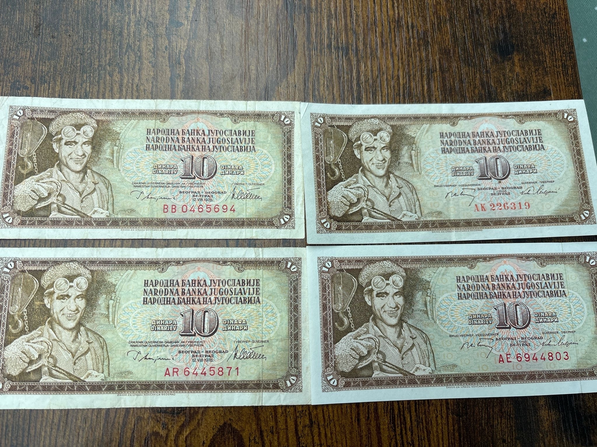 Collection of 4 Yugoslavian 10 Dinara banknotes featuring the classic industrial worker design. A nice vintage group from former Yugoslavia, showing detailed engraving typical of mid/late 20th century European currency.
