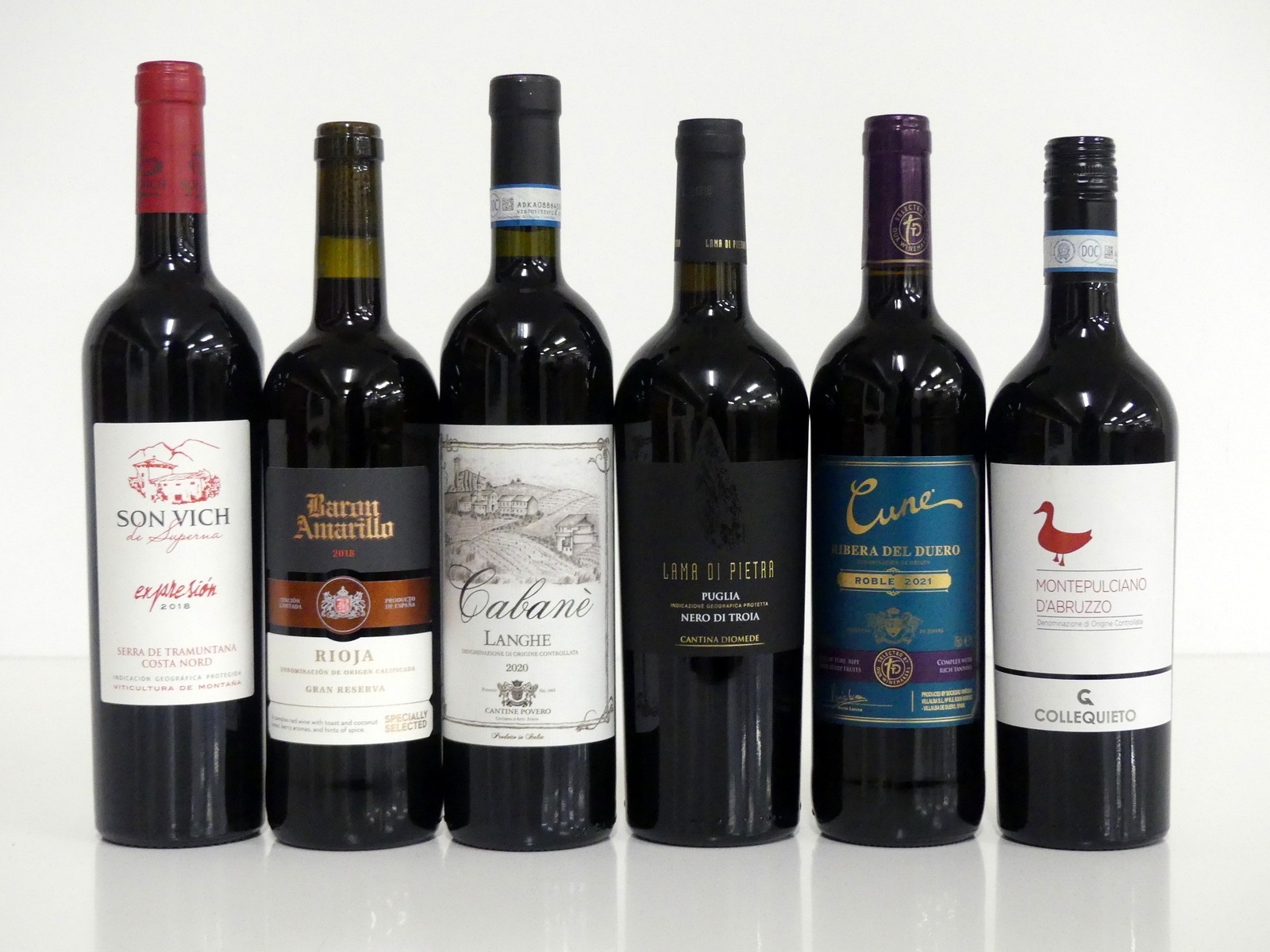 1 bt Son Vich de Suprema Expresion Serra de Tramuntana 2018 Costa Nord 1 bt Baron Amarillo Rioja Gran Reserva 2018 1 bt Cantine Povero Cabanè 2020 Langhe 1 bt Cantina Diomede Lama di Pietra Nero di Troia 2020 Puglia 1 bt CVNE Roble Ribera del Duero 2021 for Sainsburys 1 bt Collequieto Montepulciano D'Abruzzo 2023 Above 6 bottles