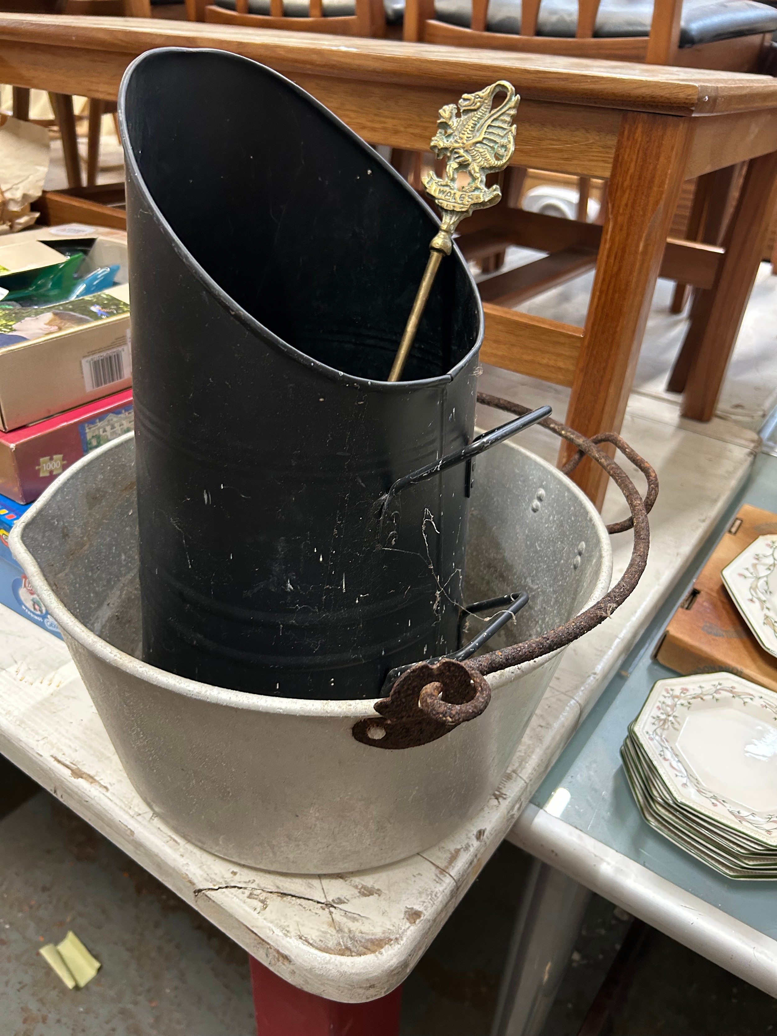 Large galvanised jam pan, coal scuttle & a ‘Wales’ brass toasting fork
