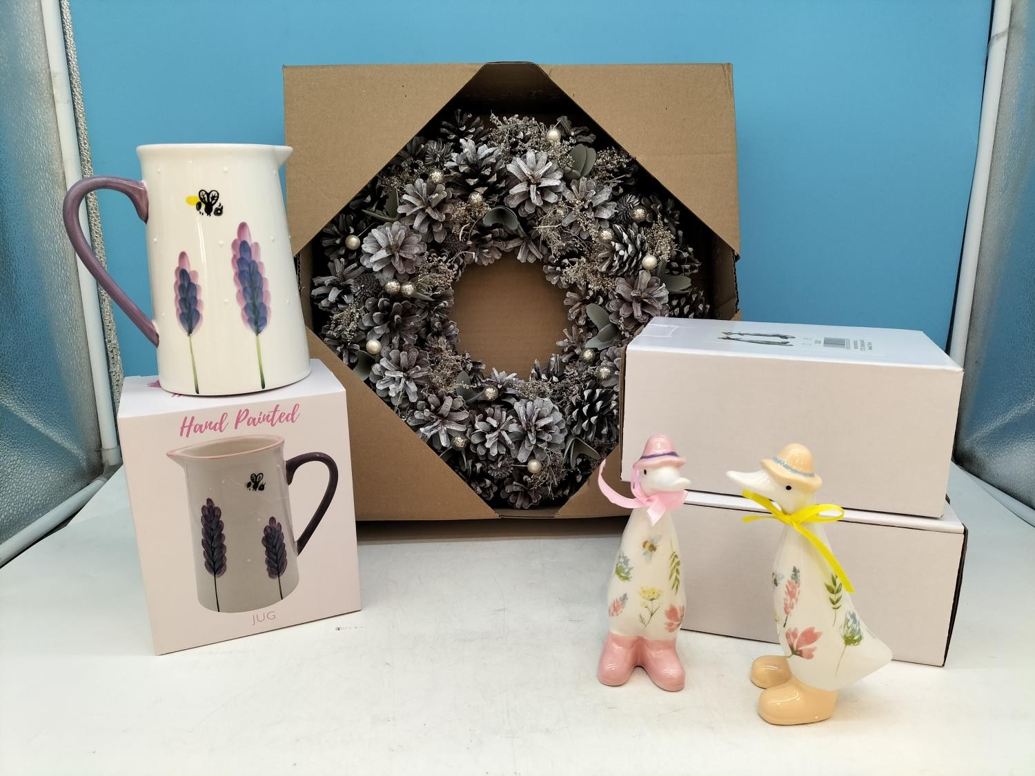 New and Boxed Items to include 35cm Festive Wreath, 14cm Ceramic Ducks (2) plus Floral Jug.
