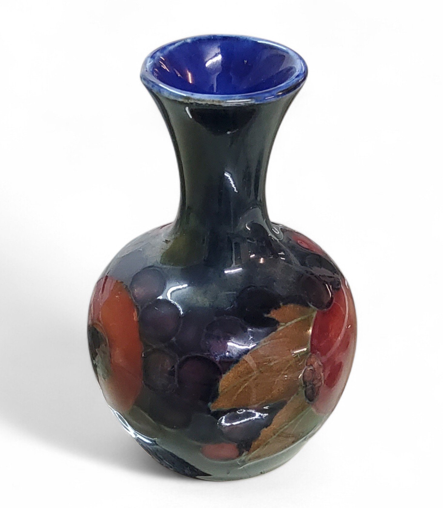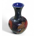 A Moorcroft Pomegranate pattern bottle vase, flared neck, tube lined with fruit and berries, in tones of red, purple, blue and green, 10cm high, impressed mark