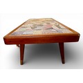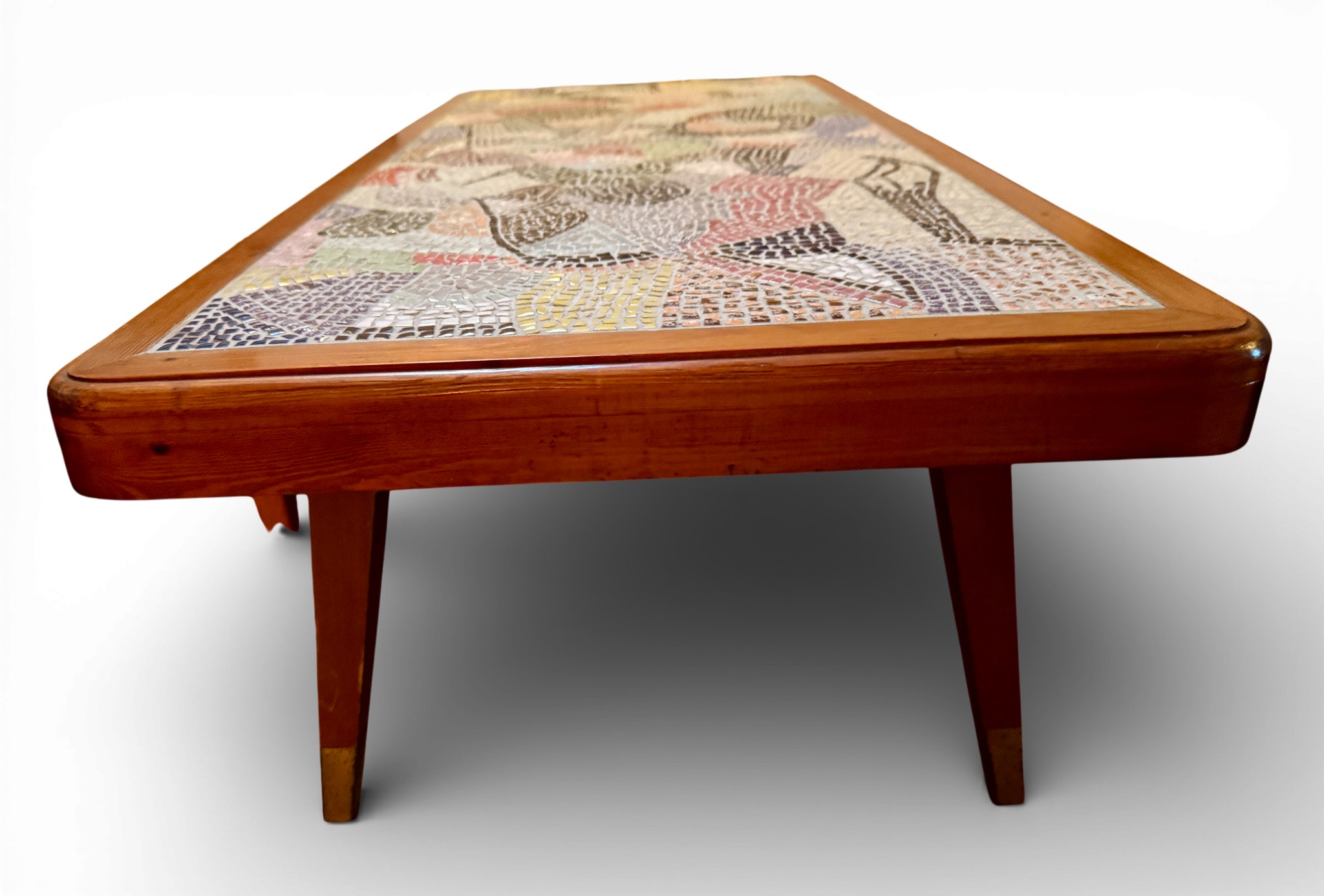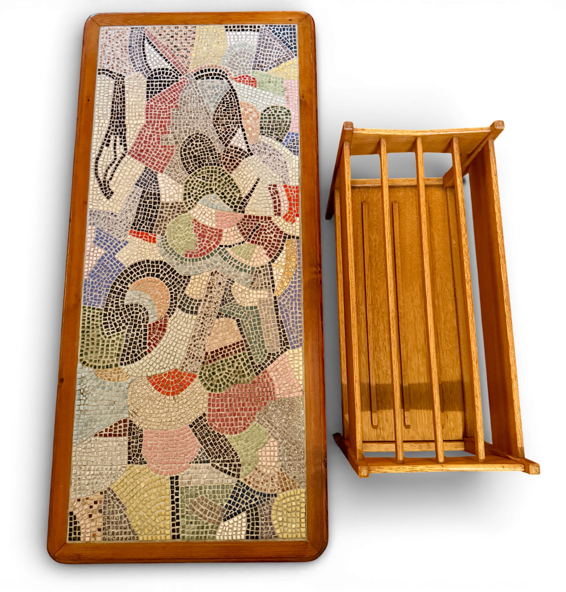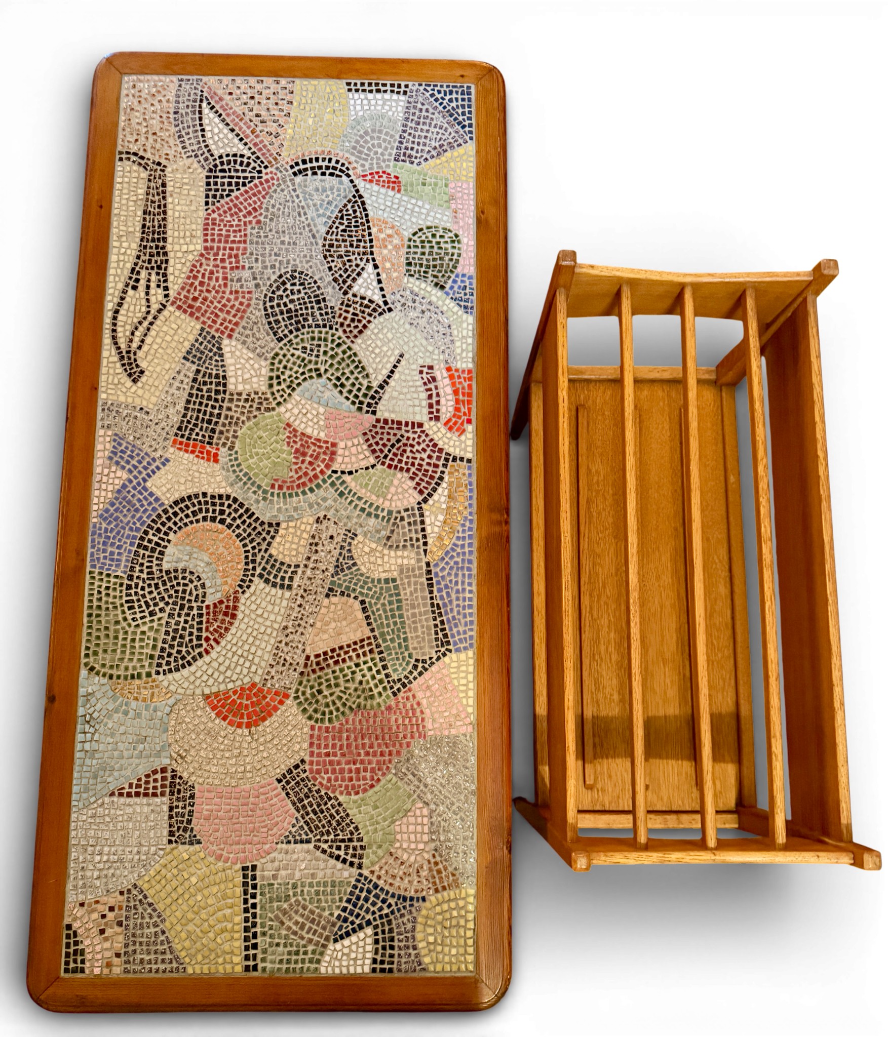 Mid 20thC ceramic mosaic topped coffee table 95cm x 43cm x 32cm h together with a magazine rack.
