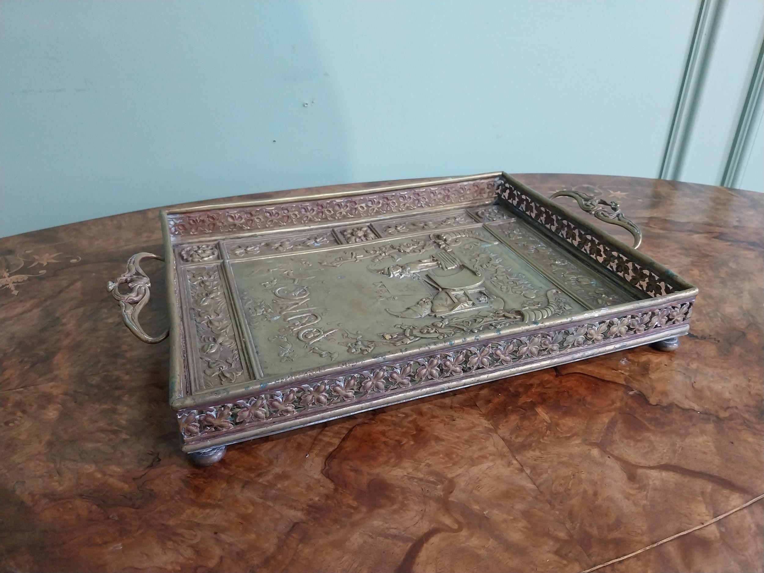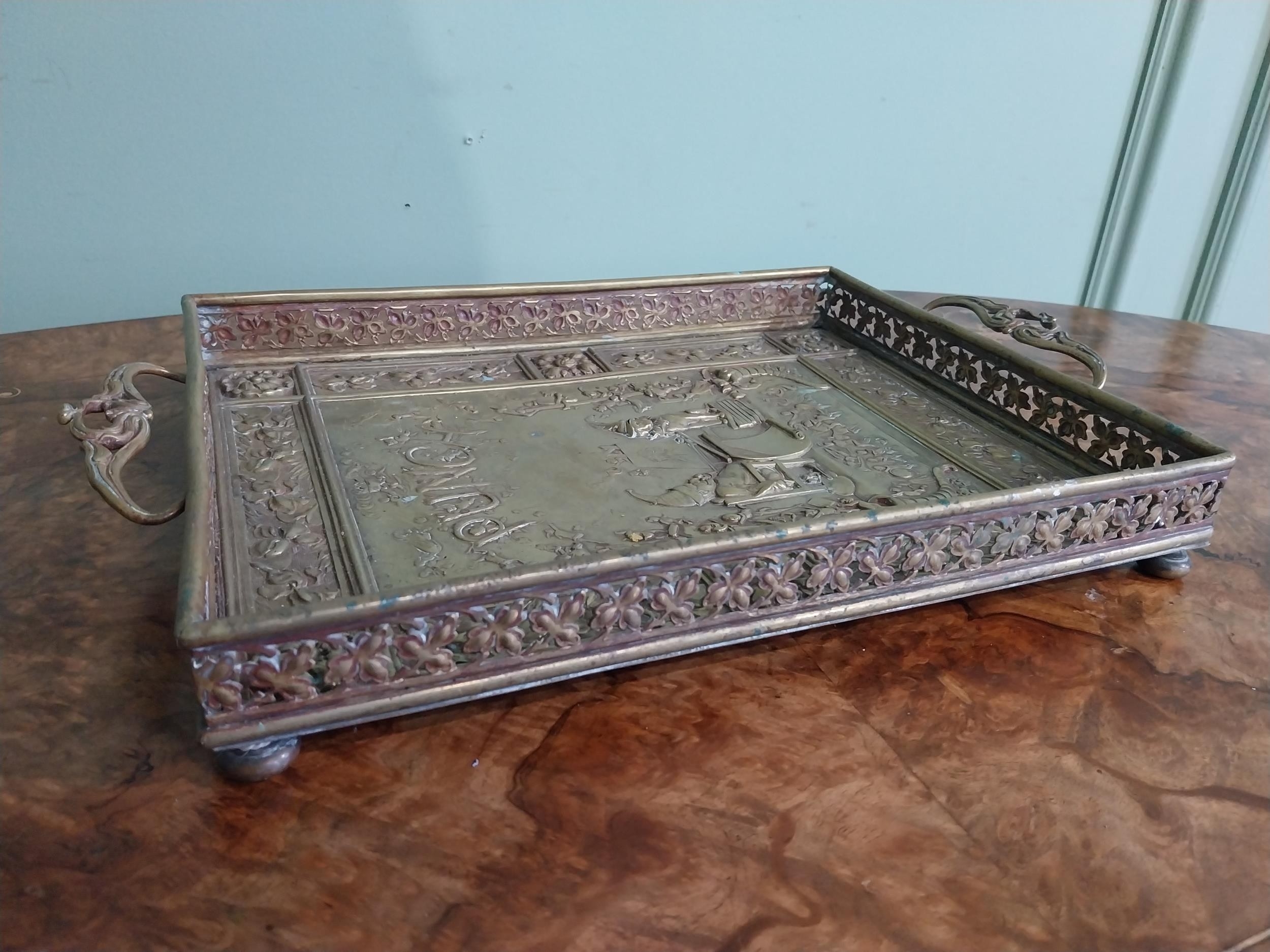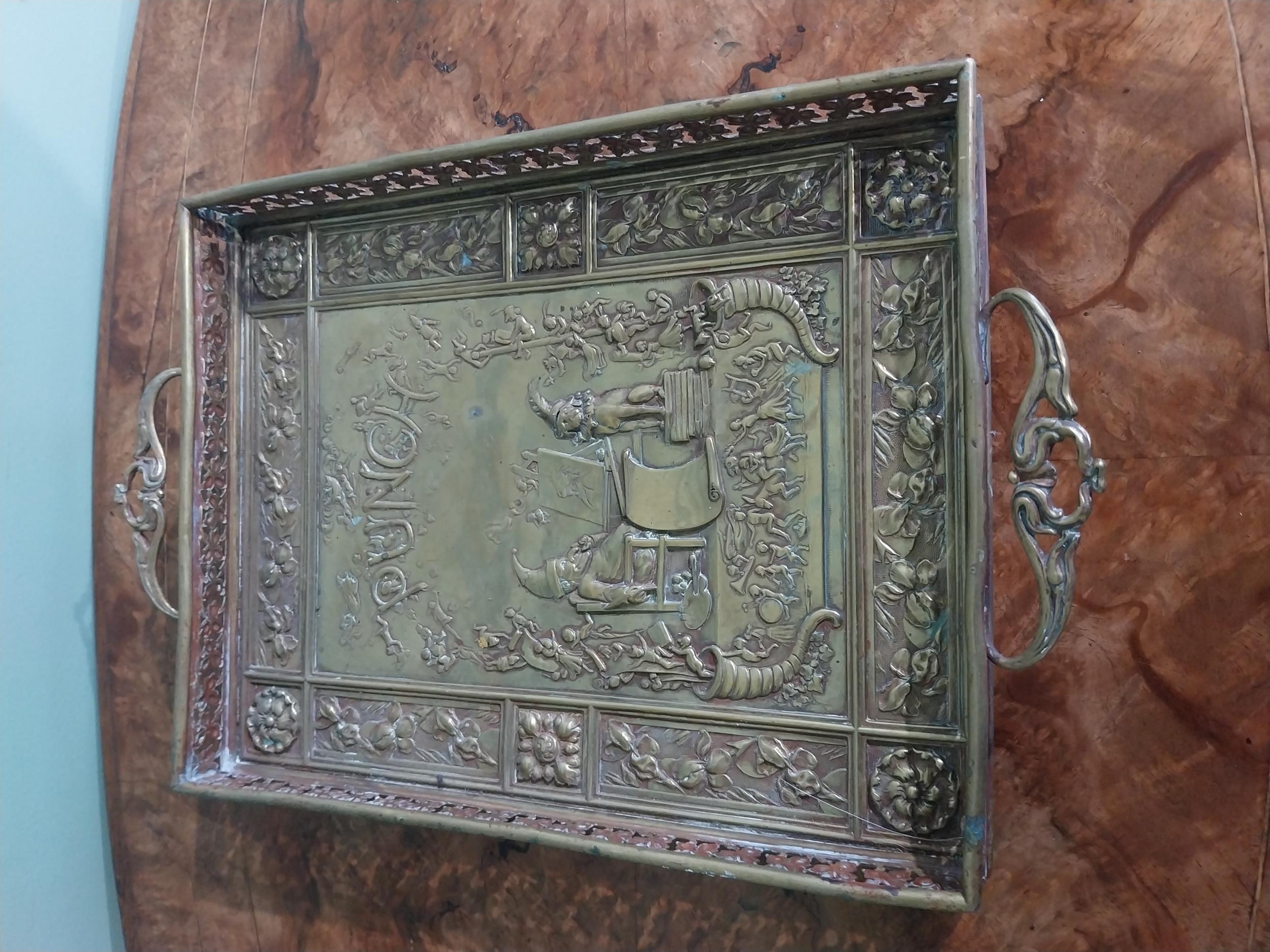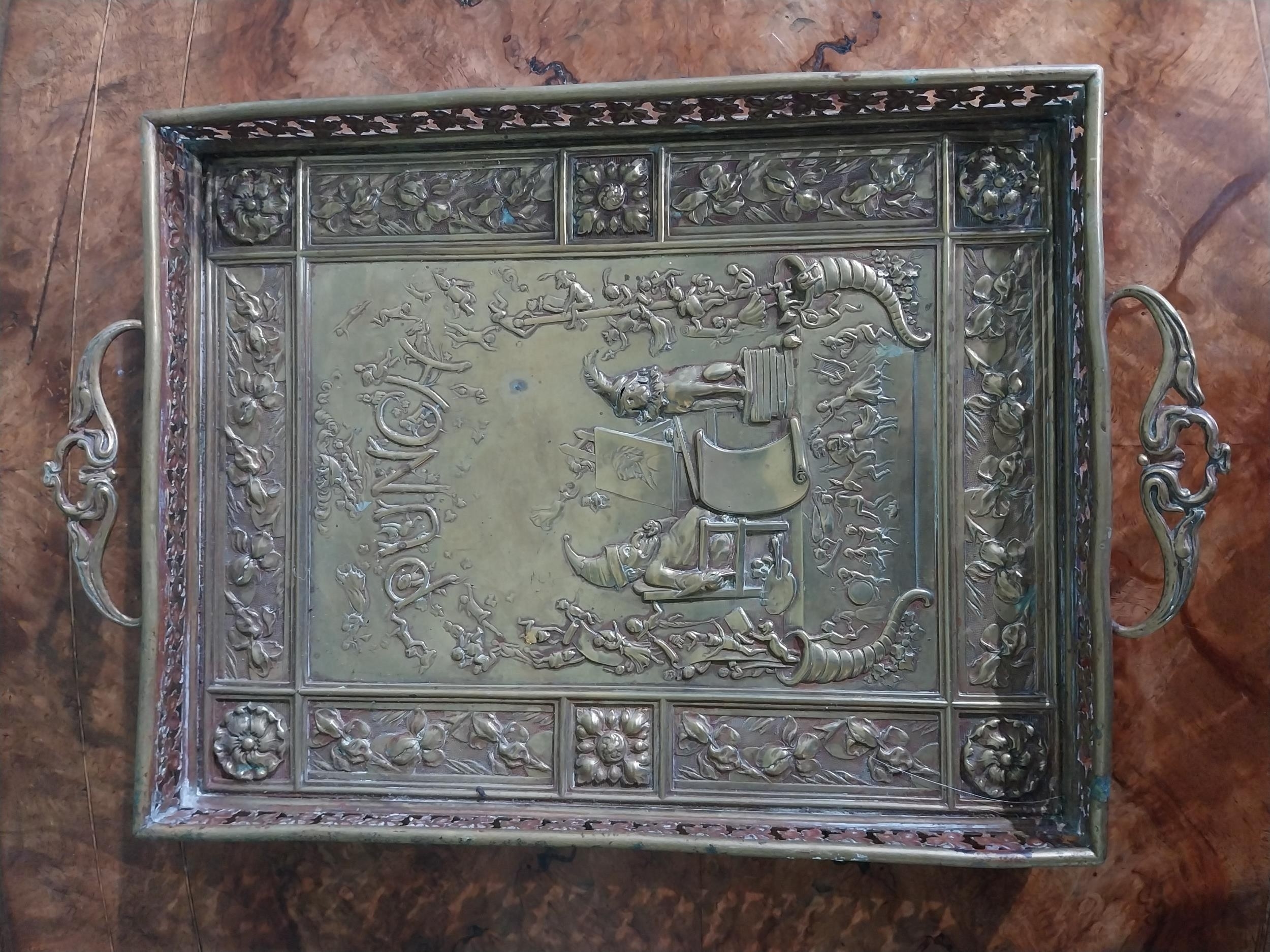 Edwardian embossed brass Punch and Judy serving tray. {5 cm H x 36 cm W x 23 cm D}.