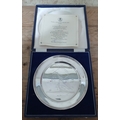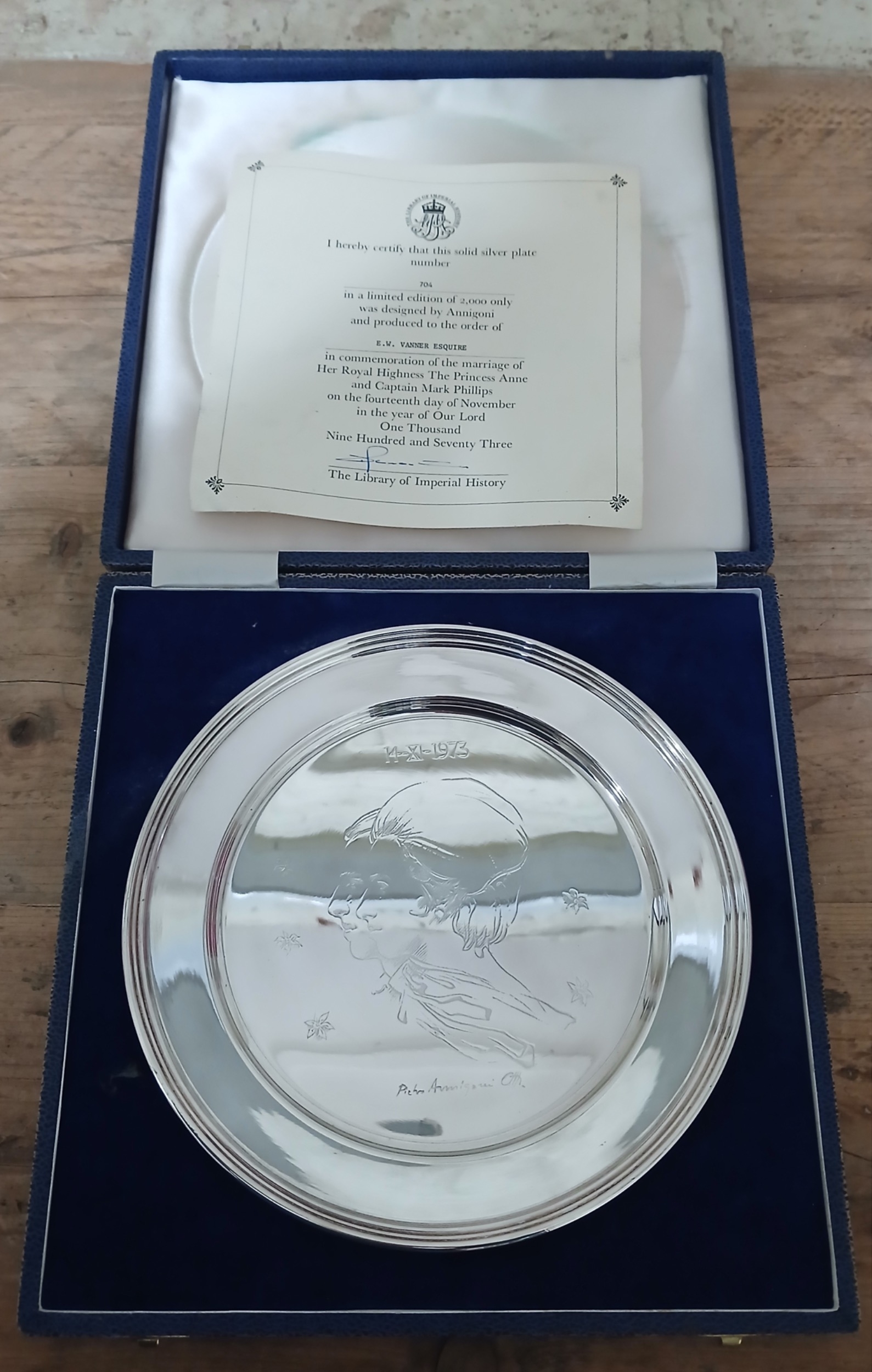 A hallmarked silver HRH Princess Anne and Captain Mark Phillips marriage commemorative silver plate, weight 380g, with box and certificate.