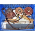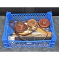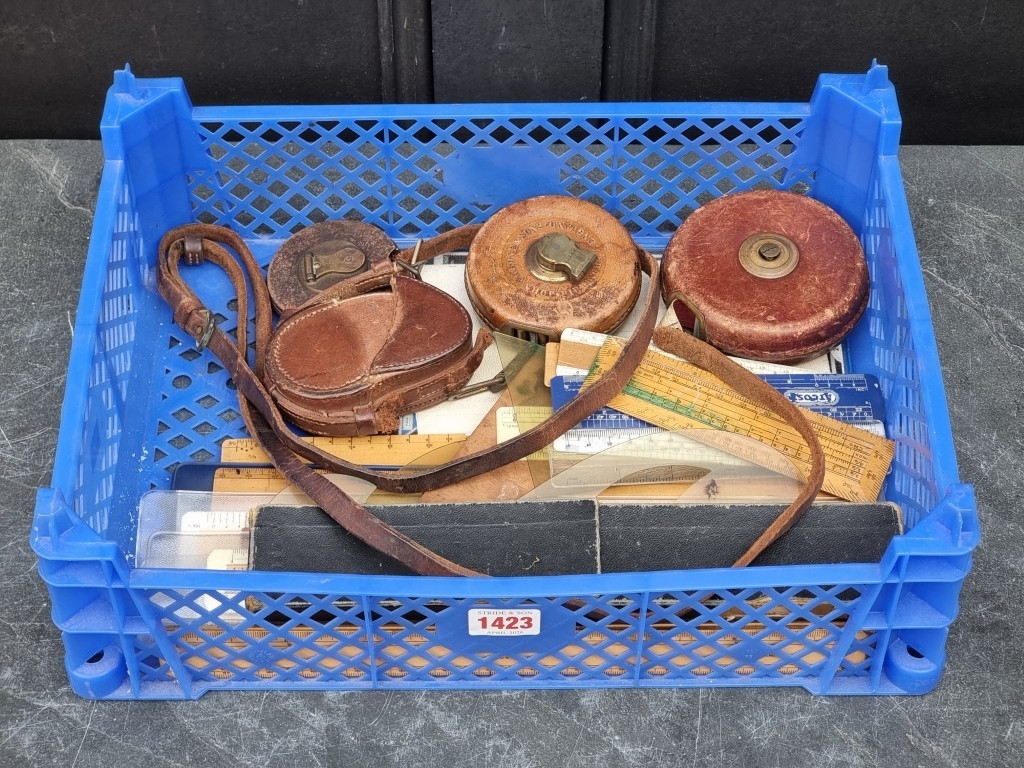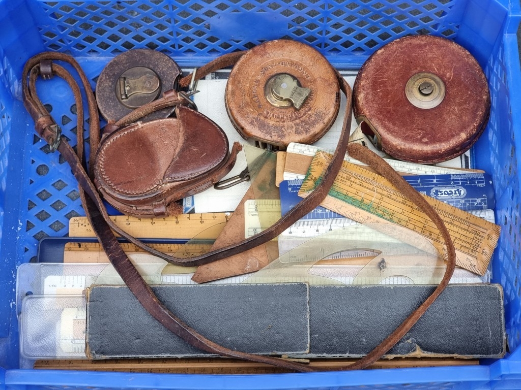 A collection of surveyors rules and measures; together with a WWI pocket compass, in leather case.