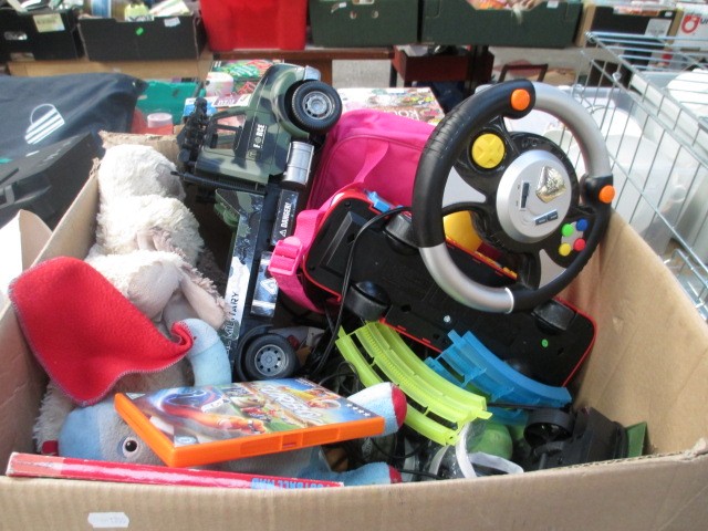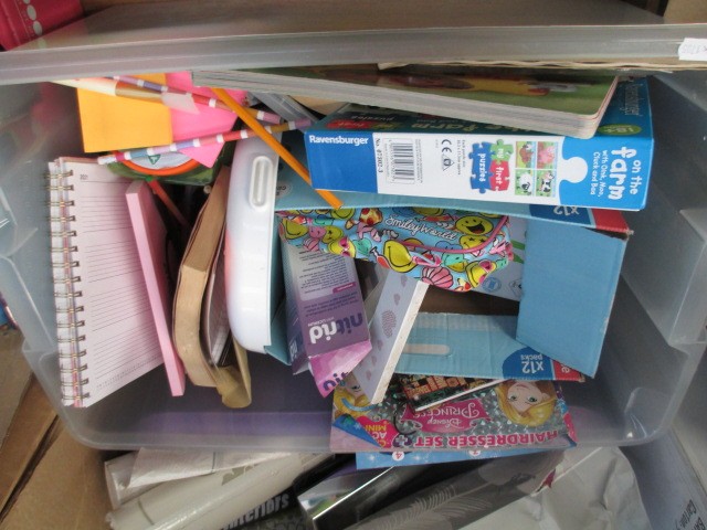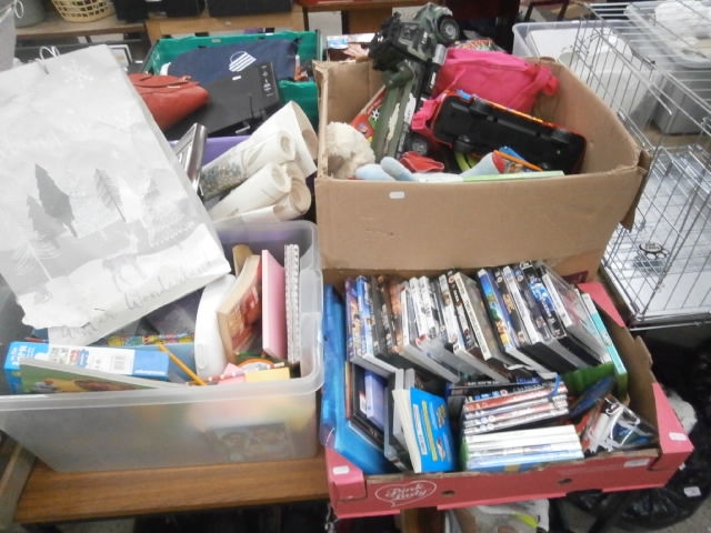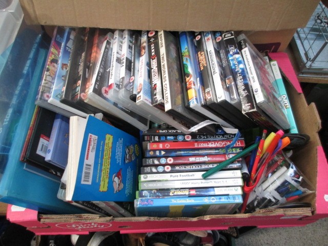 Four boxes inc stationary, DVDs, console games, toys, wallpaper, etc