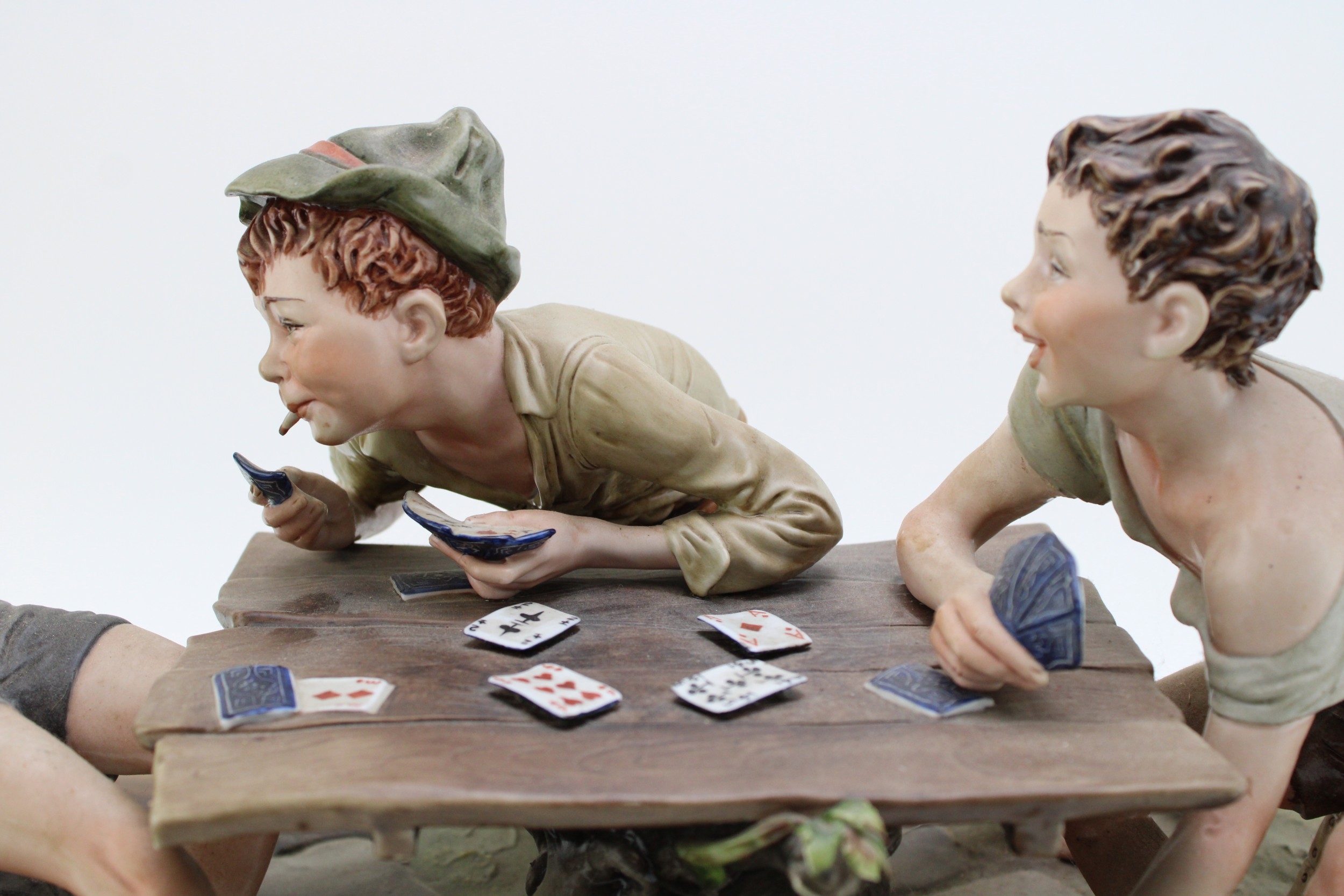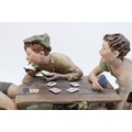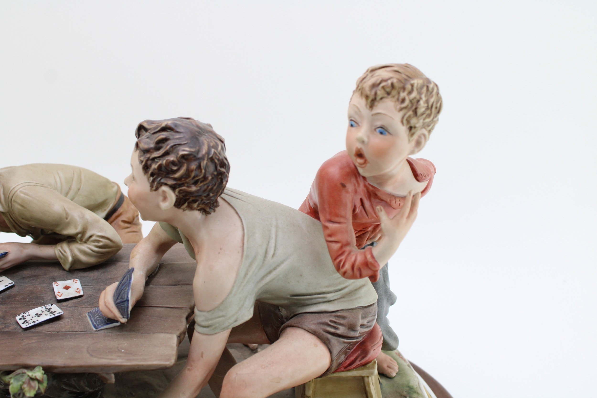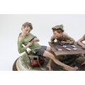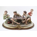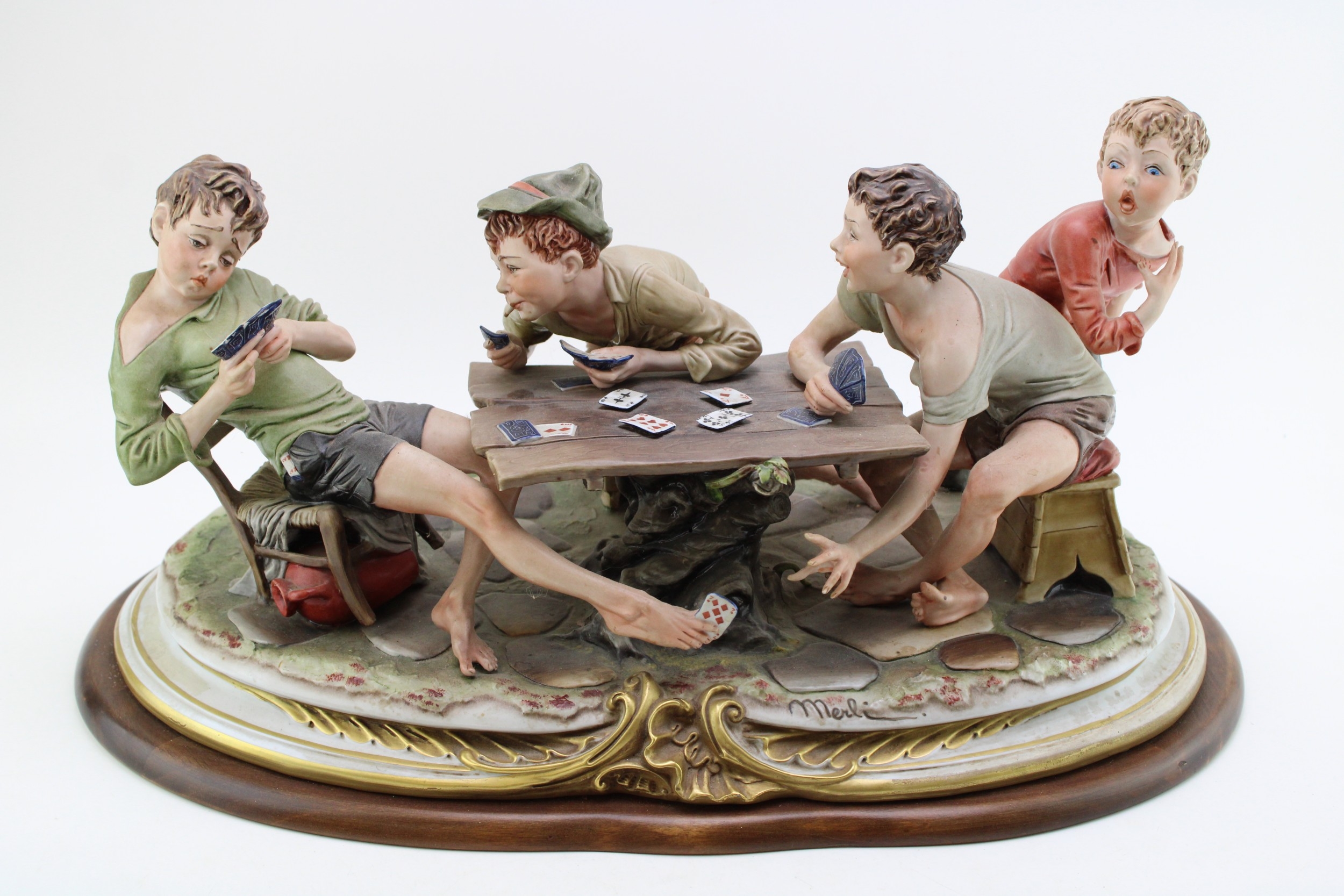Capodimonte porcelain figure group, modelled as "The Cheats" by Bruno Merli, depicting four boys playing cards, raised on a wooden base, incised and painted marks, 55cm wide, collection preferred.