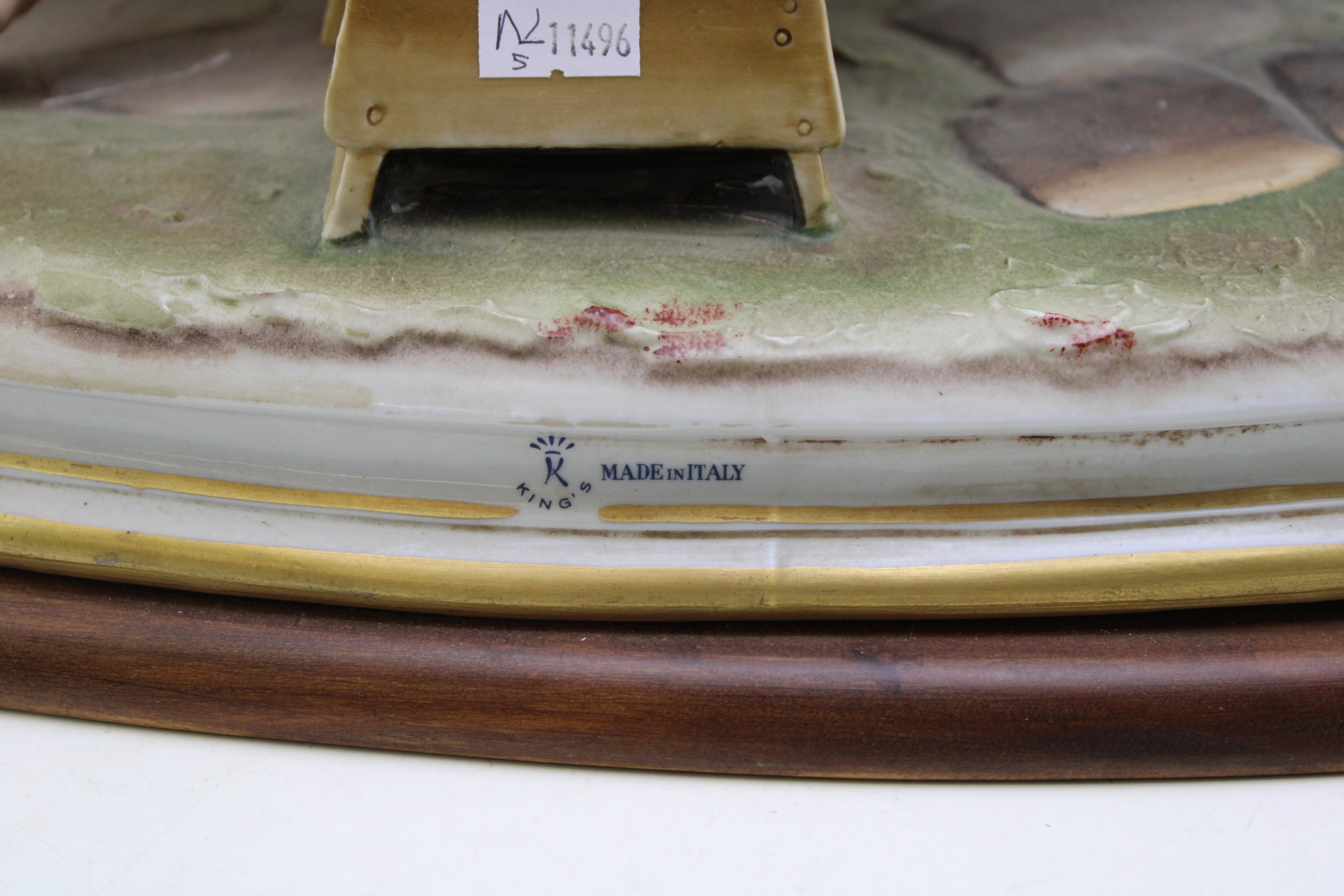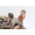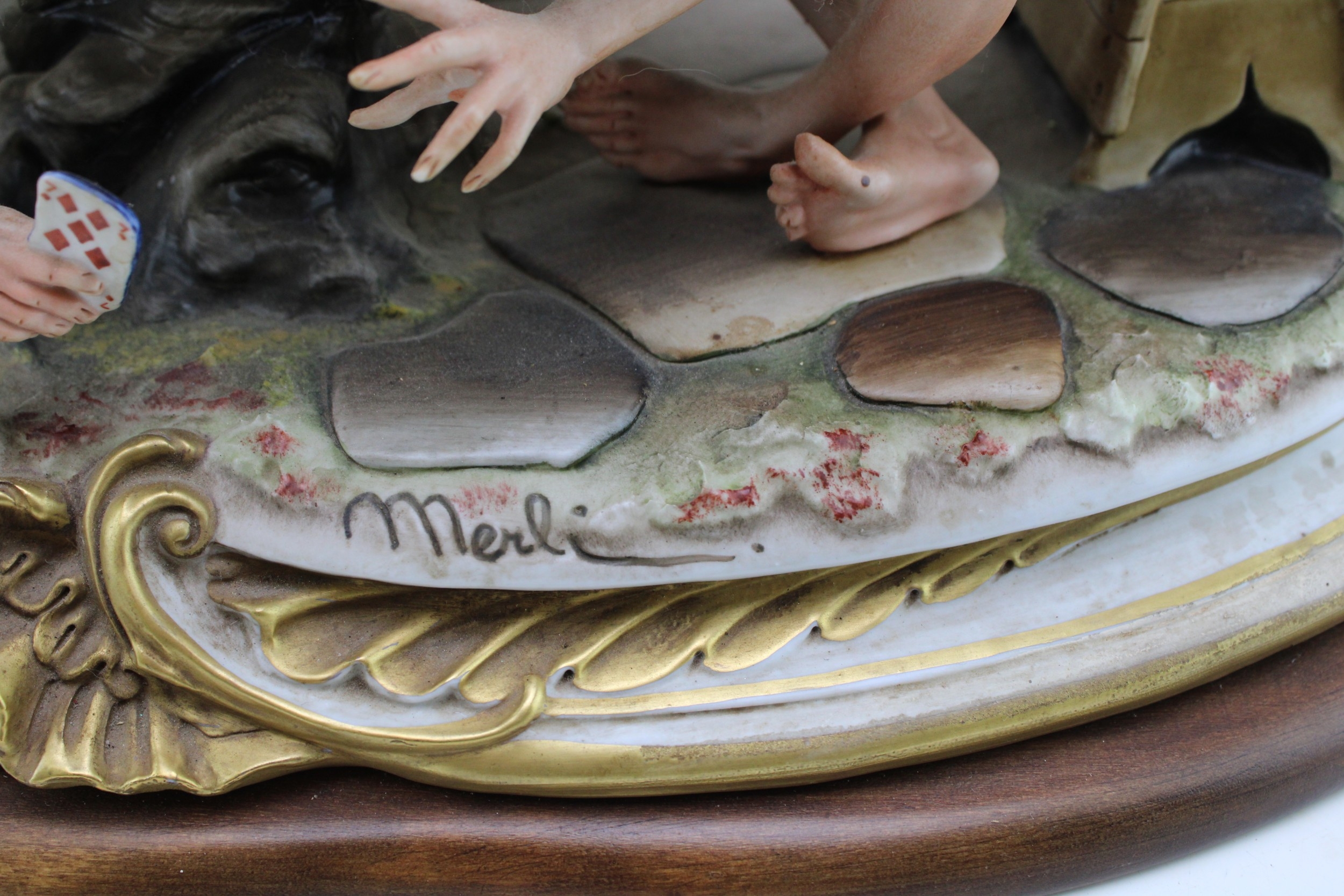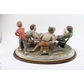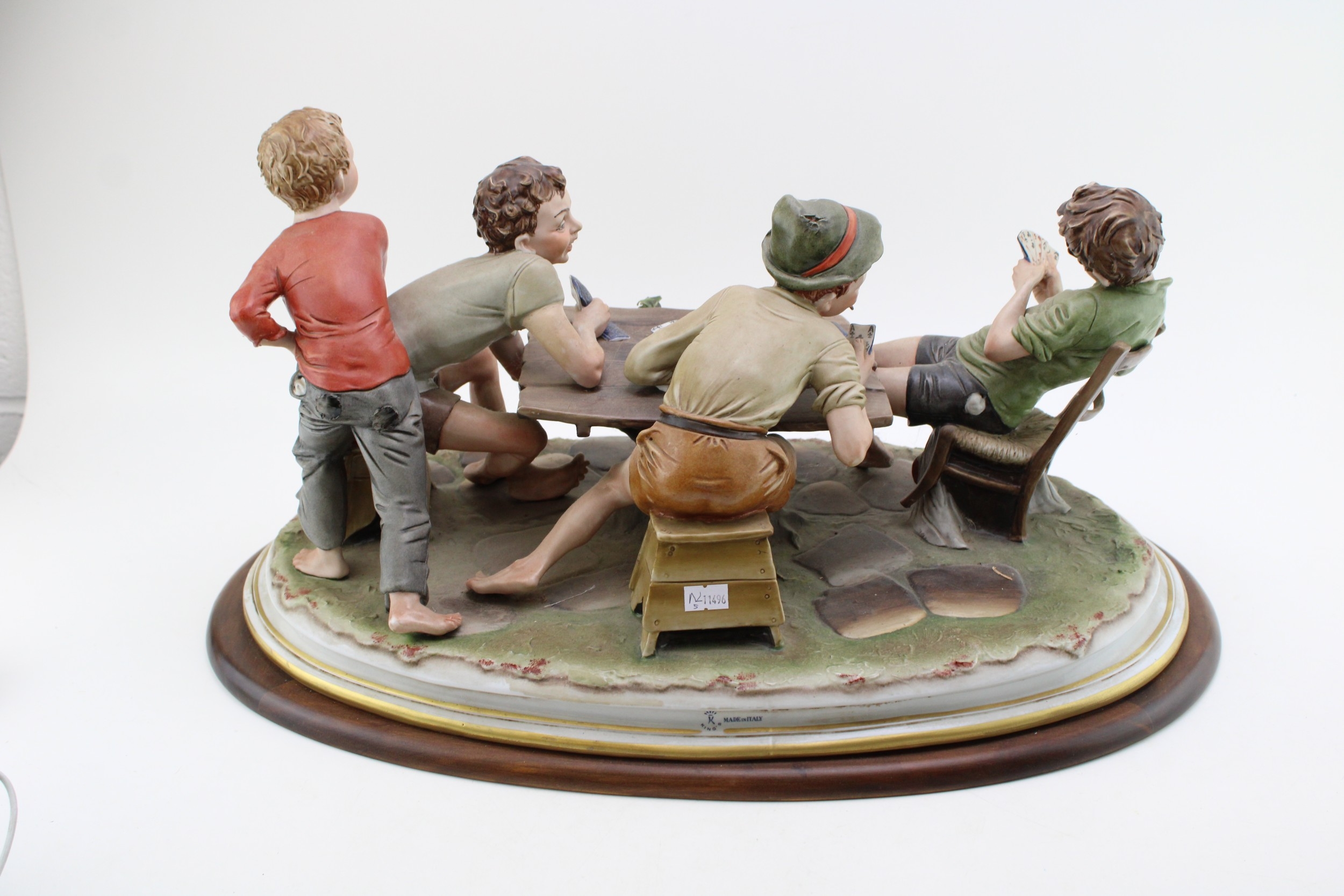 Capodimonte porcelain figure group, modelled as "The Cheats" by Bruno Merli, depicting four boys playing cards, raised on a wooden base, incised and painted marks, 55cm wide, collection preferred.