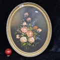 A charming original oil on oval board painting featuring a still life of garden roses and flowers. Rendered in confident broad brush strokes with lovely contrast against background. Signed 'A. Dakin' lower right and housed in a oval gilt frame.
