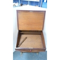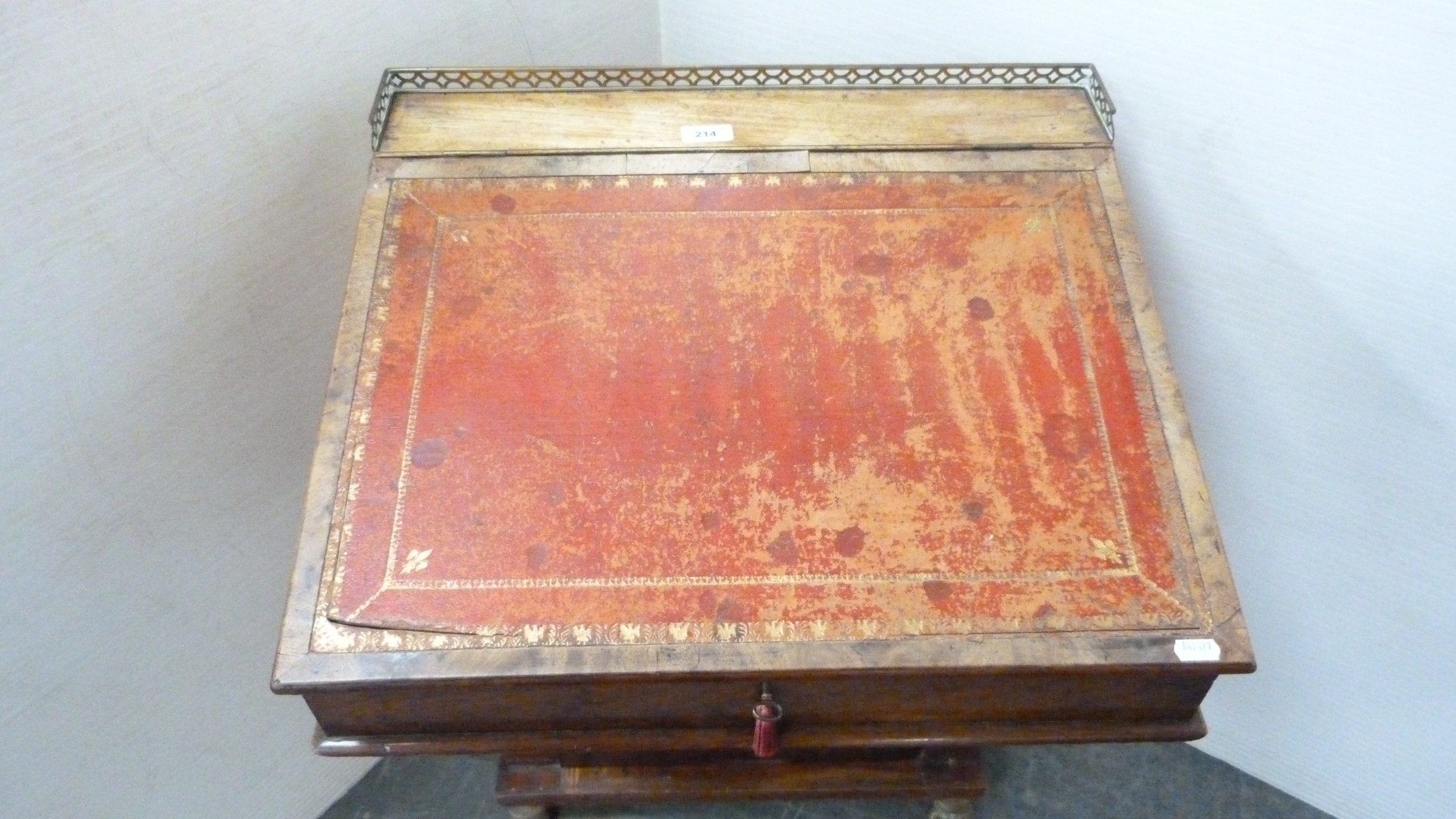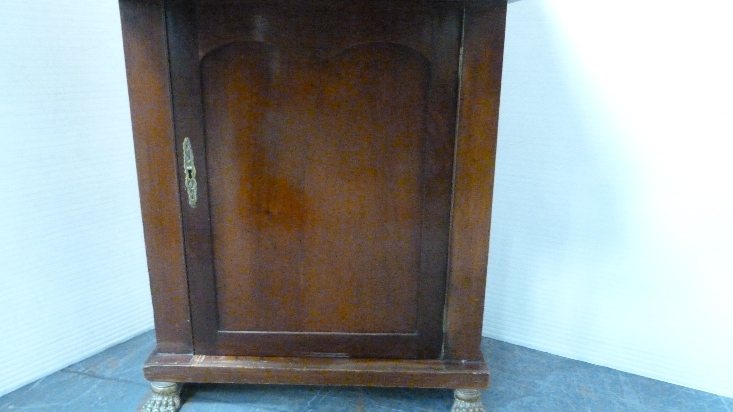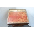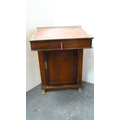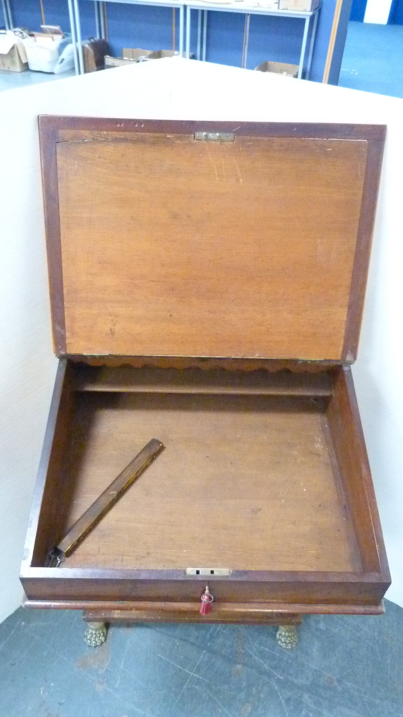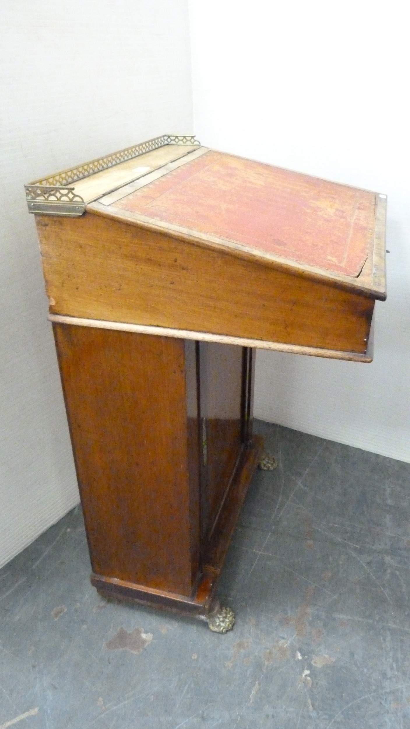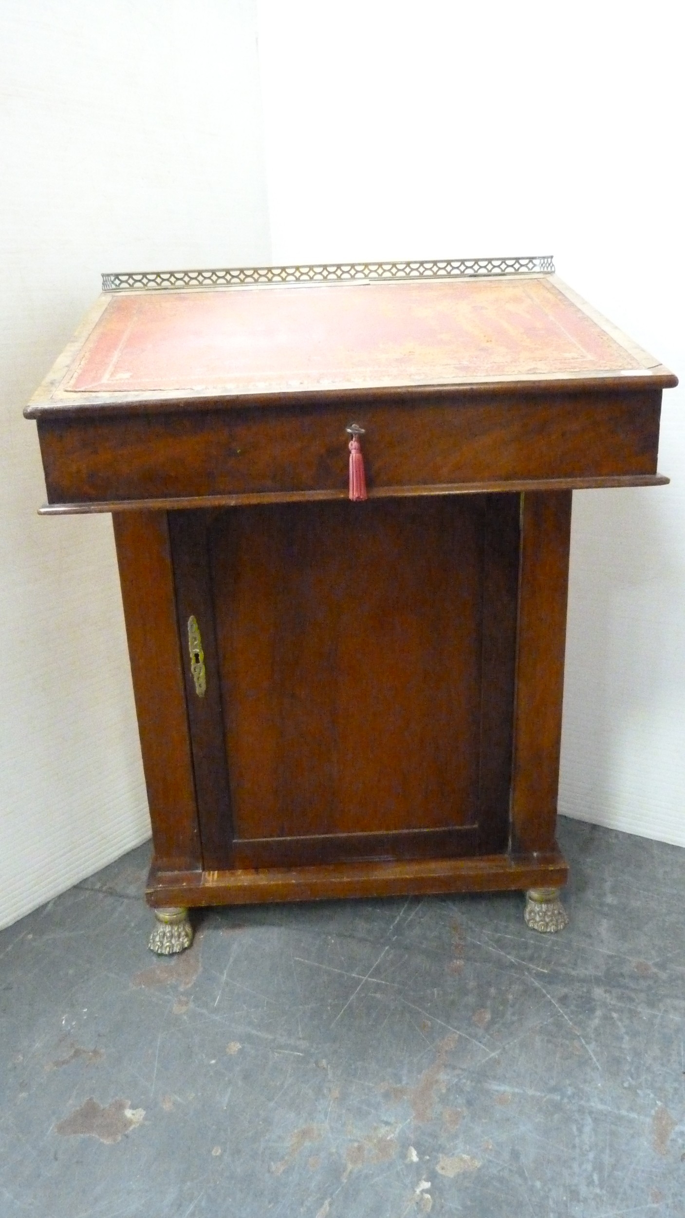 Victorian mahogany davenport with brass gallery rail and animal paw feet.