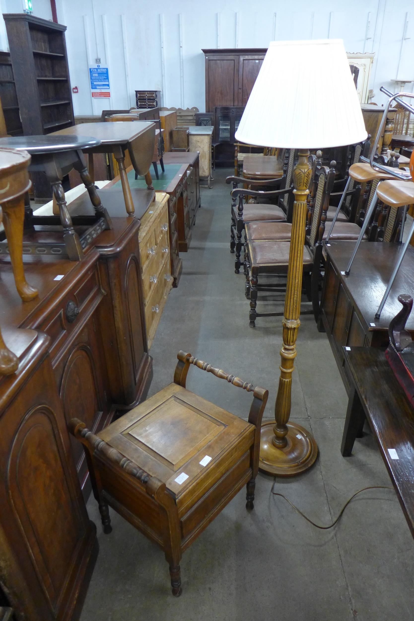 A carved oak standard lamp and a beech commode