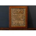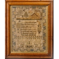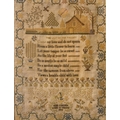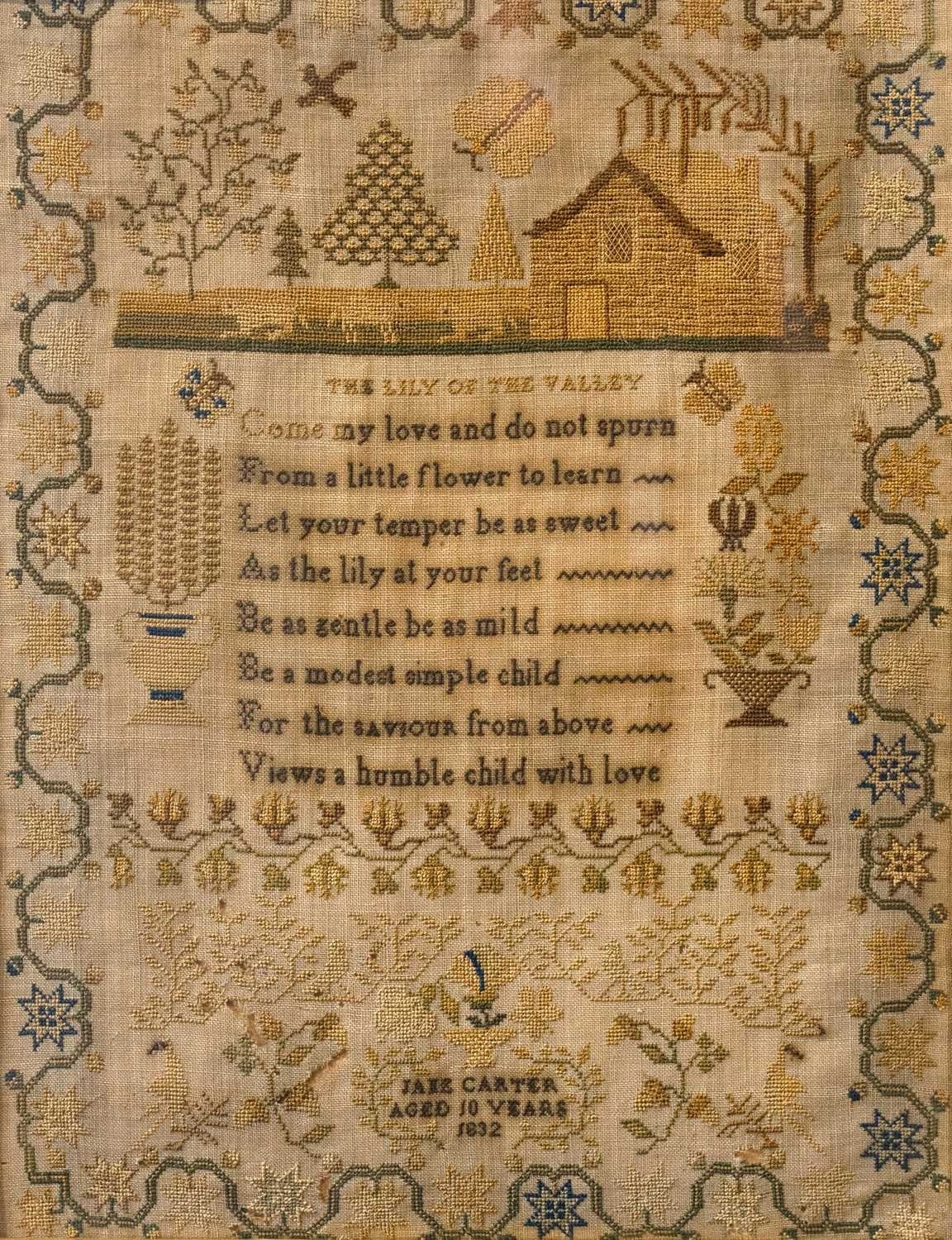 A William IV silkwork sampler by Jane Carter, aged 10 years, 1832. Worked with a trailing border, with a stone cottage, the wooded garden with three creatures, above a verse titled 'Lily of the Valley', 40 x 31cm, maple framed, 52.5 x 43cm.