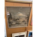 A Japanese framed print on silk of Mount Fuji etc with original label, Eveling-Tress Ltd, Rathbone Place London, W.I