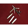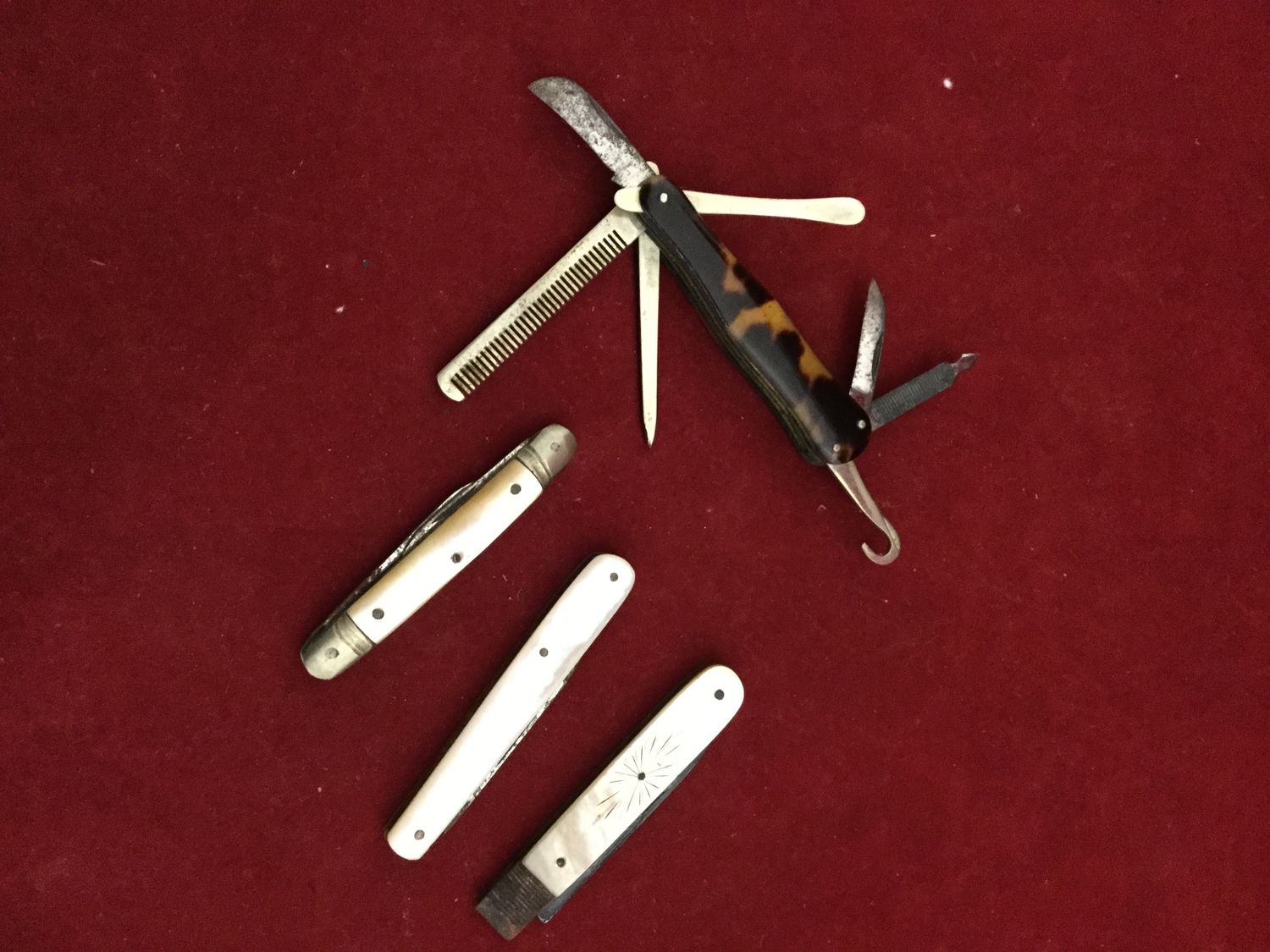pocket knife, with various blades, comb, ear scoop, etc., and three other pocket/fruit knives (4) -