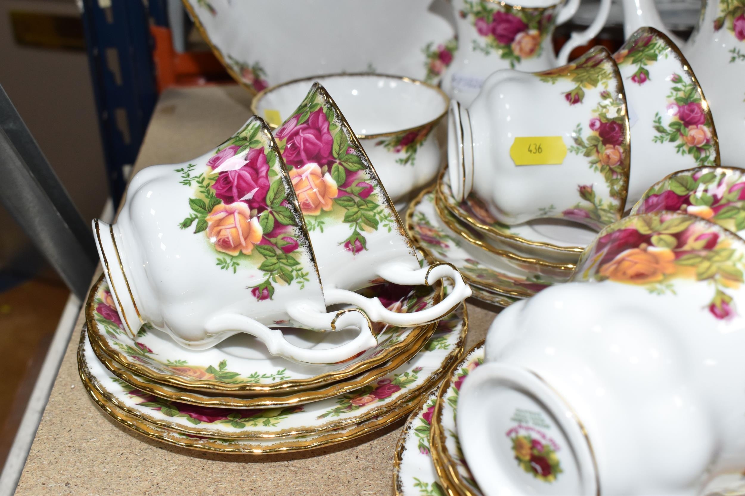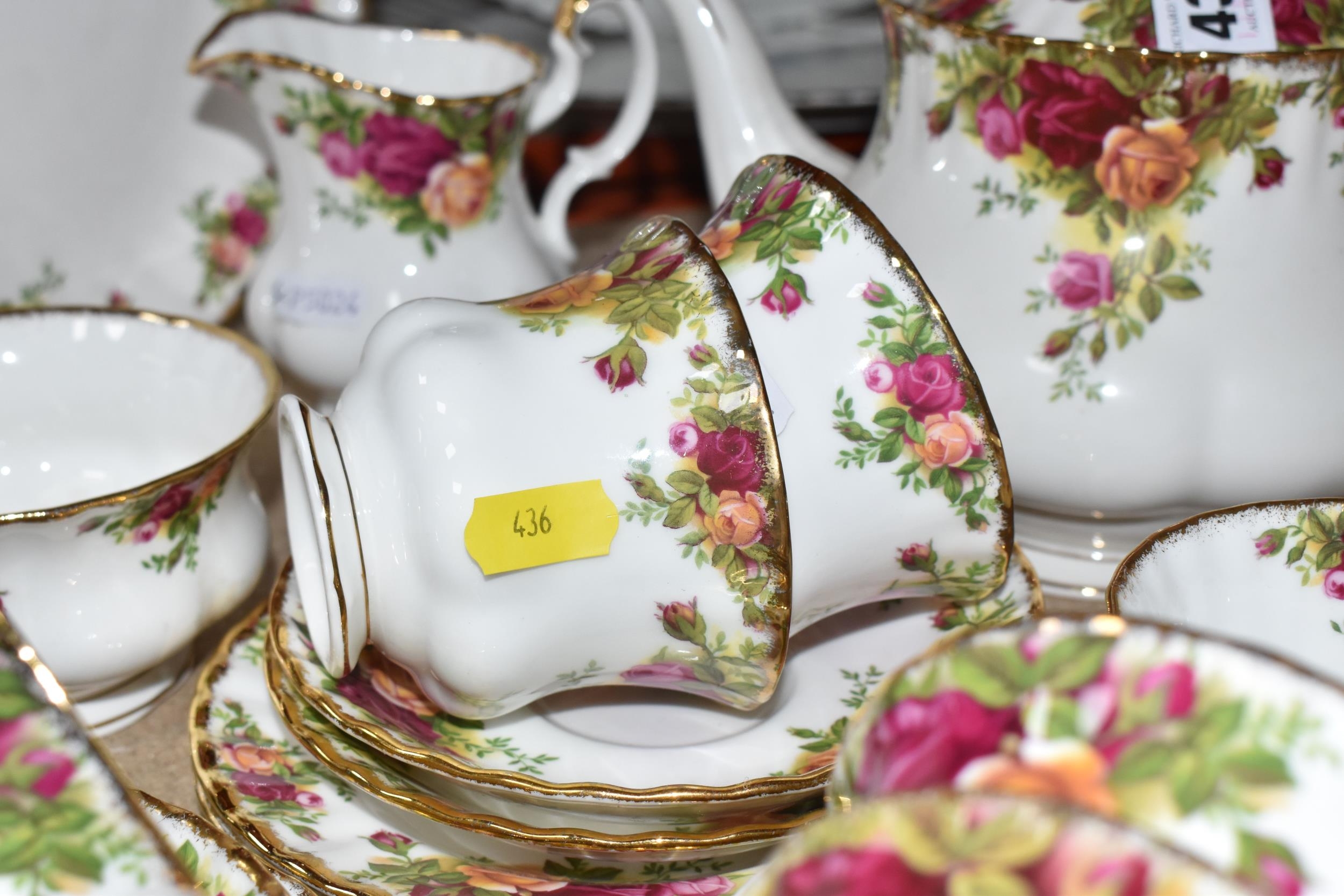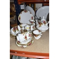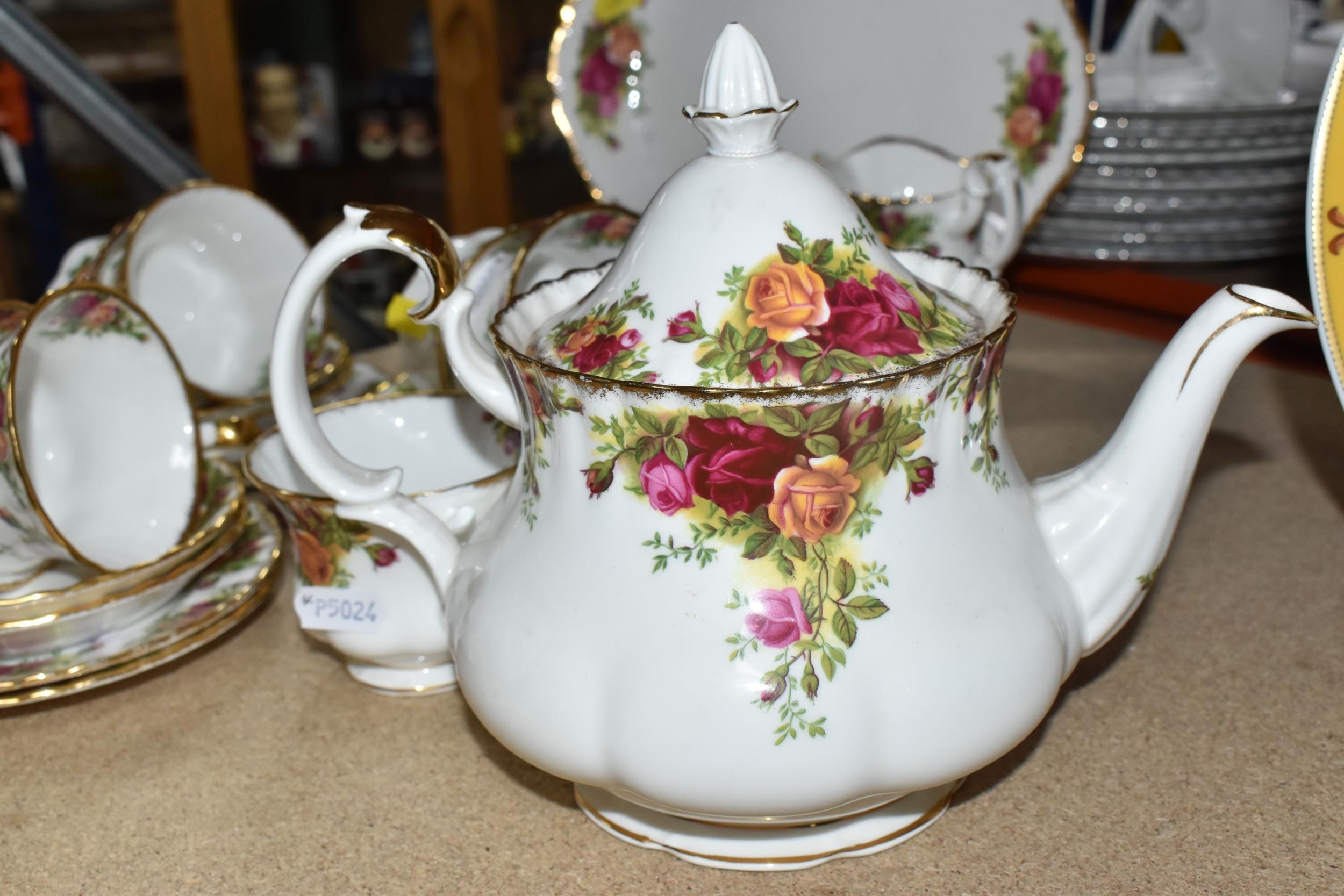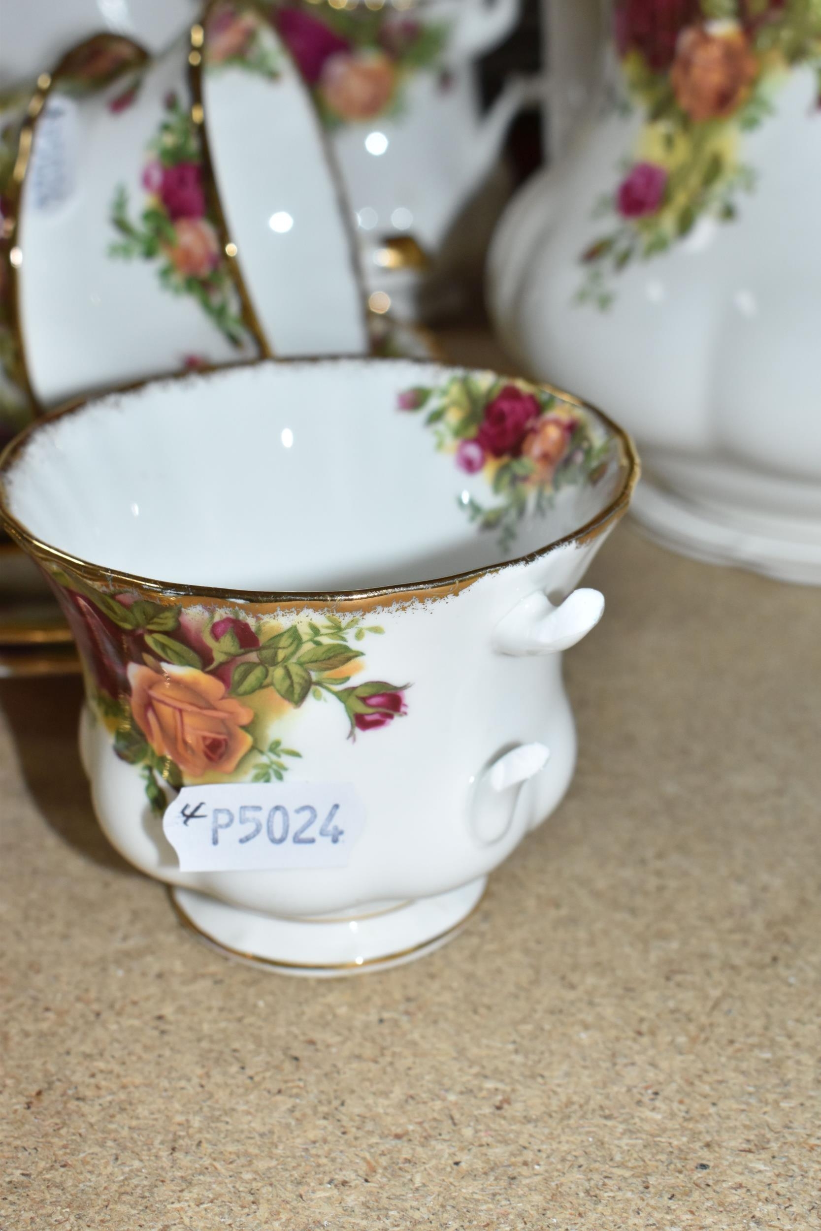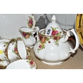A SMALL COLLECTION OF ROYAL ALBERT 'OLD COUNTRY ROSES' TEAWARE, comprising of, a cake plate, teapot, milk creamer, sugar bowl, six biscuit plates, seven cups, six saucers, (one cup the handle is broken off but present), (Condition Report: in ok condition signs of light use, would benefit from a clean), (23)