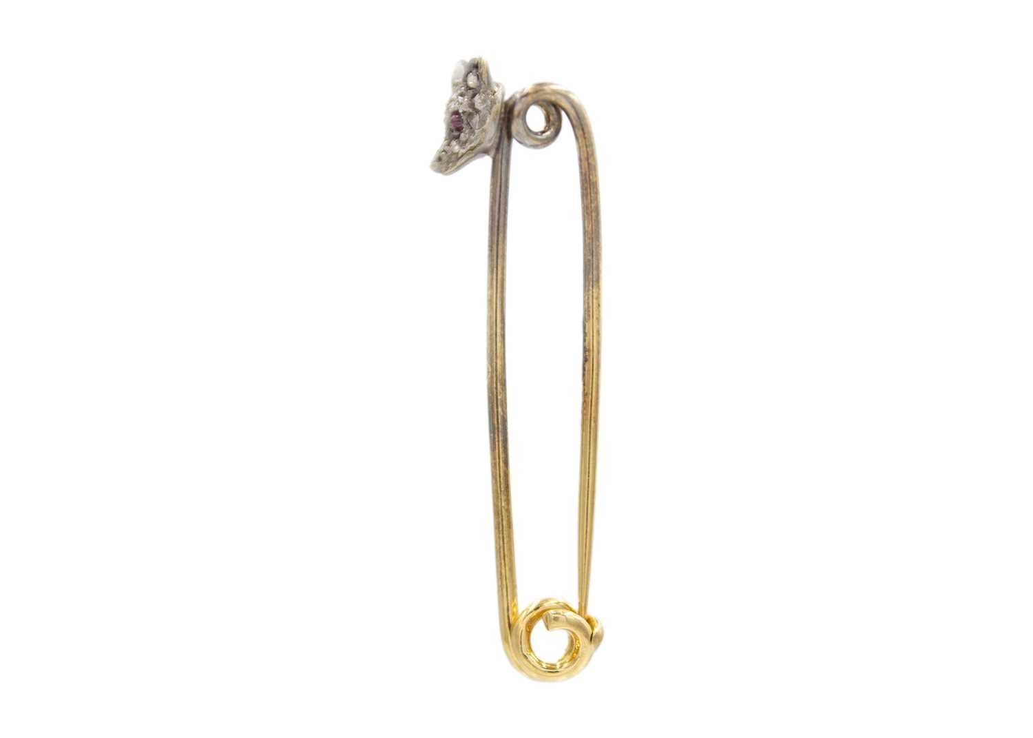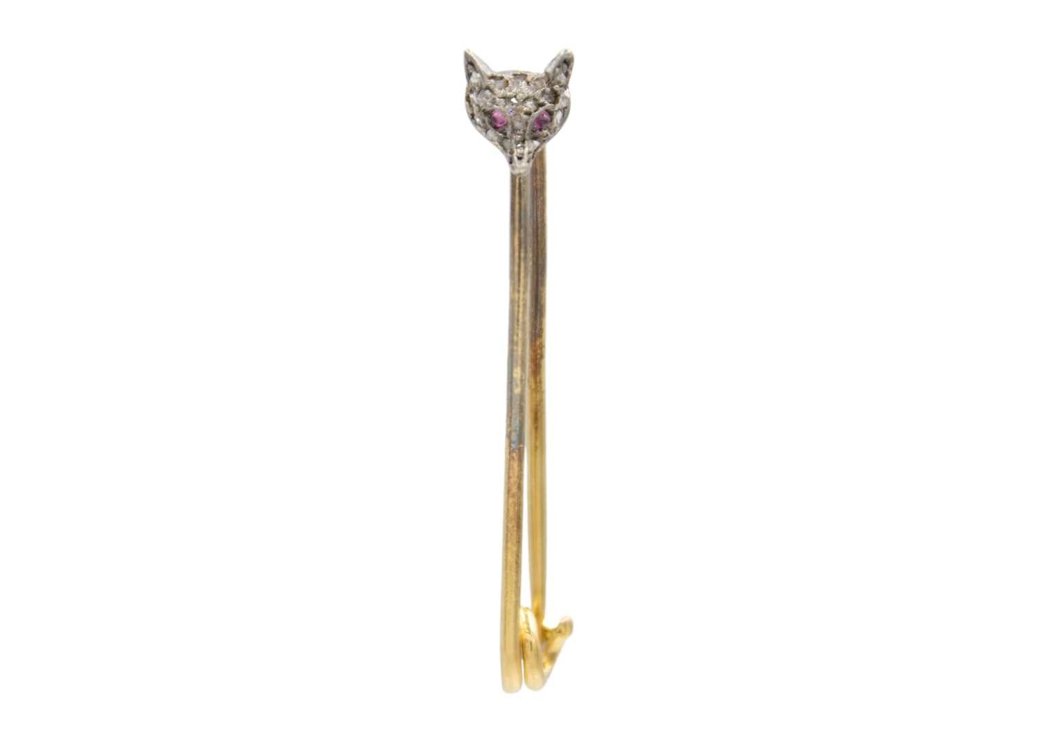 A high purity gold fox head diamond and ruby set pin. Decorated with rose-cut white tiny diamonds, ruby eyes, length 4cm, weight 2.75g. All stones are in place, tarnished on a metal, good used condition.