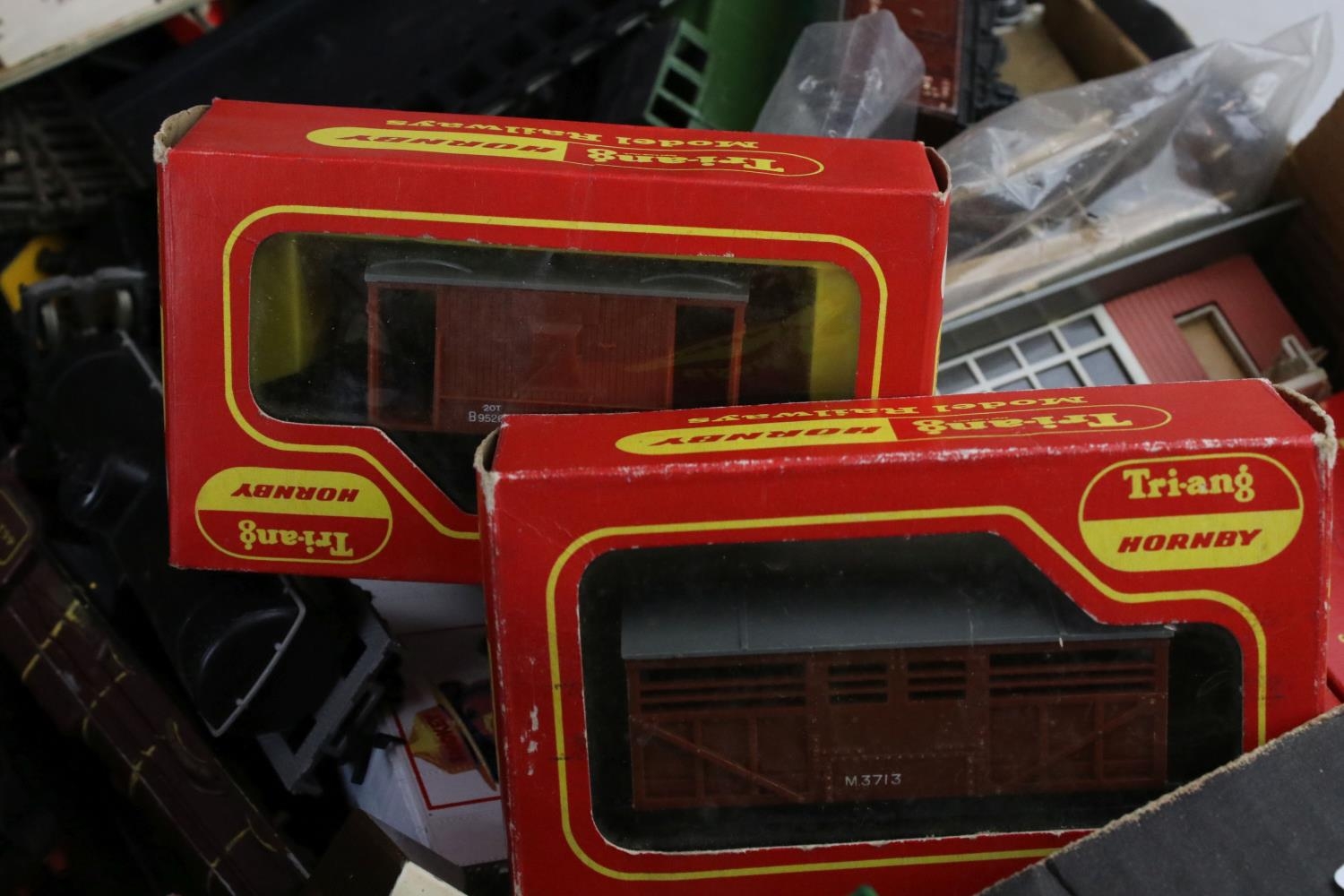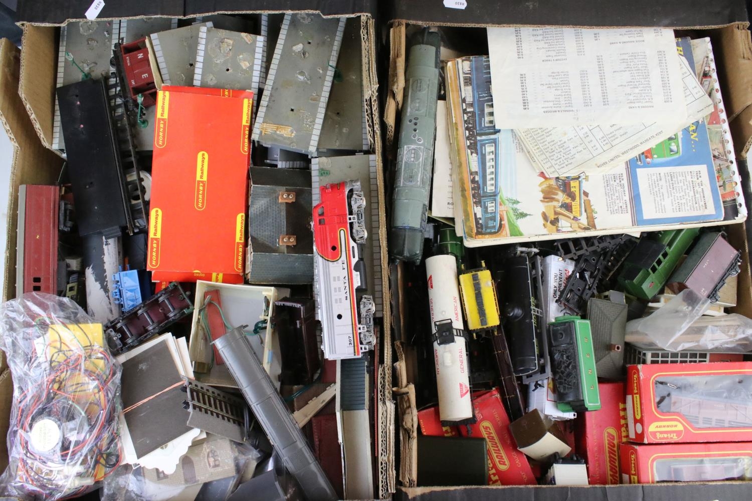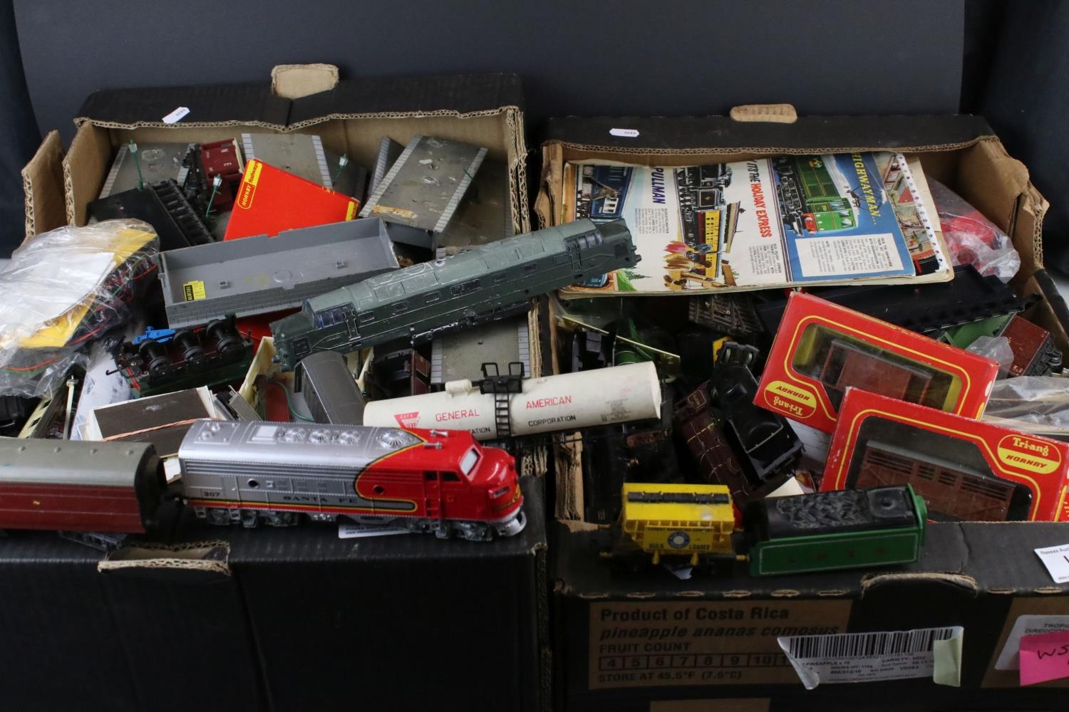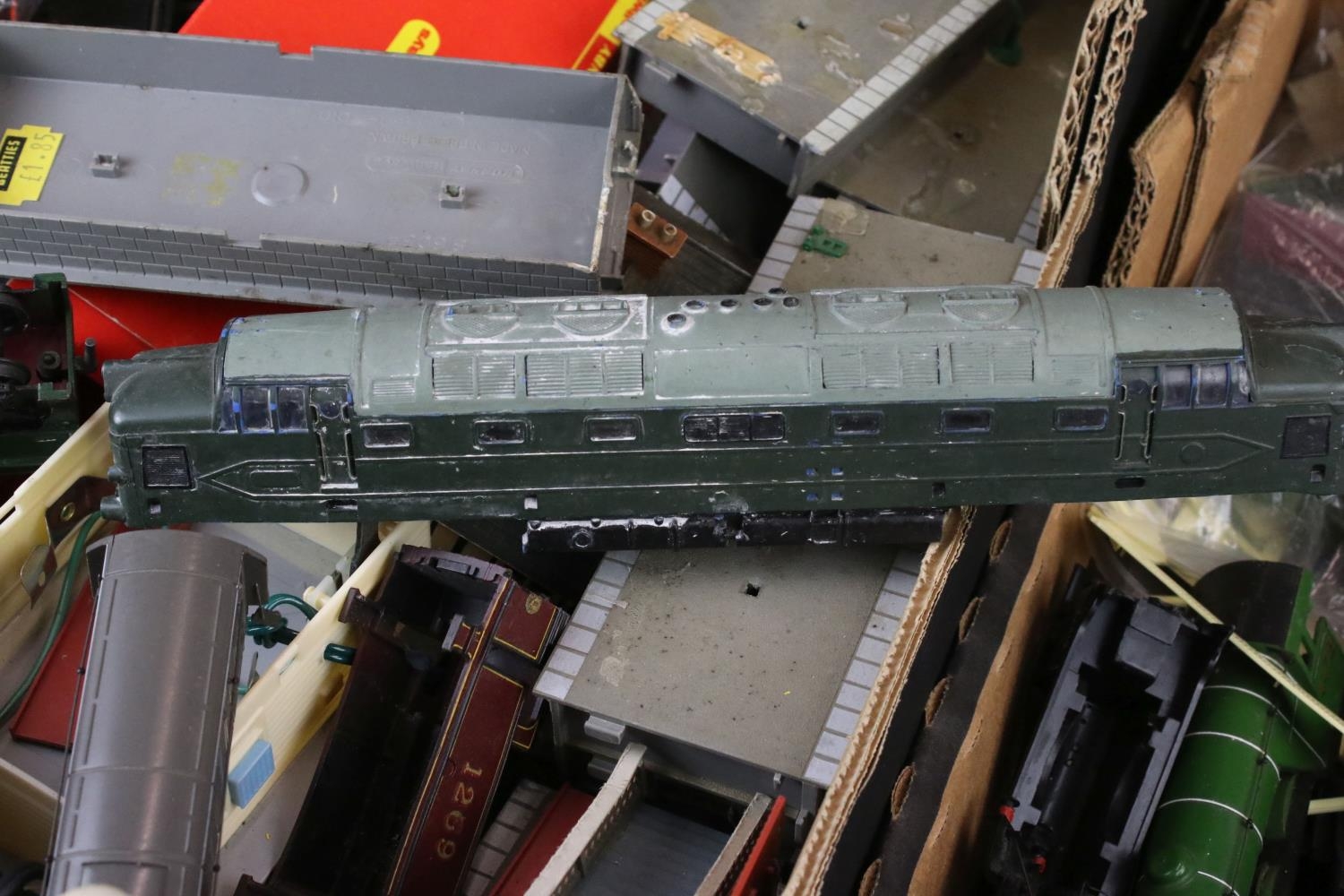 Collection of OO gauge model railway to include locomotives, various rolling stock, platform, boxed Triang Hornby rolling stock etc, some model kit made (two boxes)