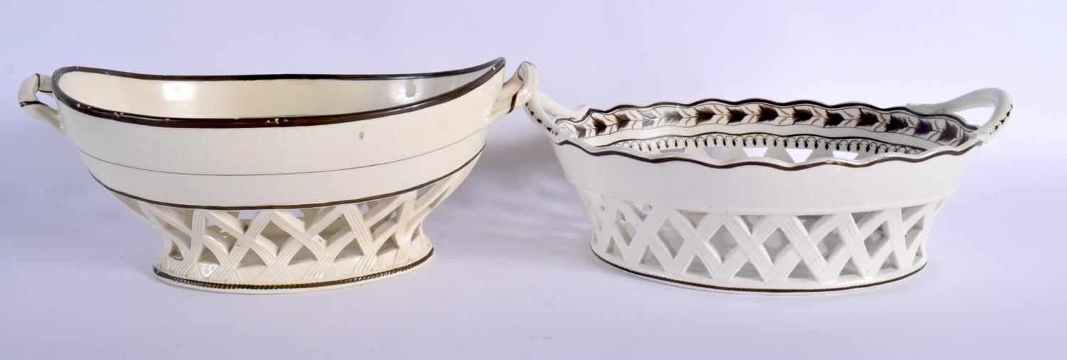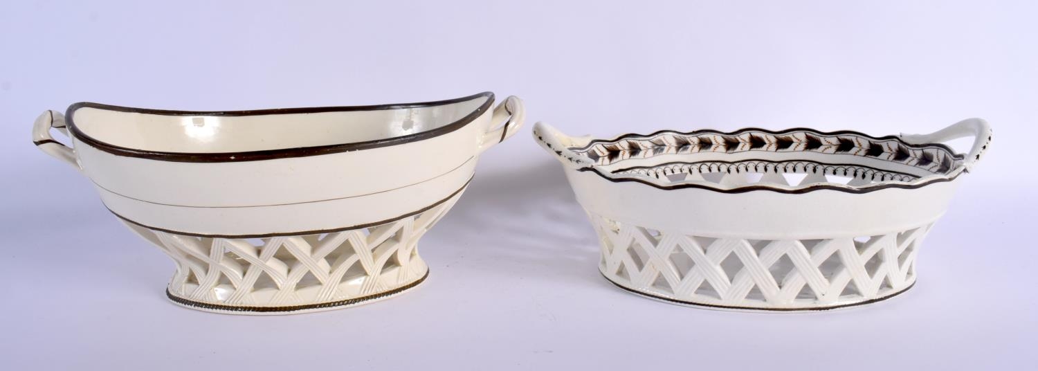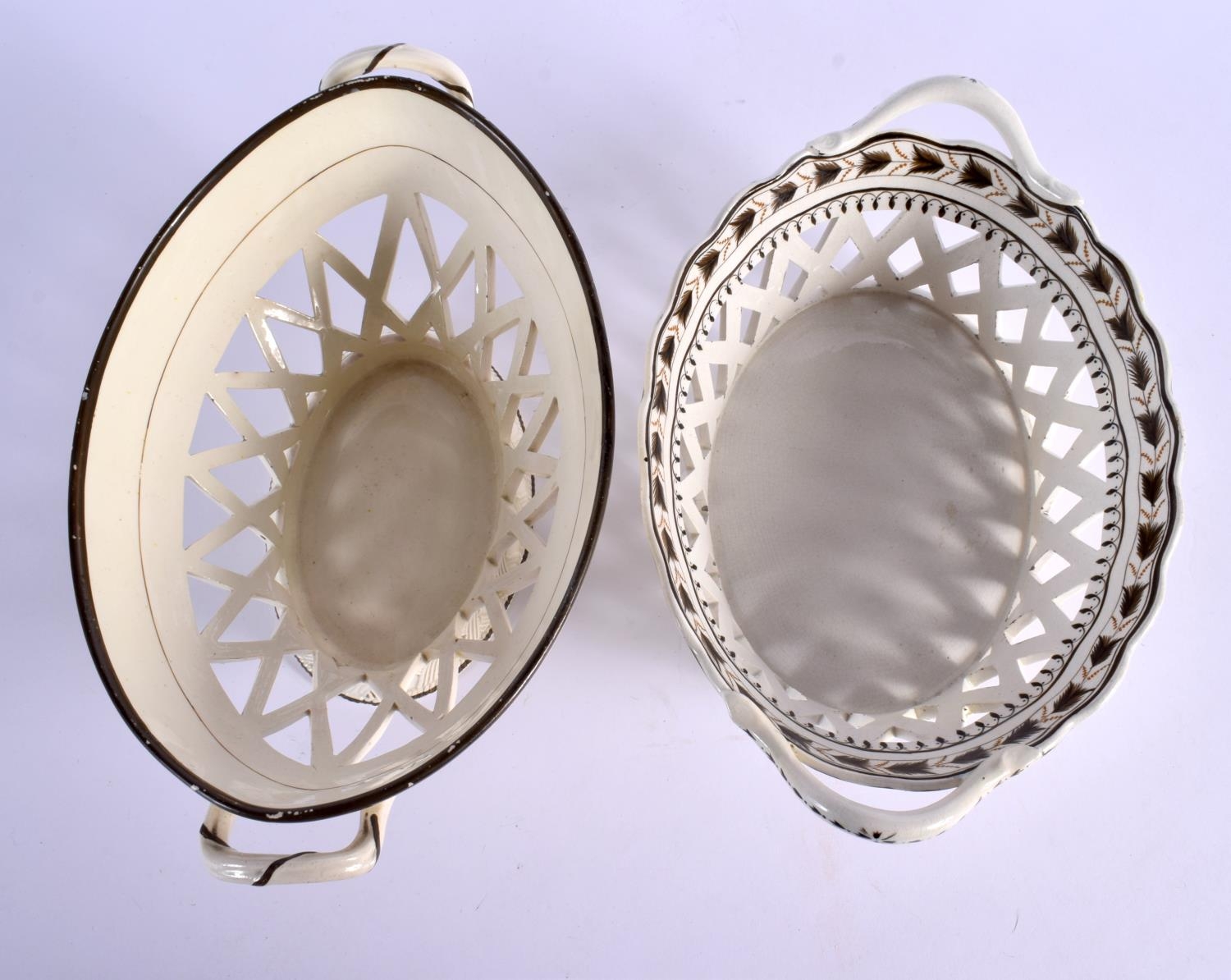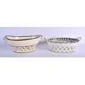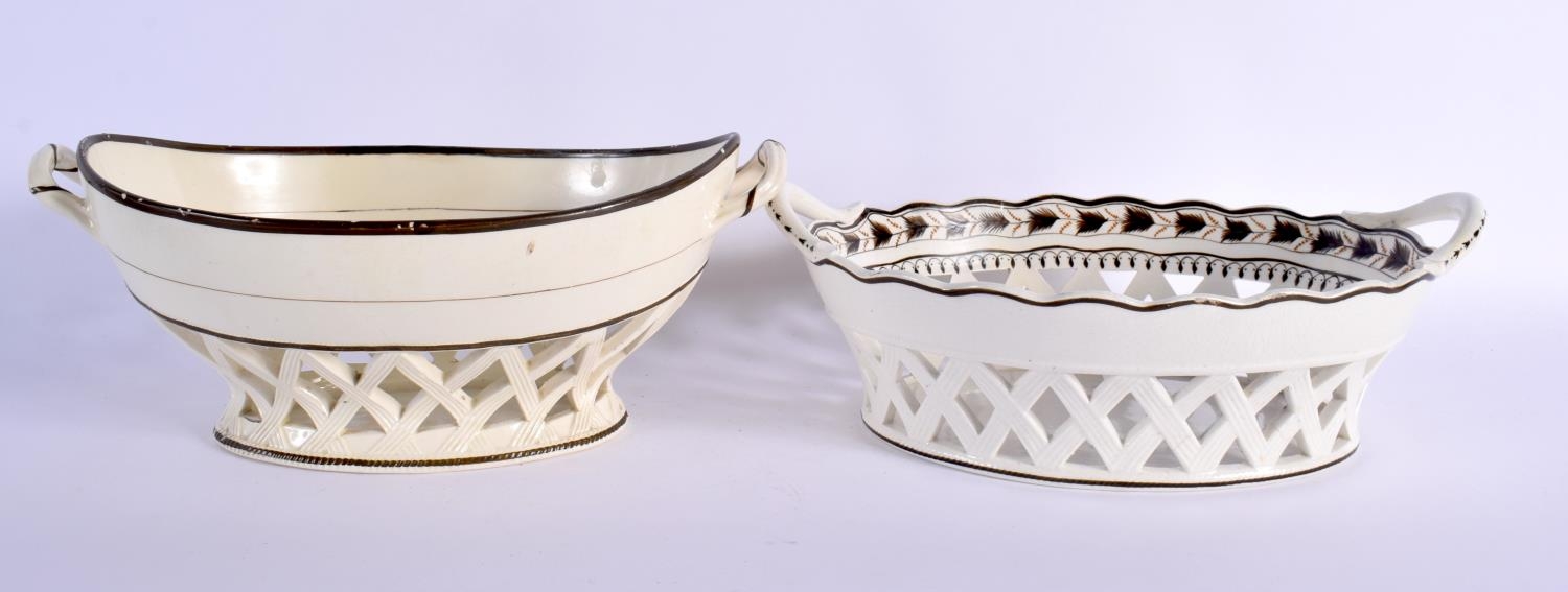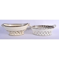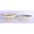 TWO LATE 18TH CENTURY LEEDS & WEDGWOOD BASKETS ON STANDS with acorn decoration. Largest 24 cm x 14 cm. (4)