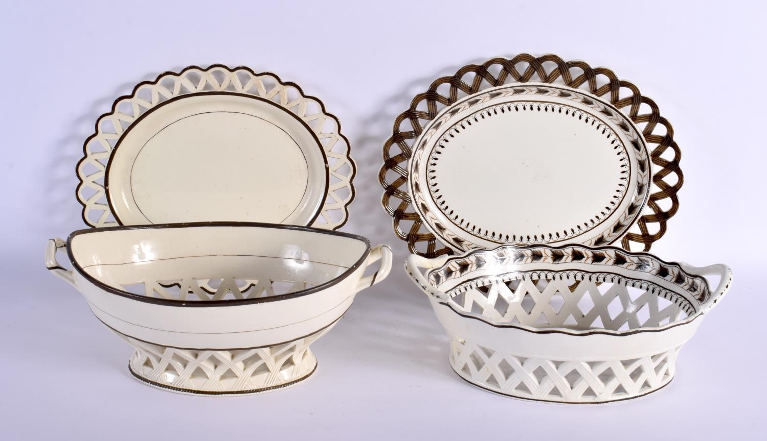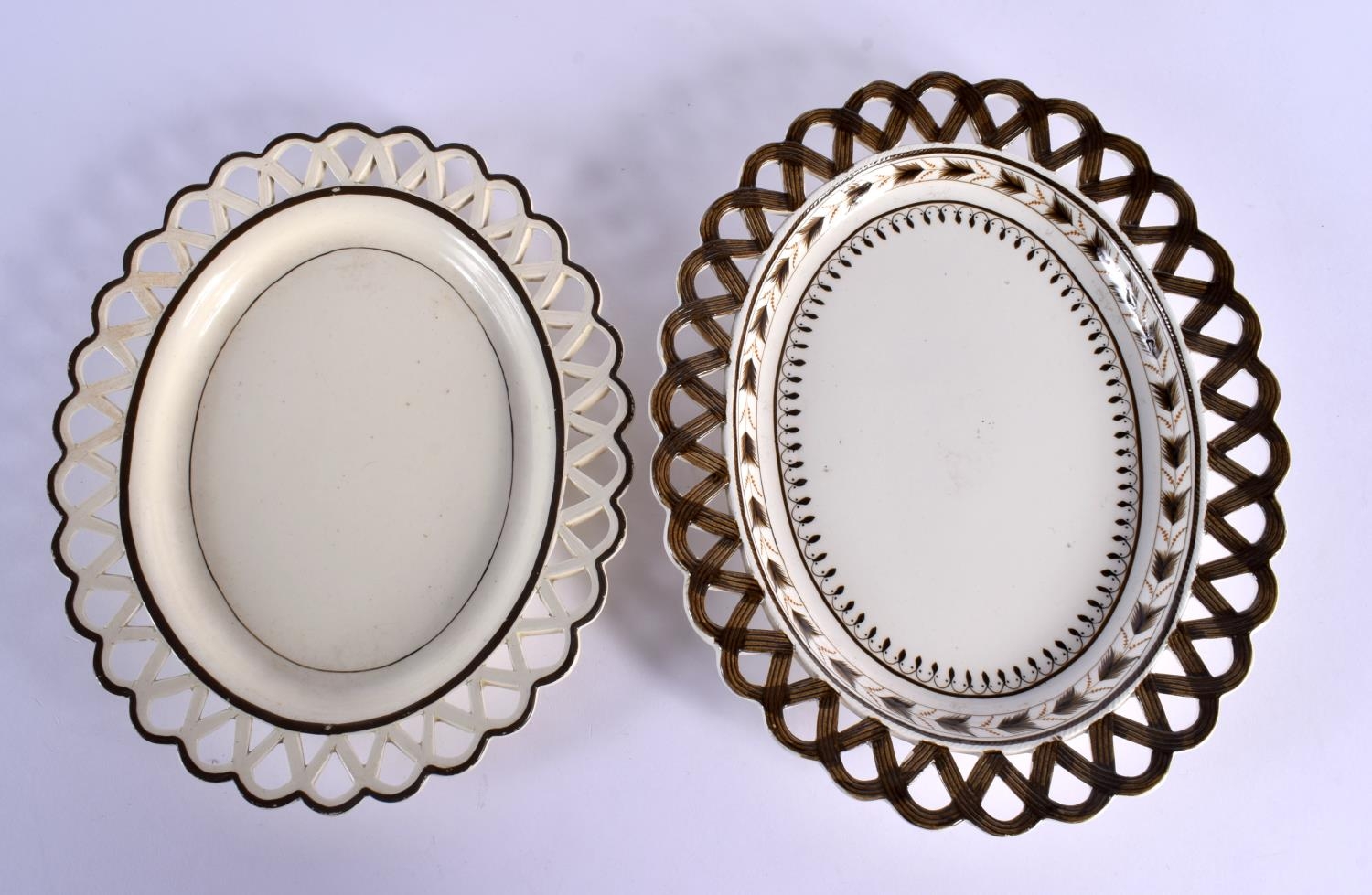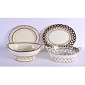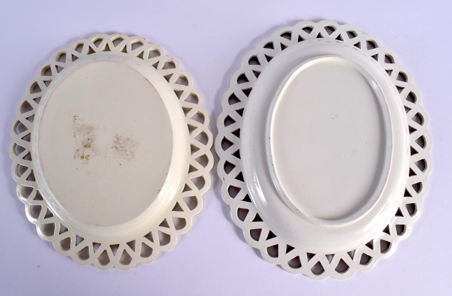 TWO LATE 18TH CENTURY LEEDS & WEDGWOOD BASKETS ON STANDS with acorn decoration. Largest 24 cm x 14 cm. (4)