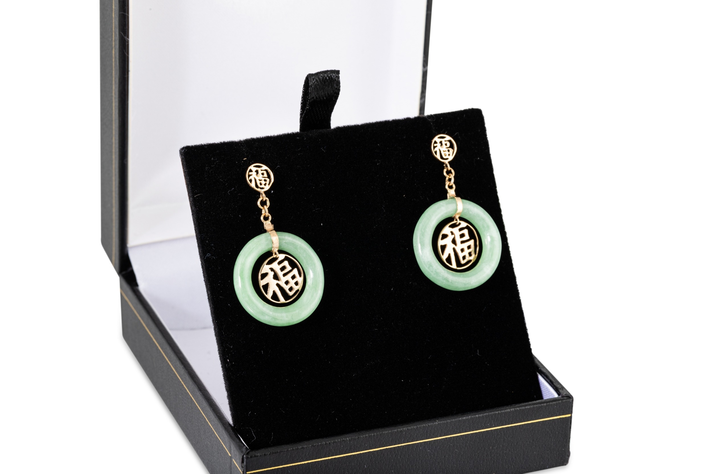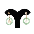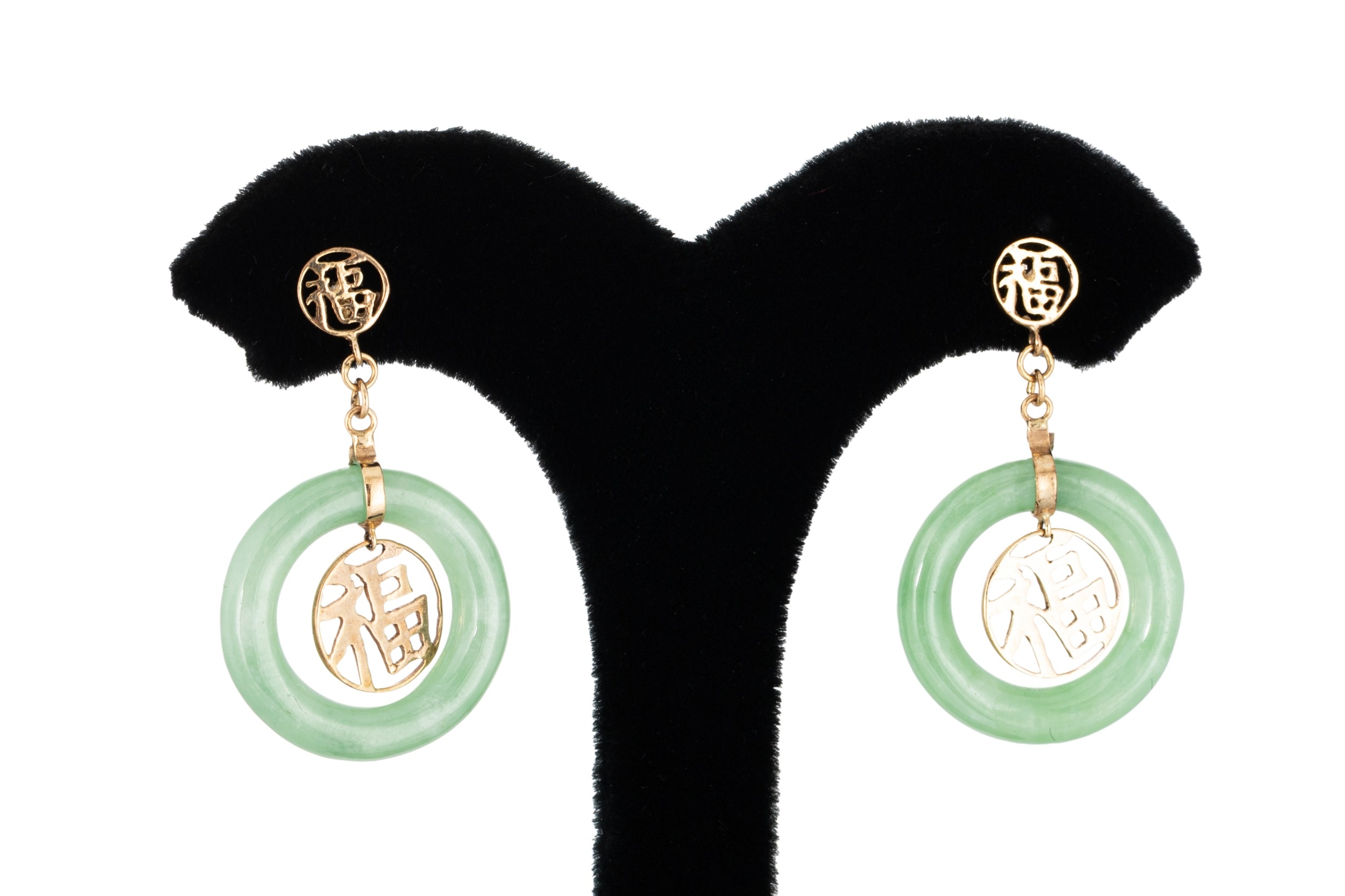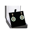 A PAIR OF JADE SET DROP EARRINGS, with jade donut cabochons mounted in 14ct yellow gold