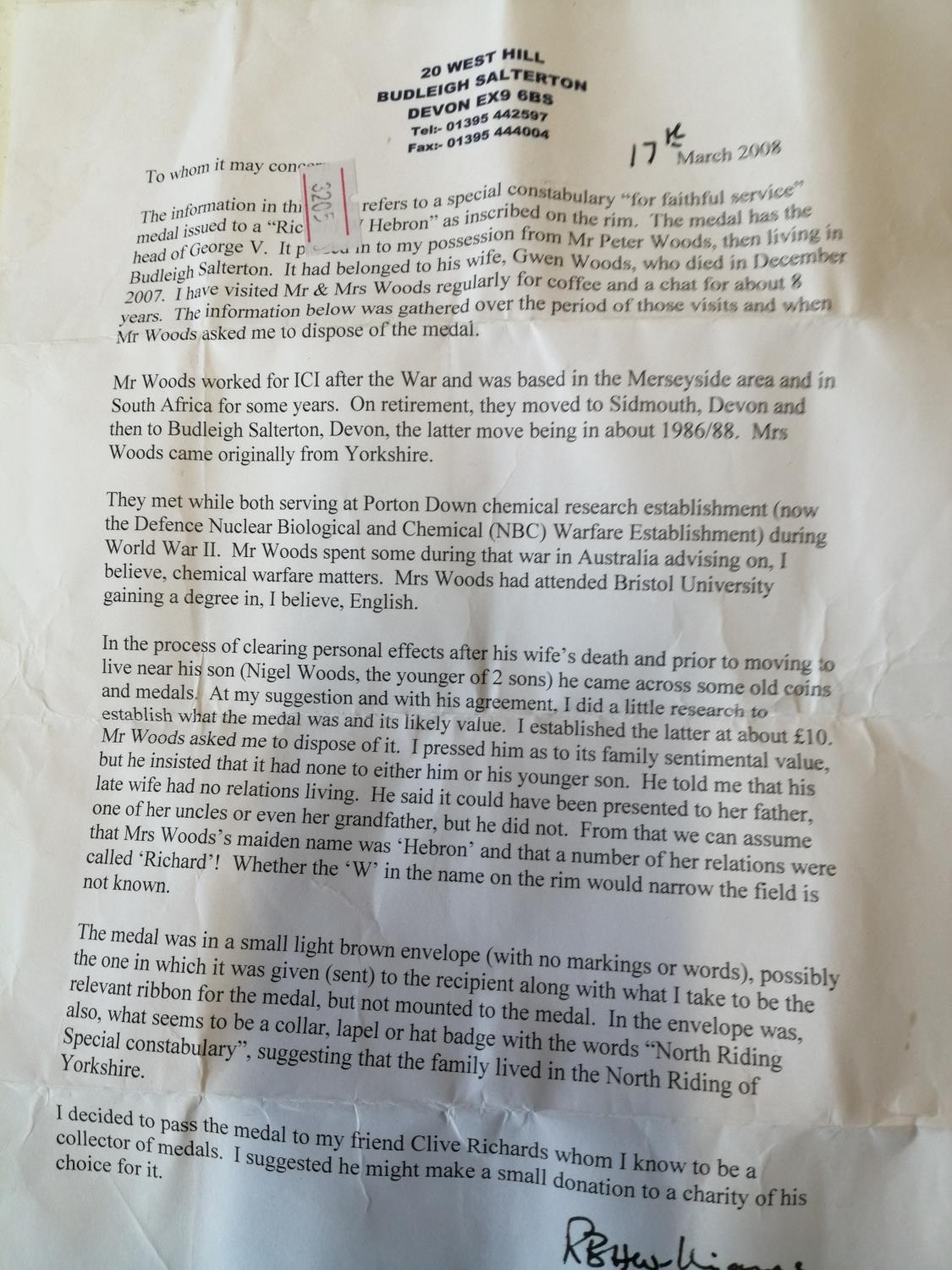 Various military interest medals : Special Constable Medal awarded to Richard W Hebron